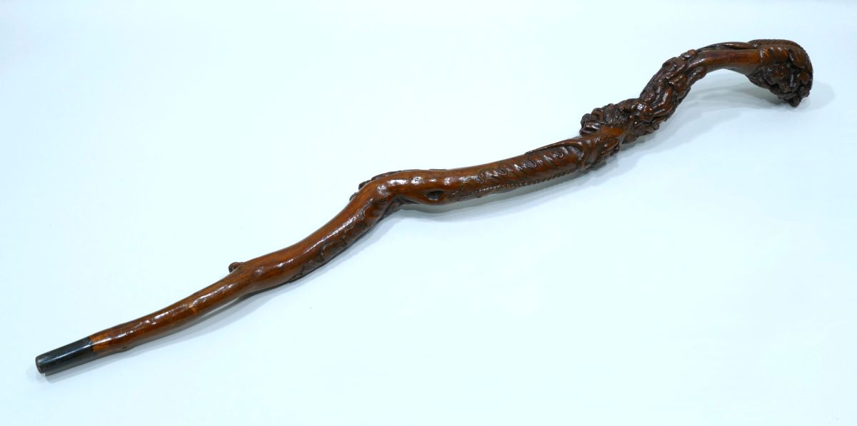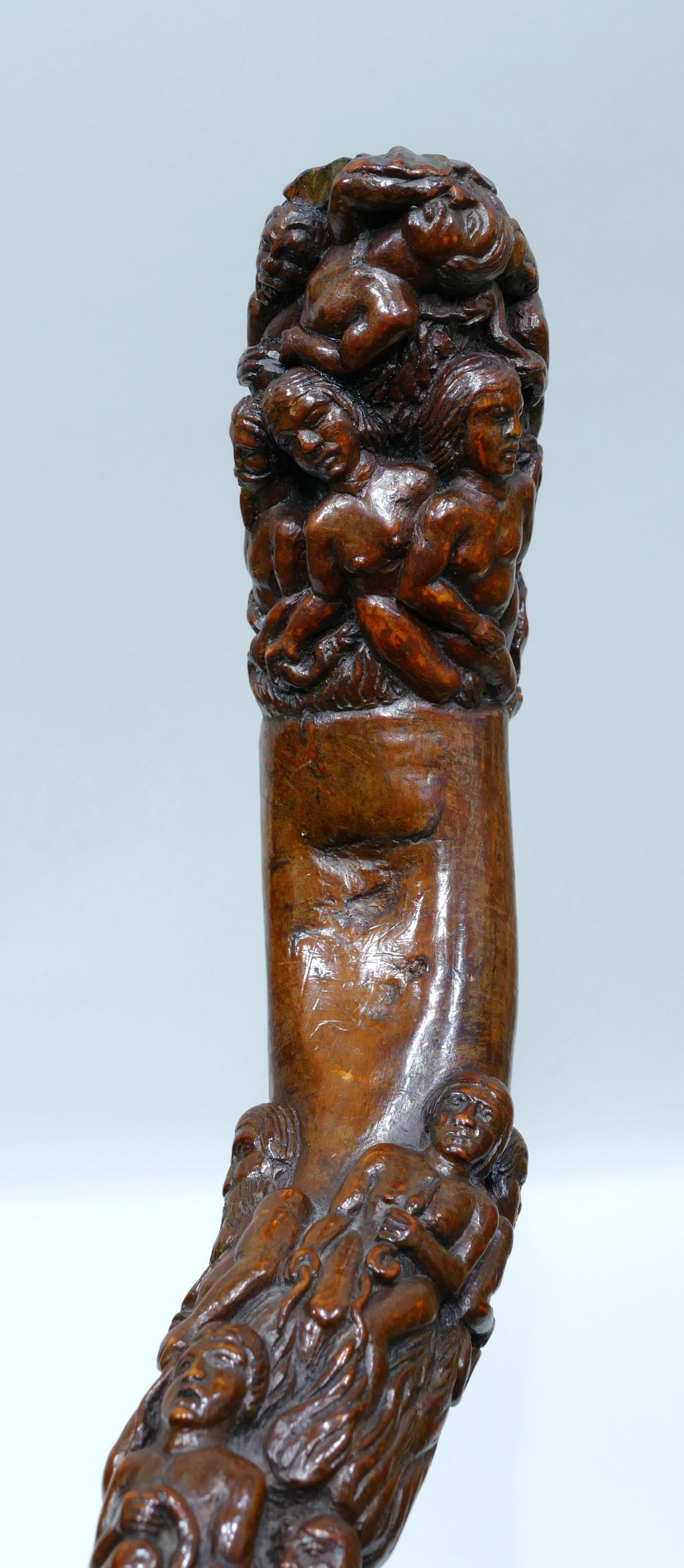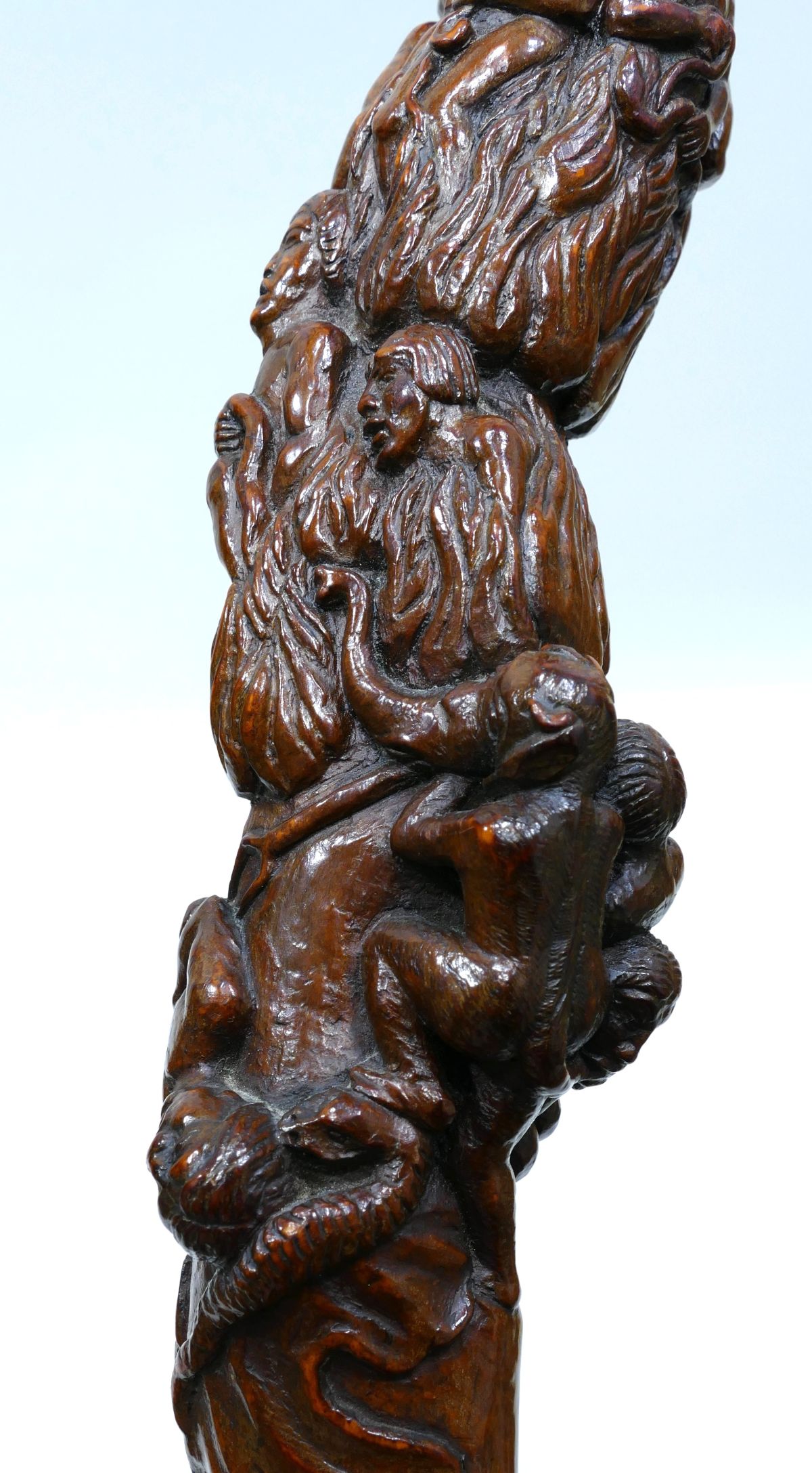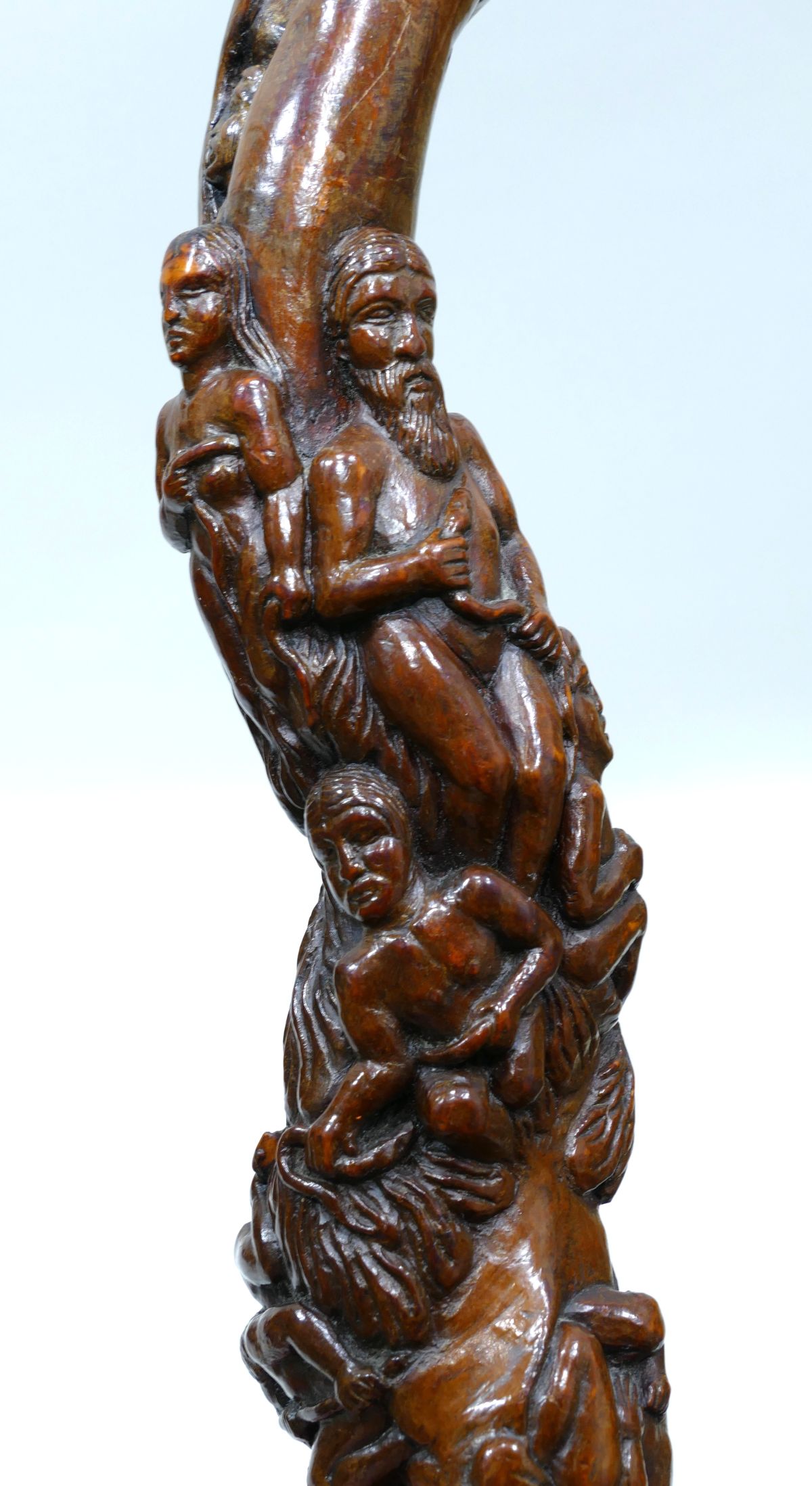 Exceptionnelle canne d’art populaire en buis monoxyle sculpté sur toute sa longueur avec personnages et feuilles de chêne :