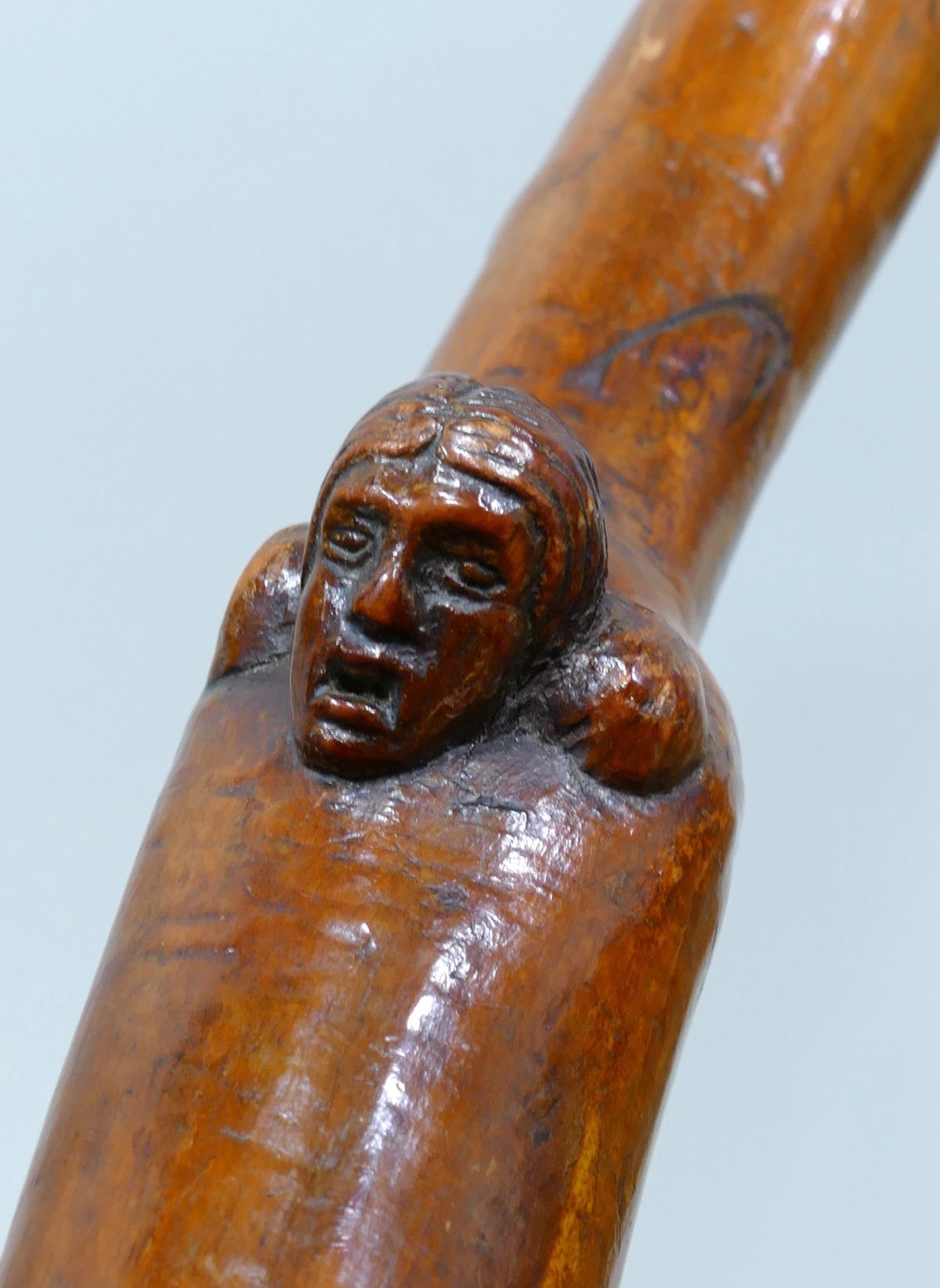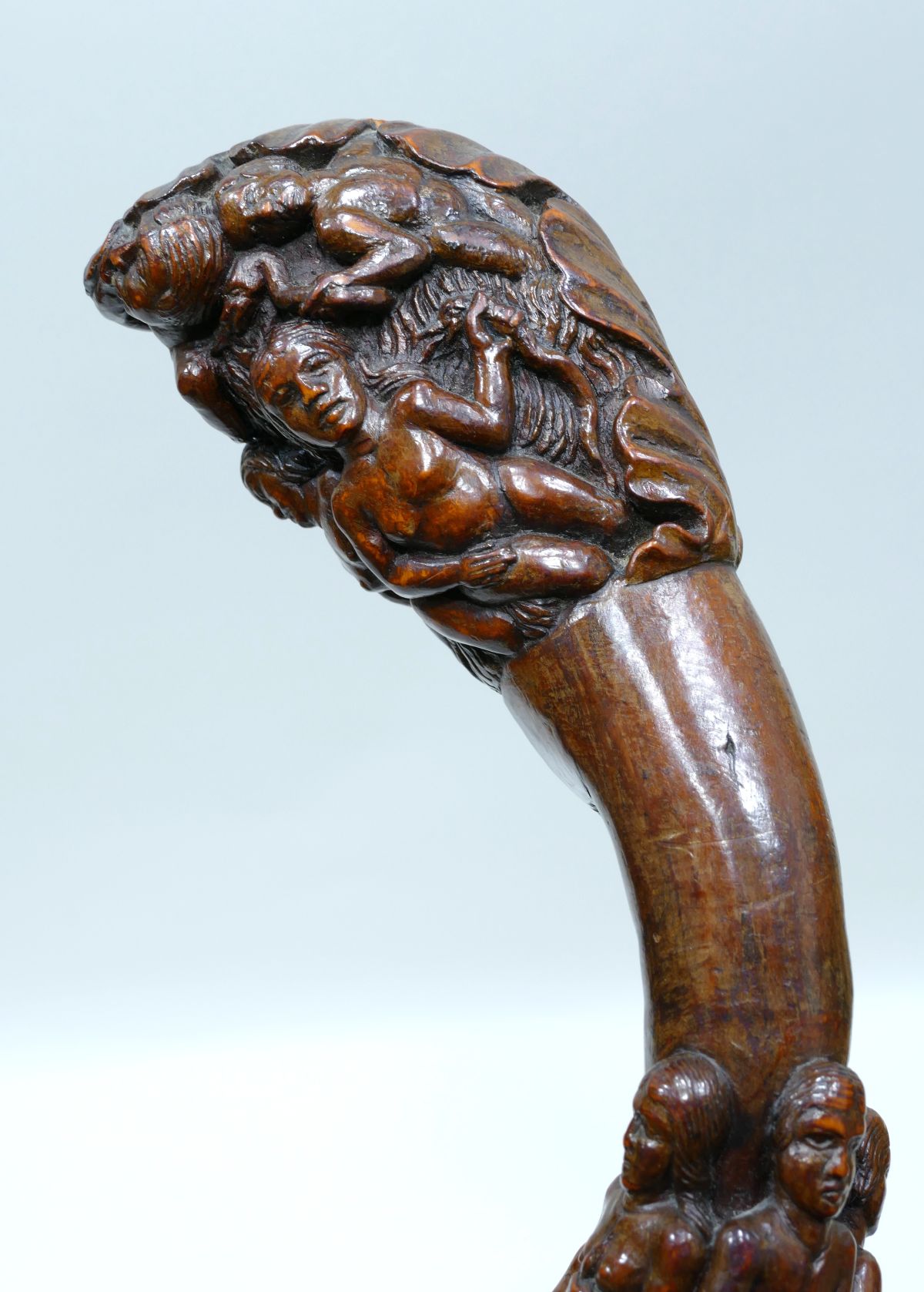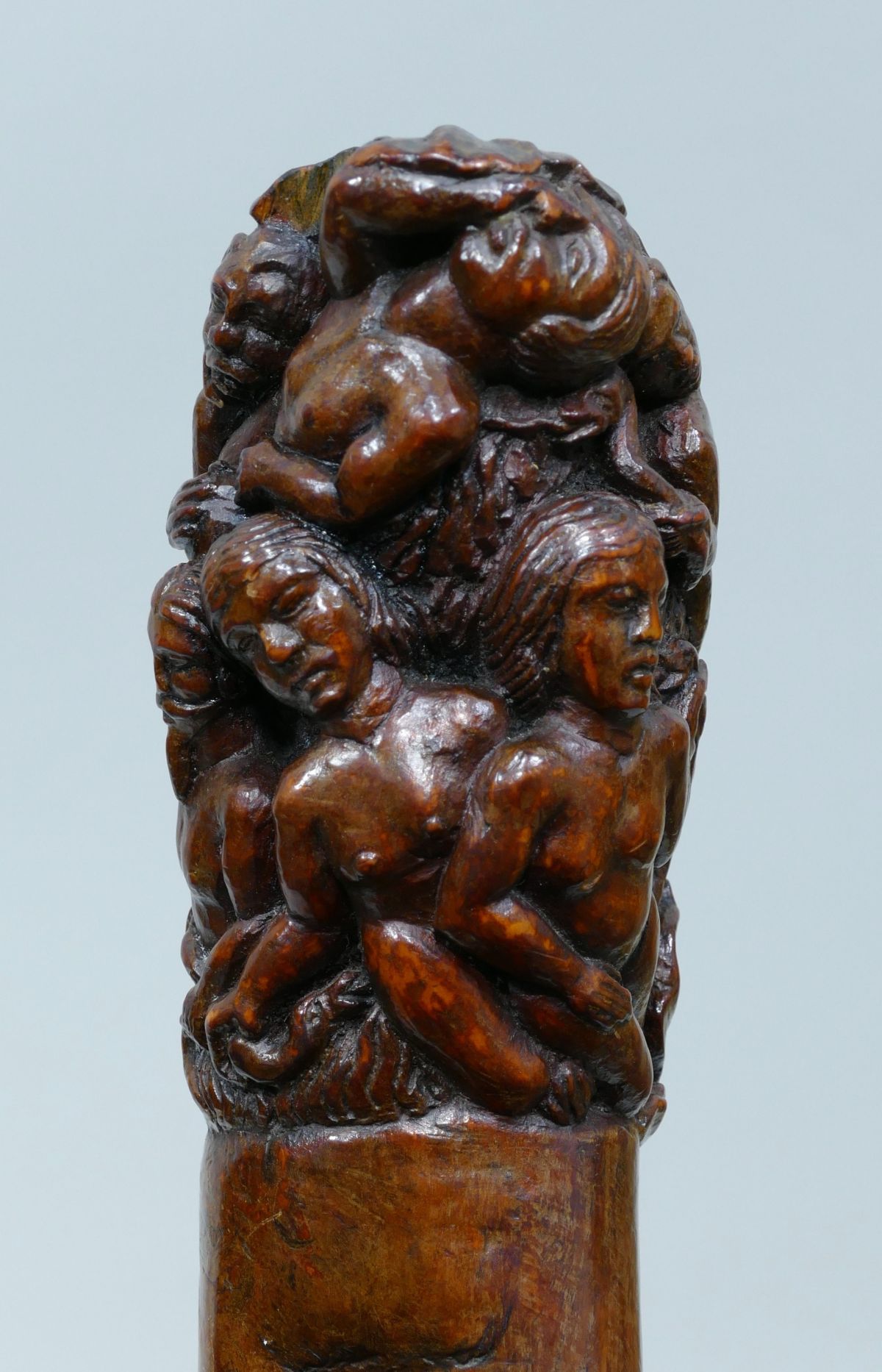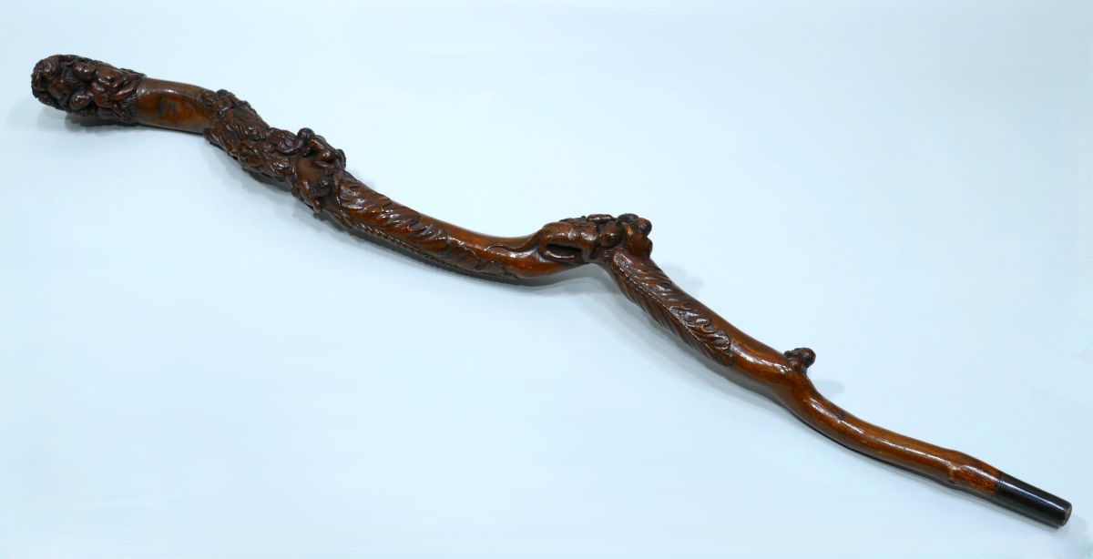 Exceptionnelle canne d’art populaire en buis monoxyle sculpté sur toute sa longueur avec personnages et feuilles de chêne :