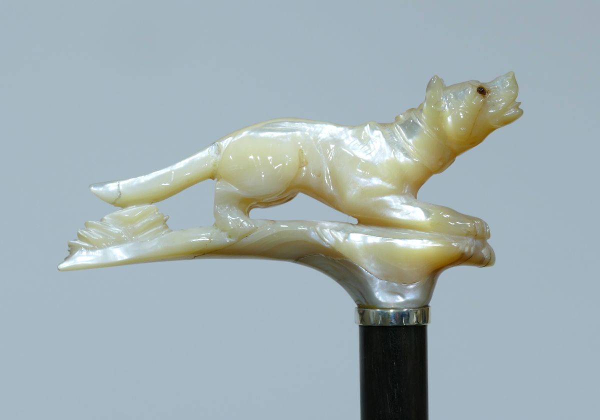 Canne de collection avec rare pommeau en nacre sur le thème du chien