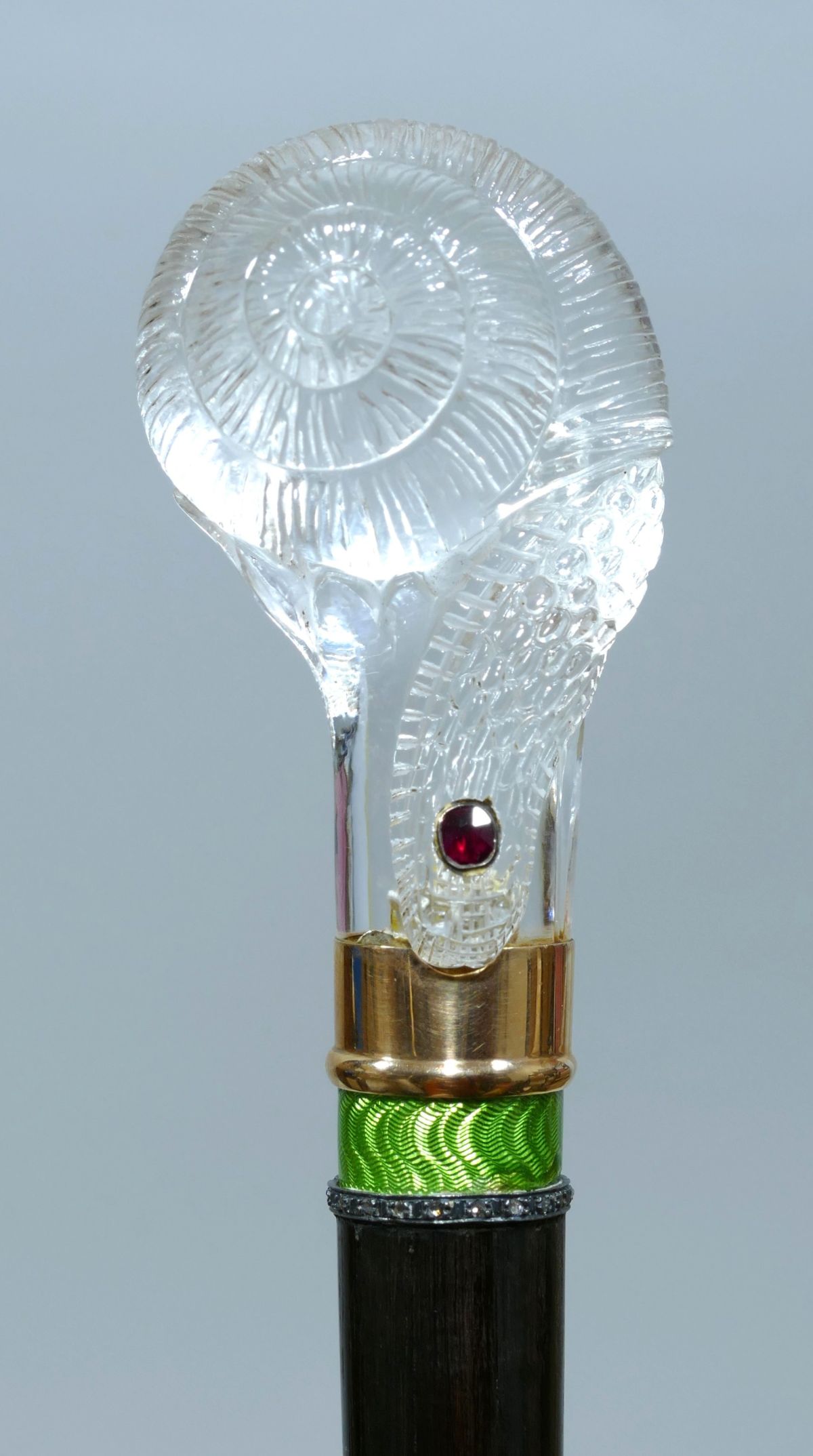 Canne de collection avec pommeau en cristal de roche, rubis et or représentant un escargot