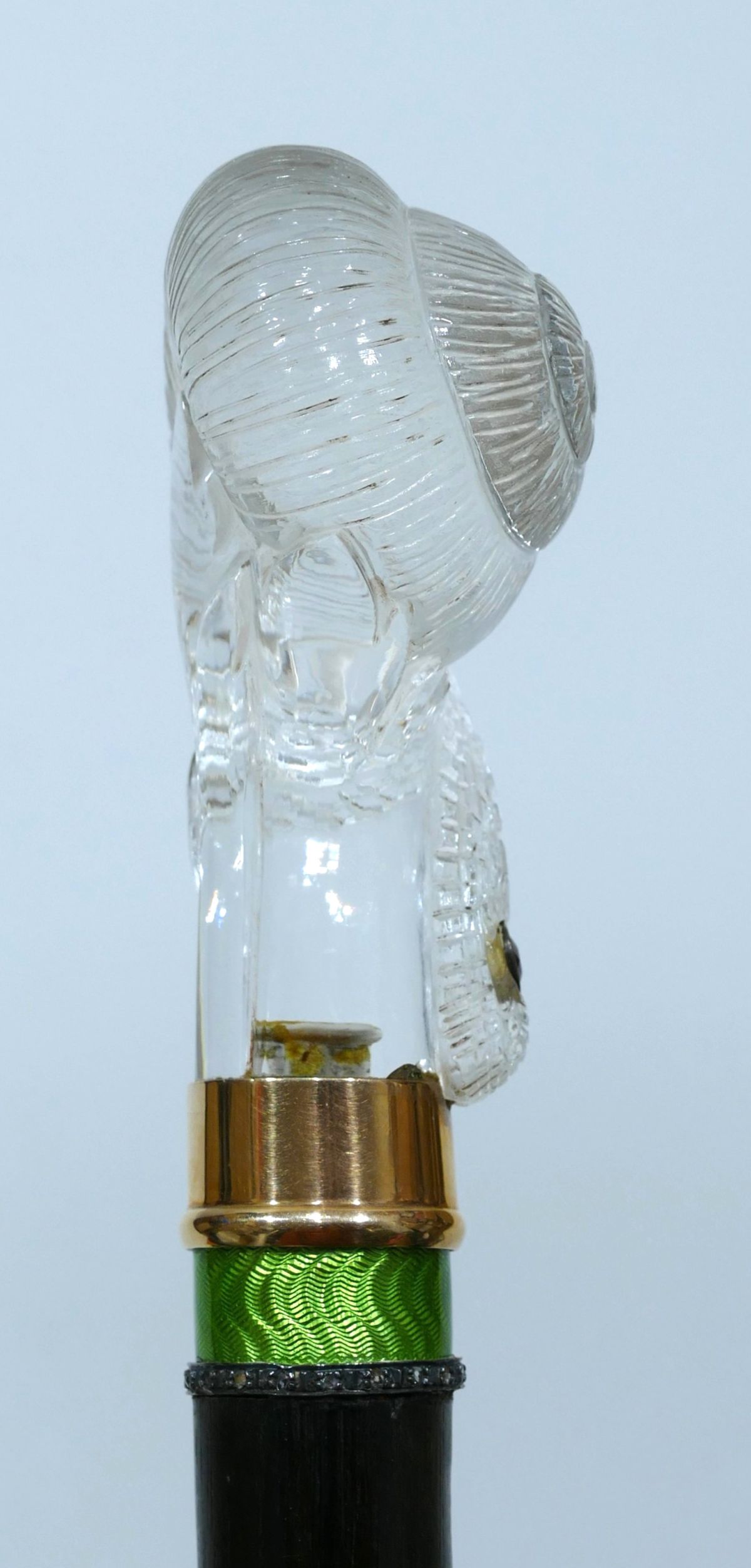Canne de collection avec pommeau en cristal de roche sculpté représentant un escargot avec un œil en rubis facetté cerclé or.