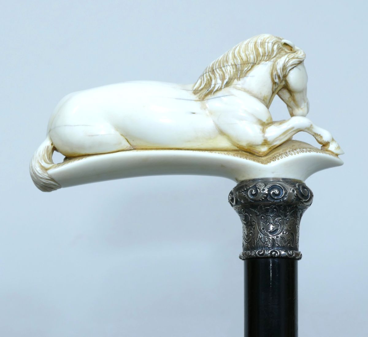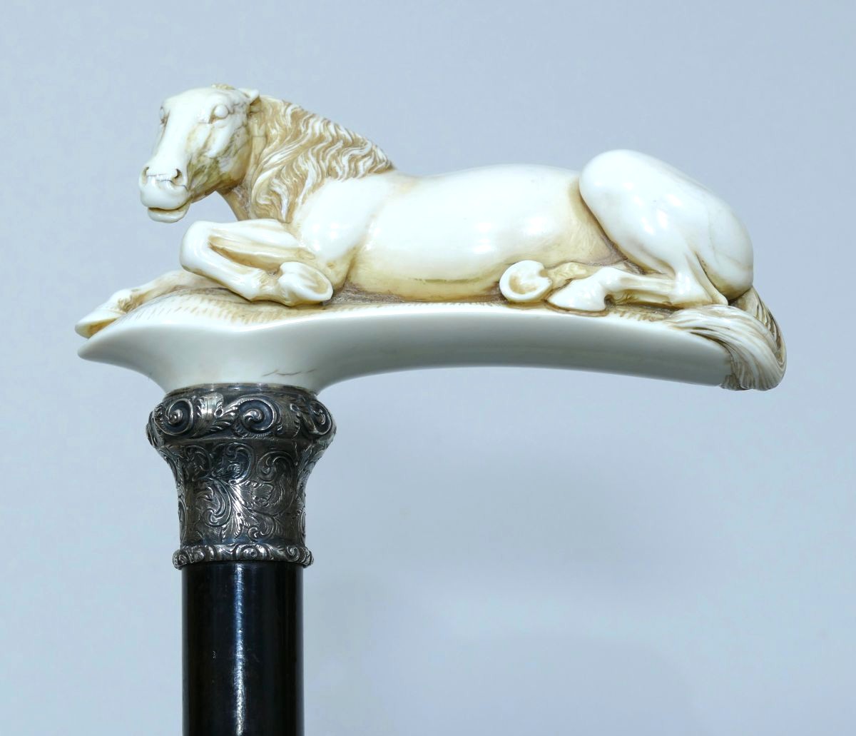 Canne de collection avec pommeau en ivoire représentant un cheval allongé.