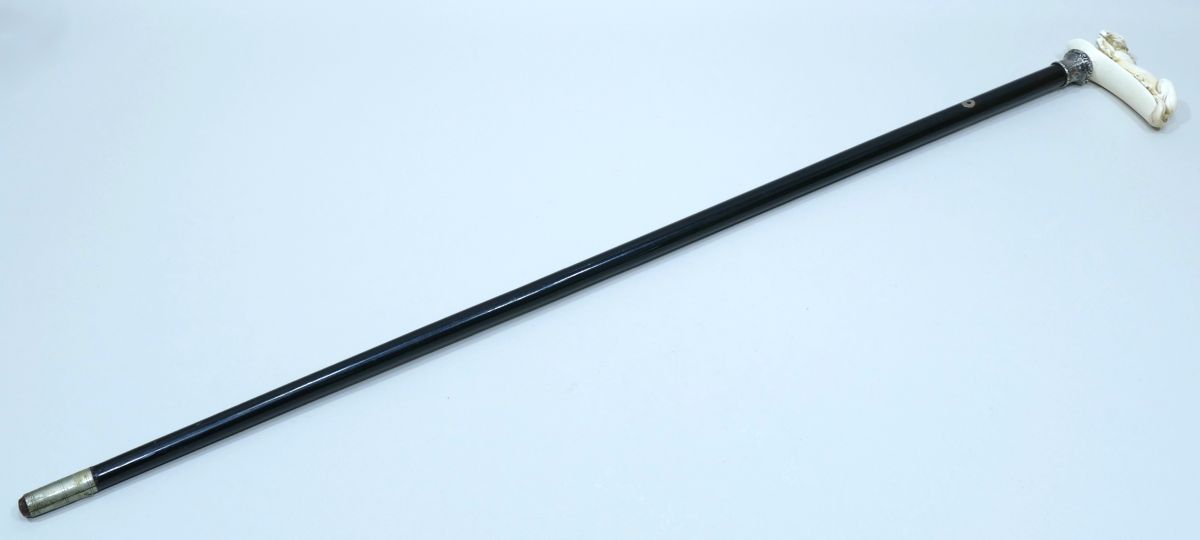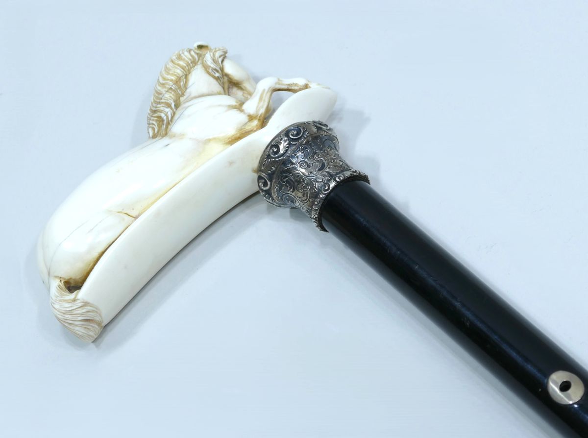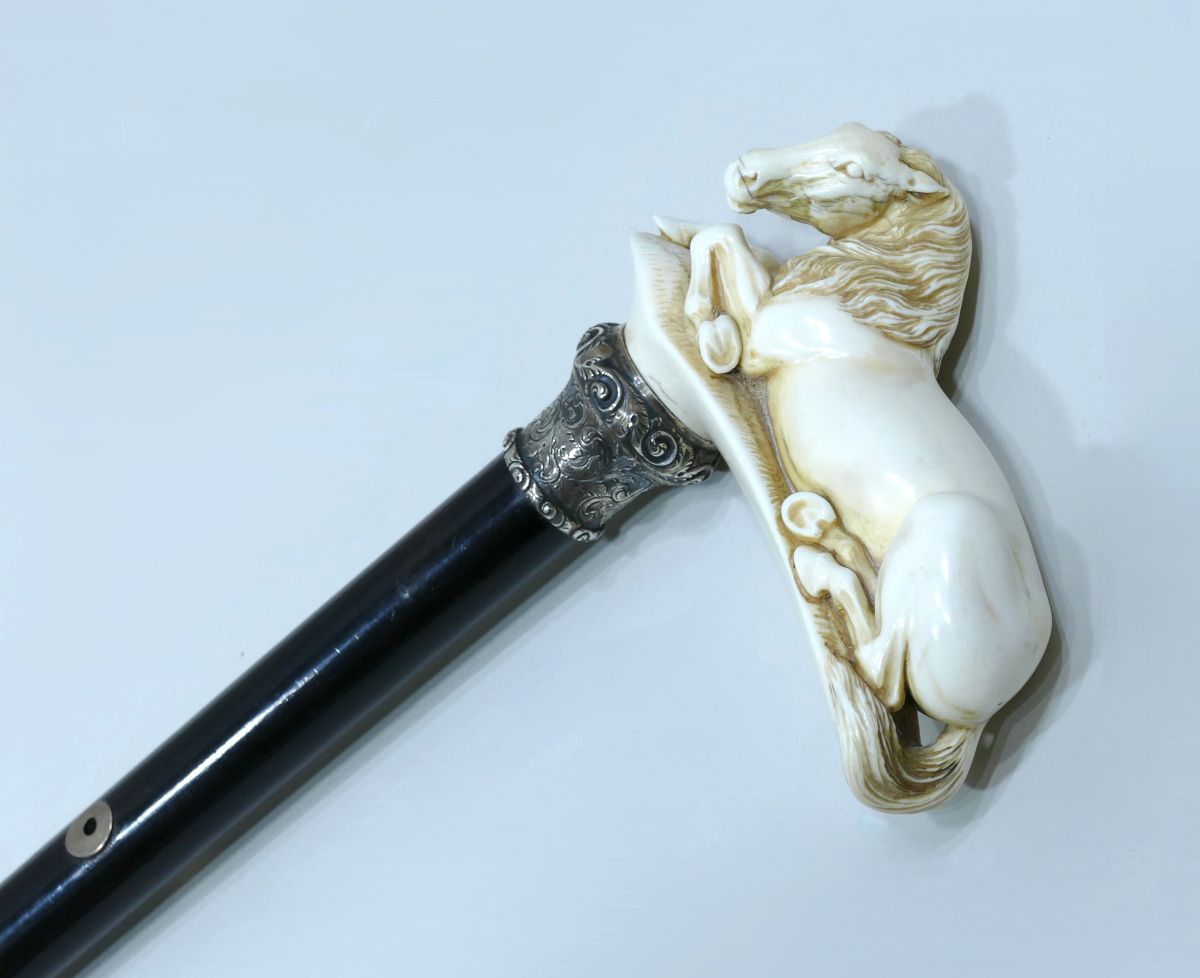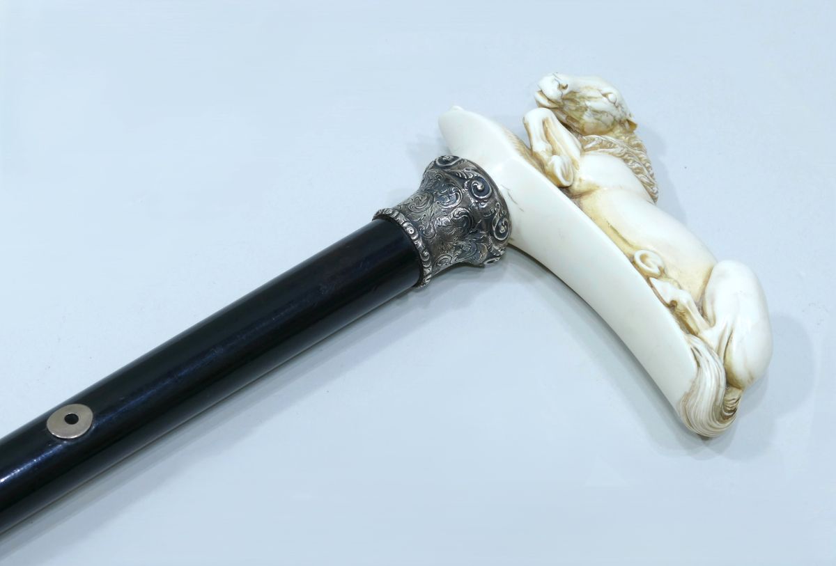 Canne de collection avec pommeau en ivoire représentant un cheval allongé