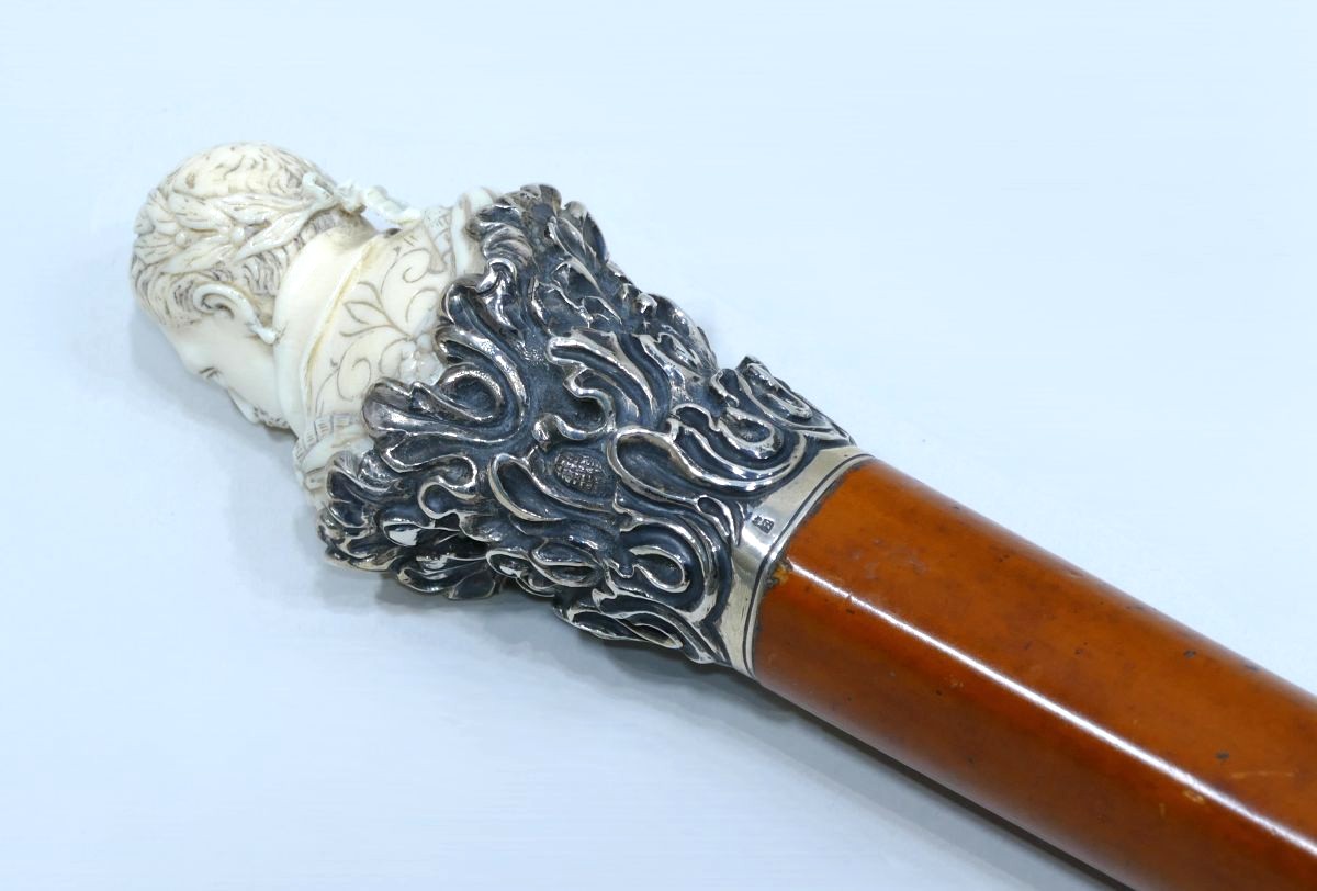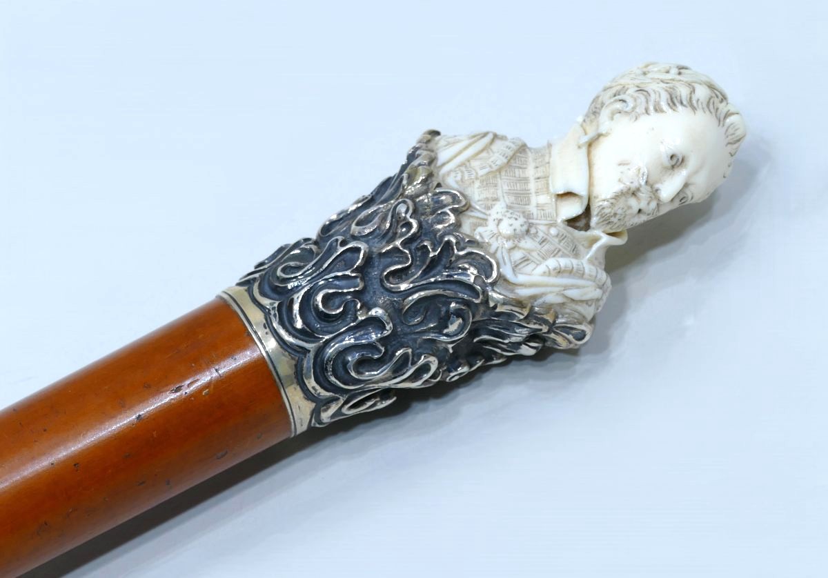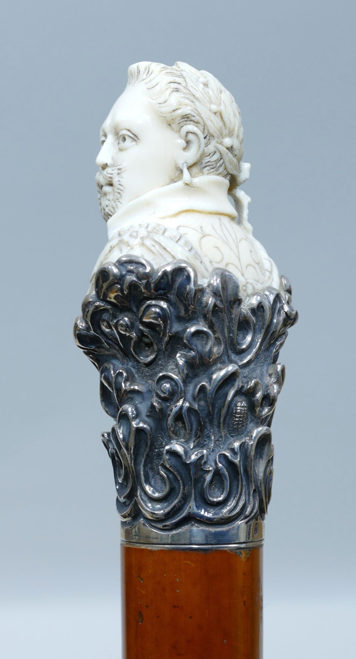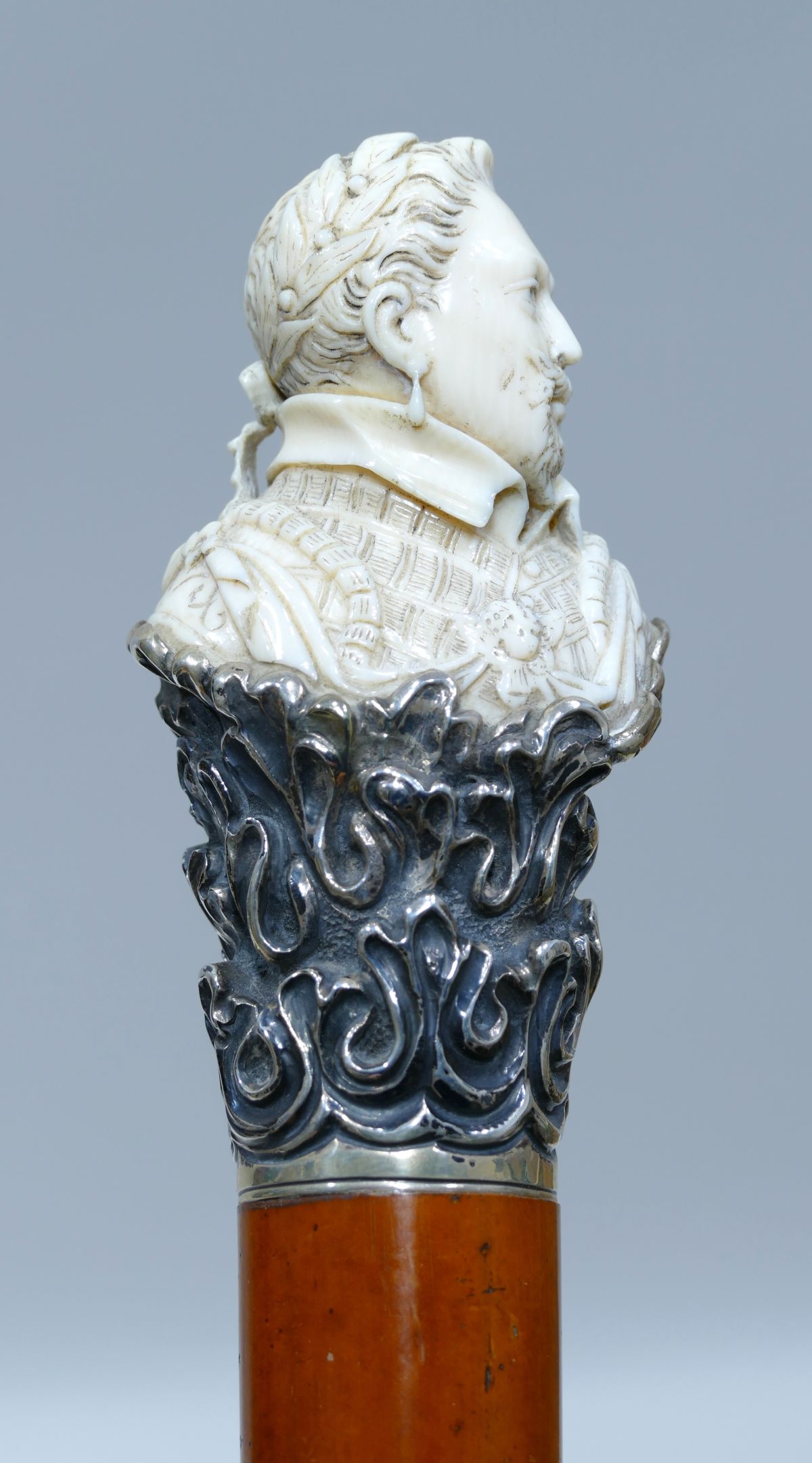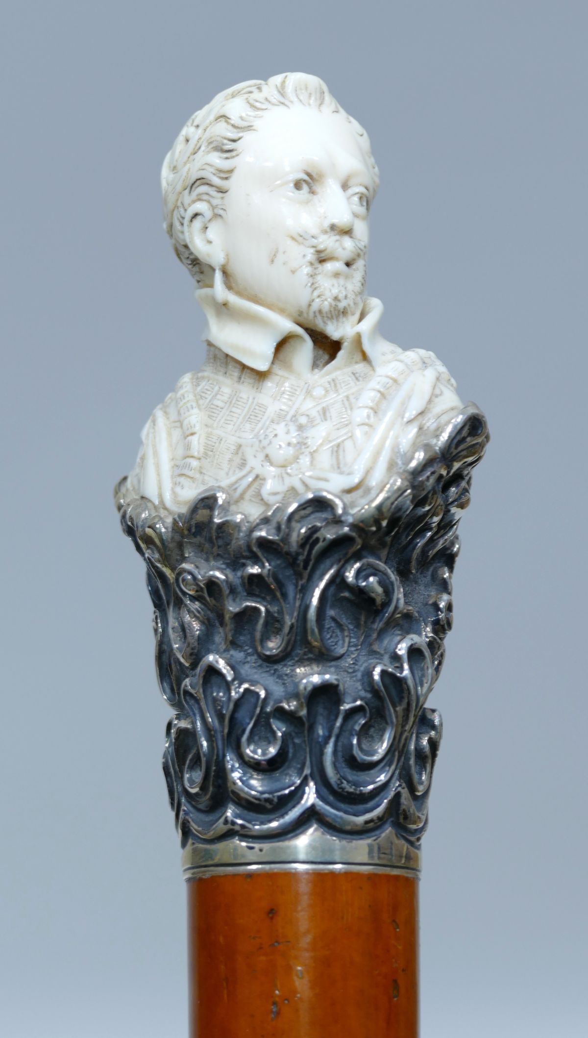 Canne de collection avec pommeau en ivoire représente le portrait d’Henri III en tenue d’époque avec sa couronne de lauriers.
