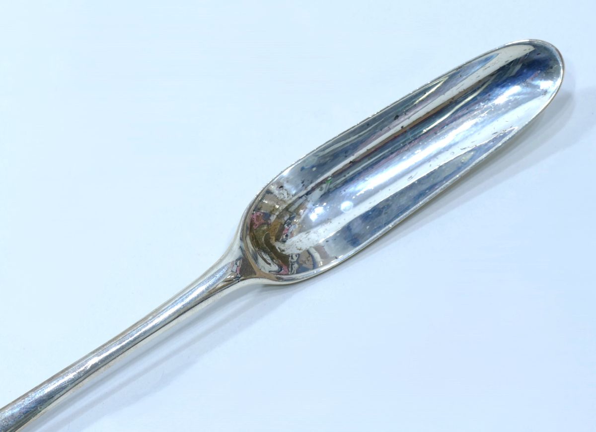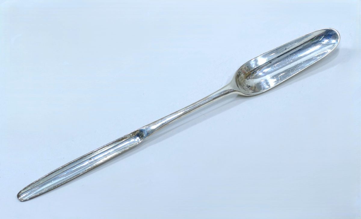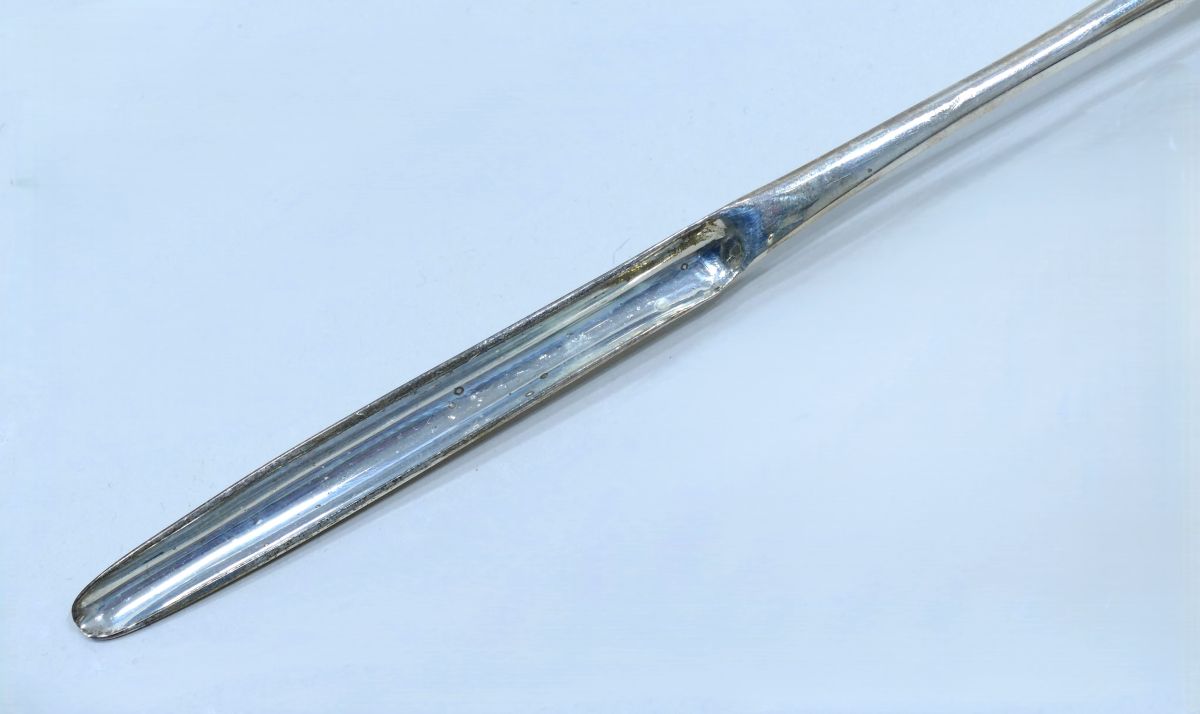Réalisée en argent pour sa durabilité et ses qualités hygiéniques, cette pièce reflète les pratiques médicales soignées de l’époque.