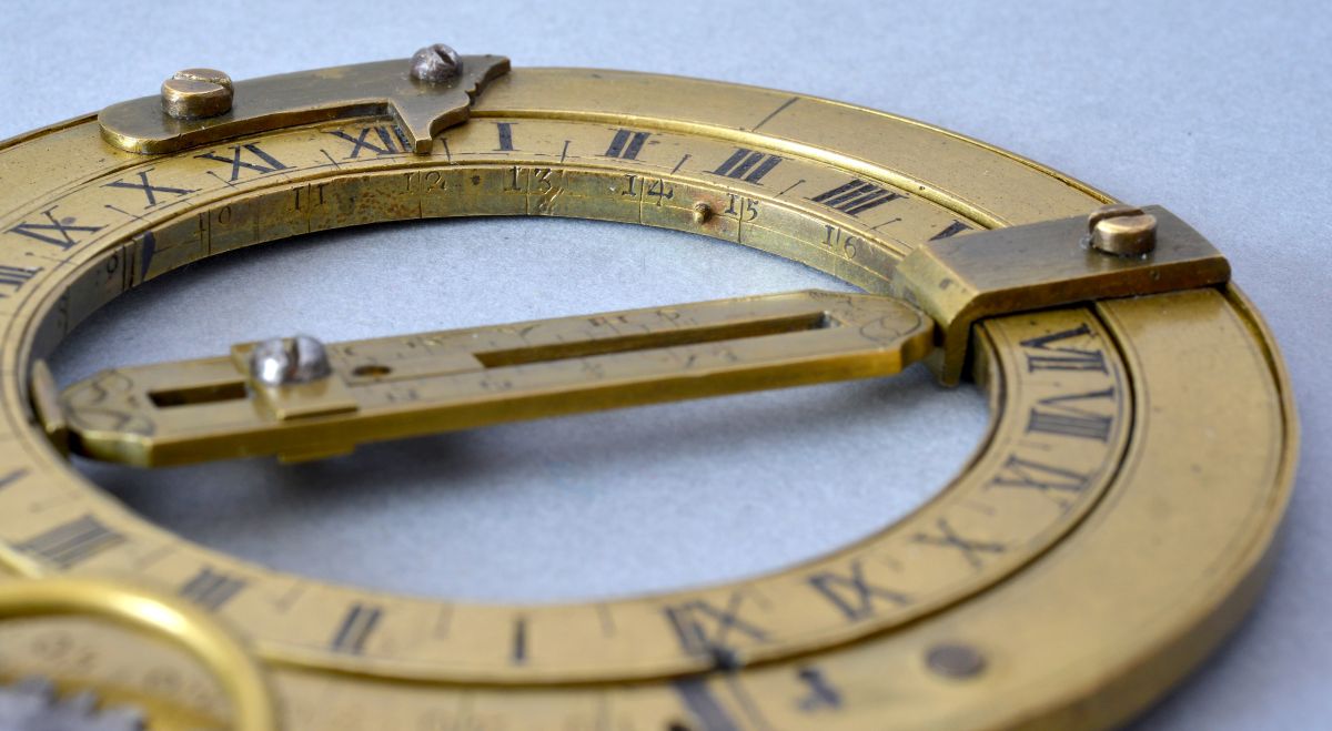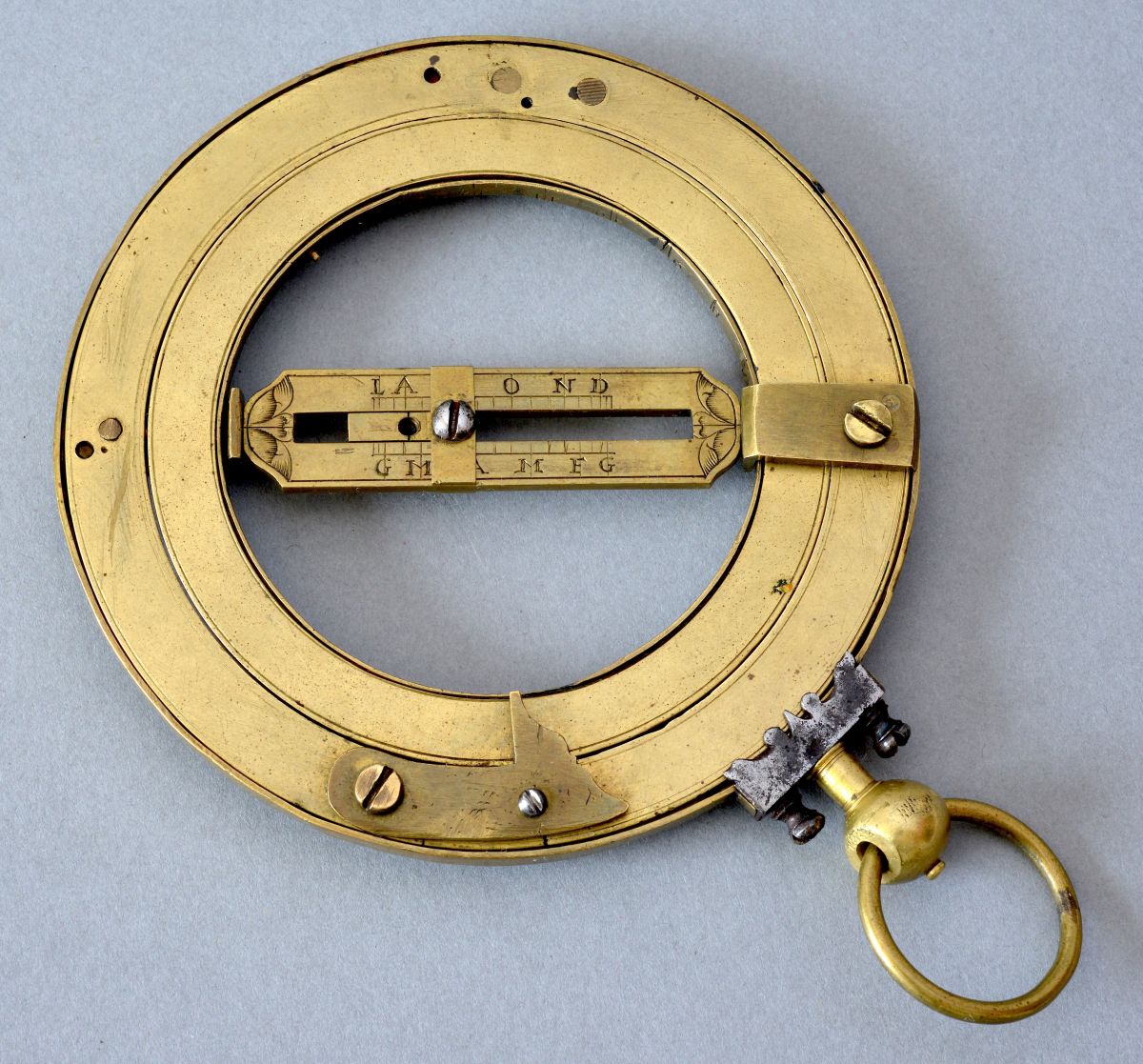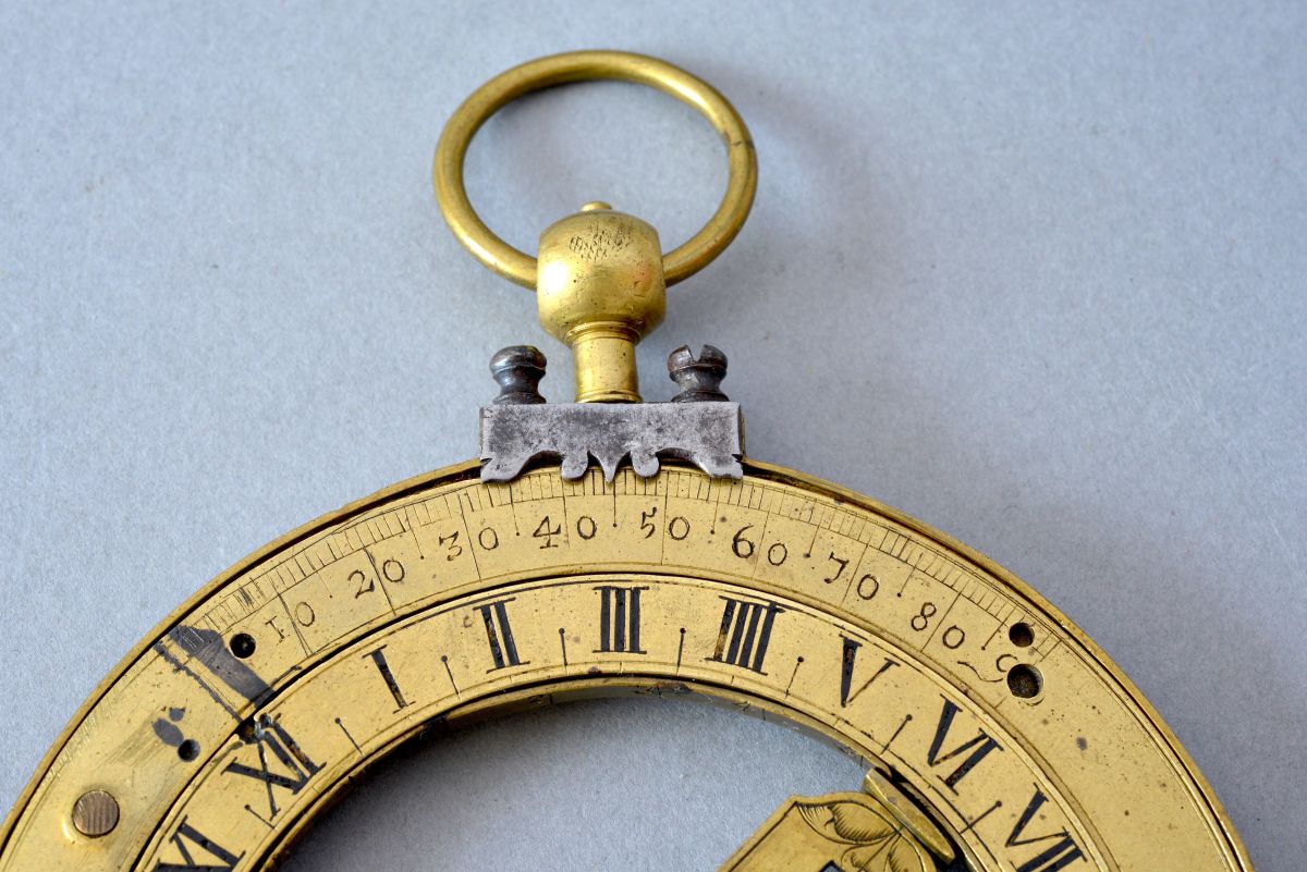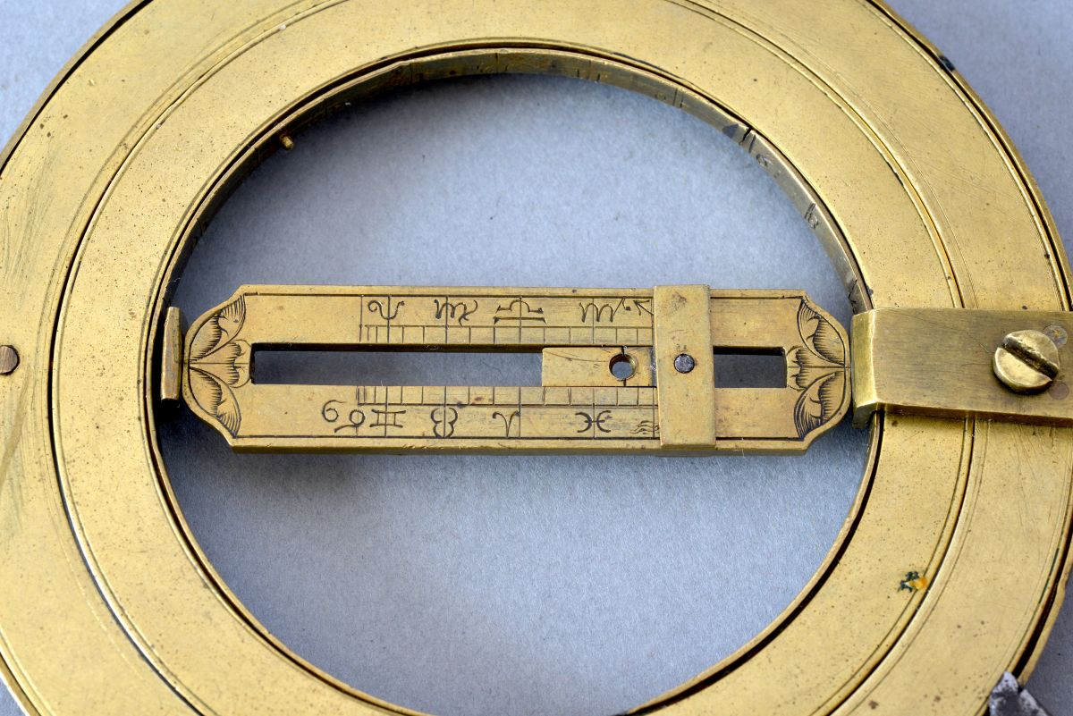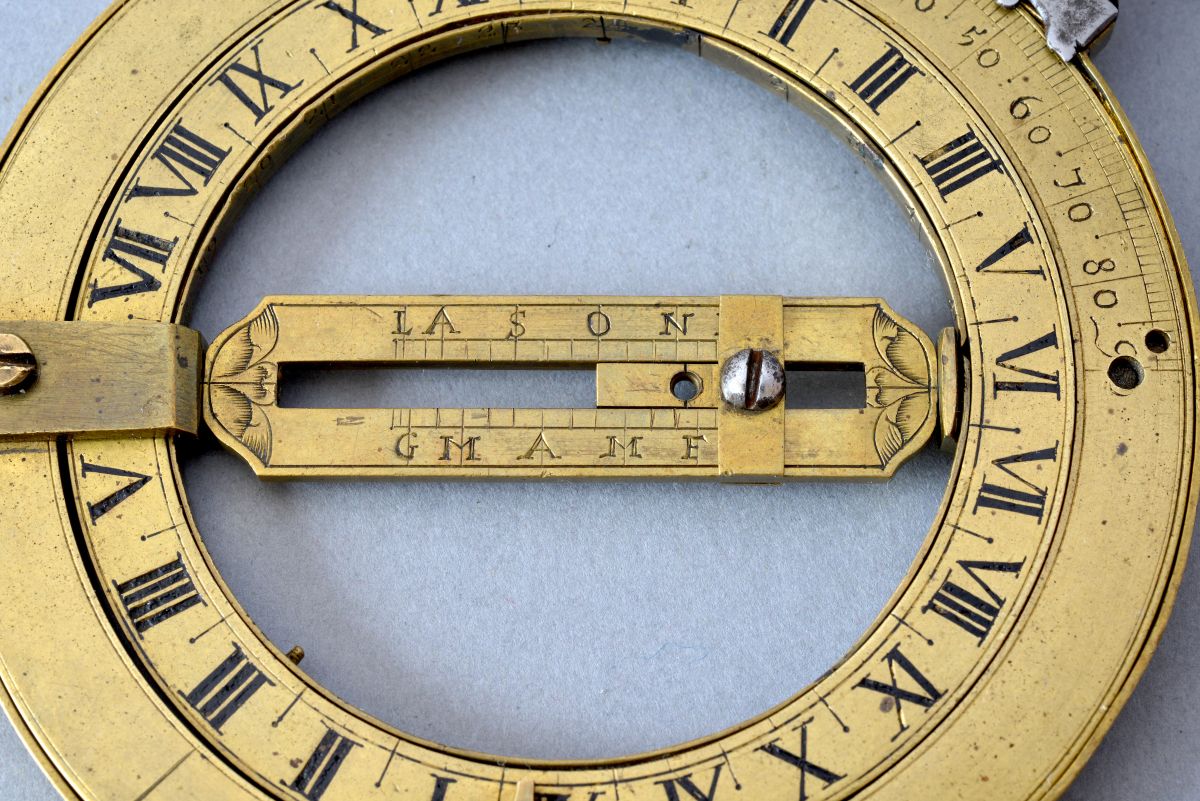 Le cercle méridien extérieur, gradué de 0 à 90°, permet le réglage de la latitude par glissement, tandis que le cercle horaire intérieur présente une double graduation horaire (I à XII) ainsi qu’une échelle 1–24 sur lame coulissante.