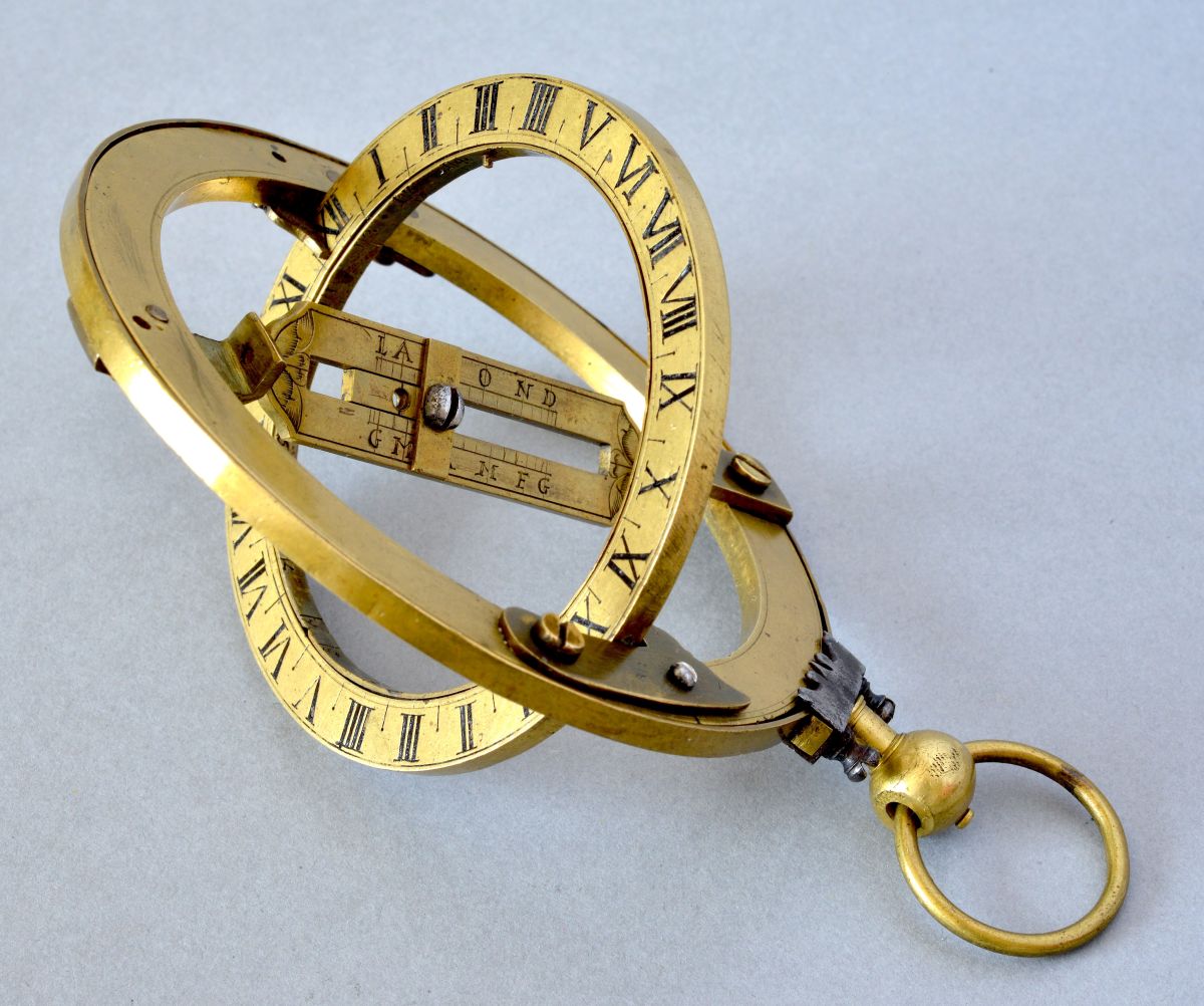 Anneau équinoxial en laiton et acier composé de deux cercles articulés et d’un pont central à curseur mobile, muni d’un trône réglable surmonté d’une bélière.