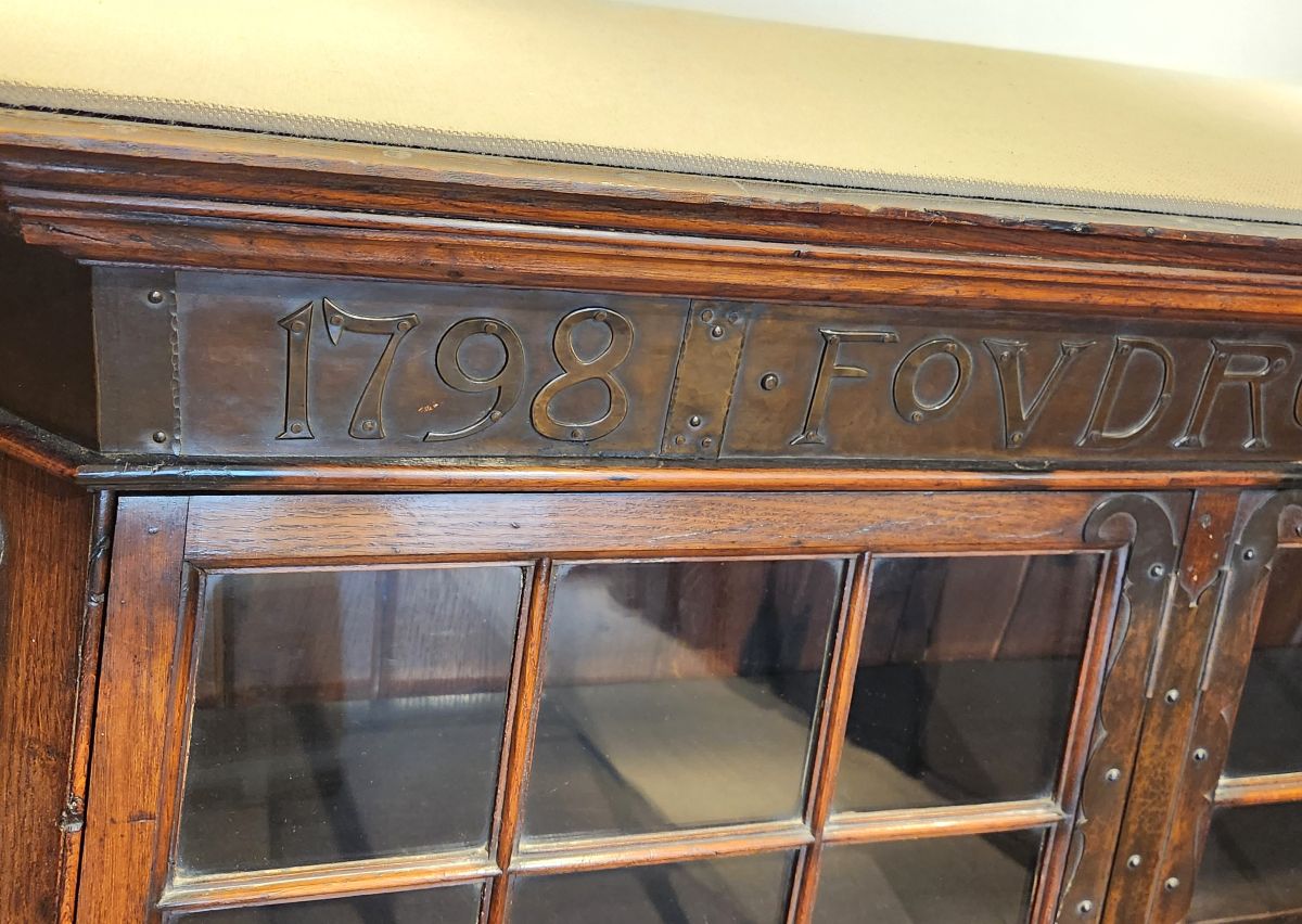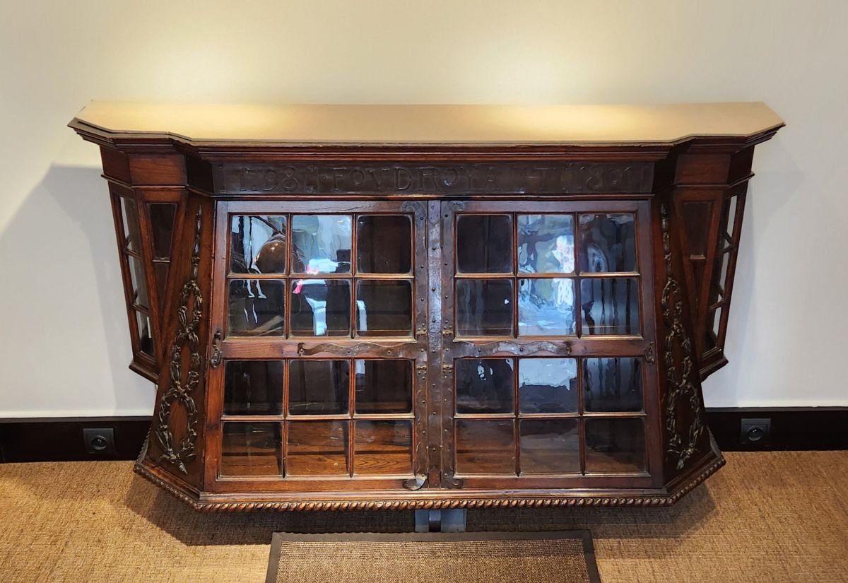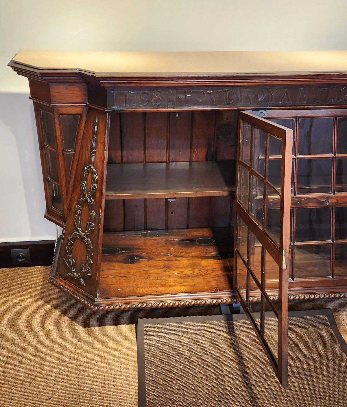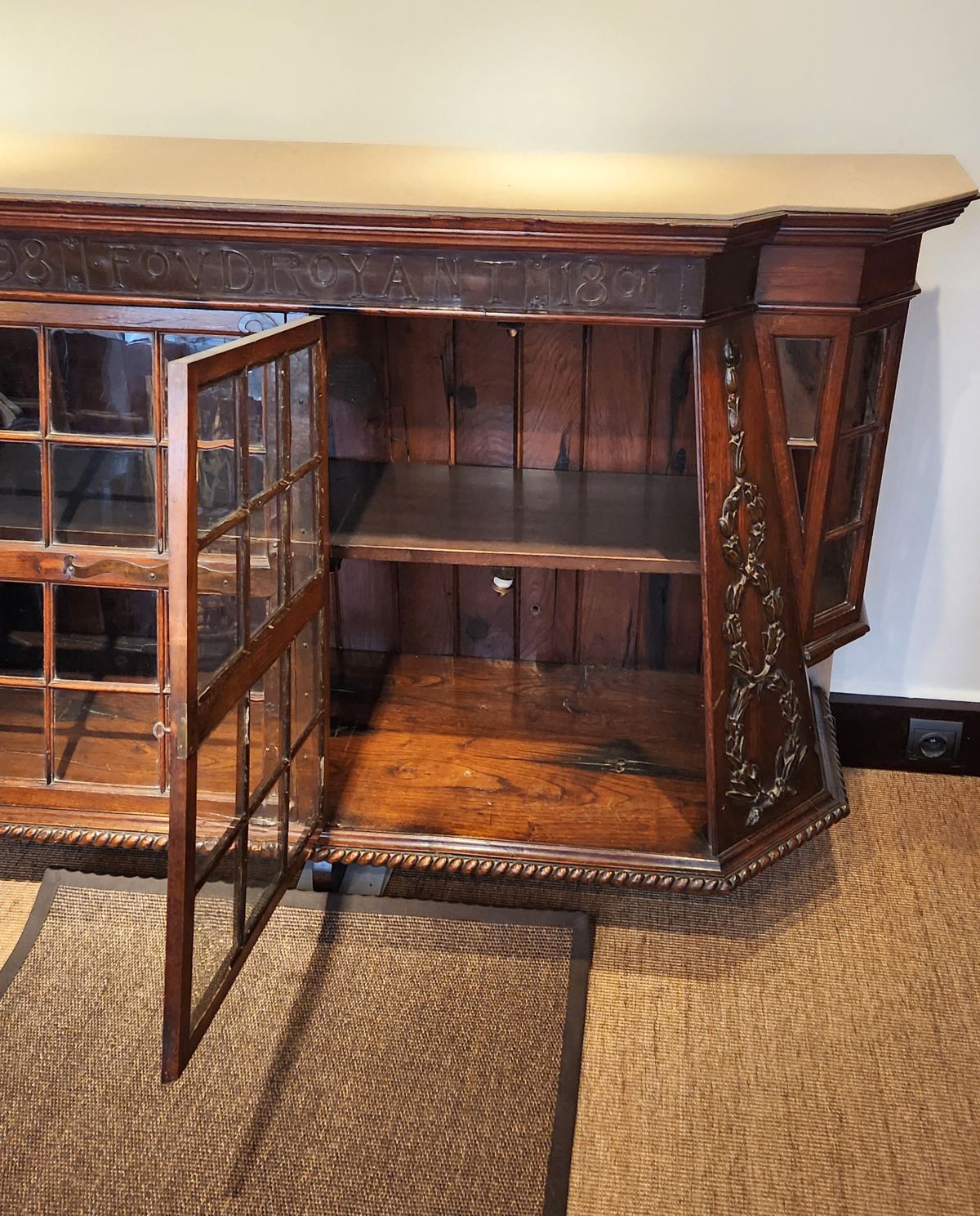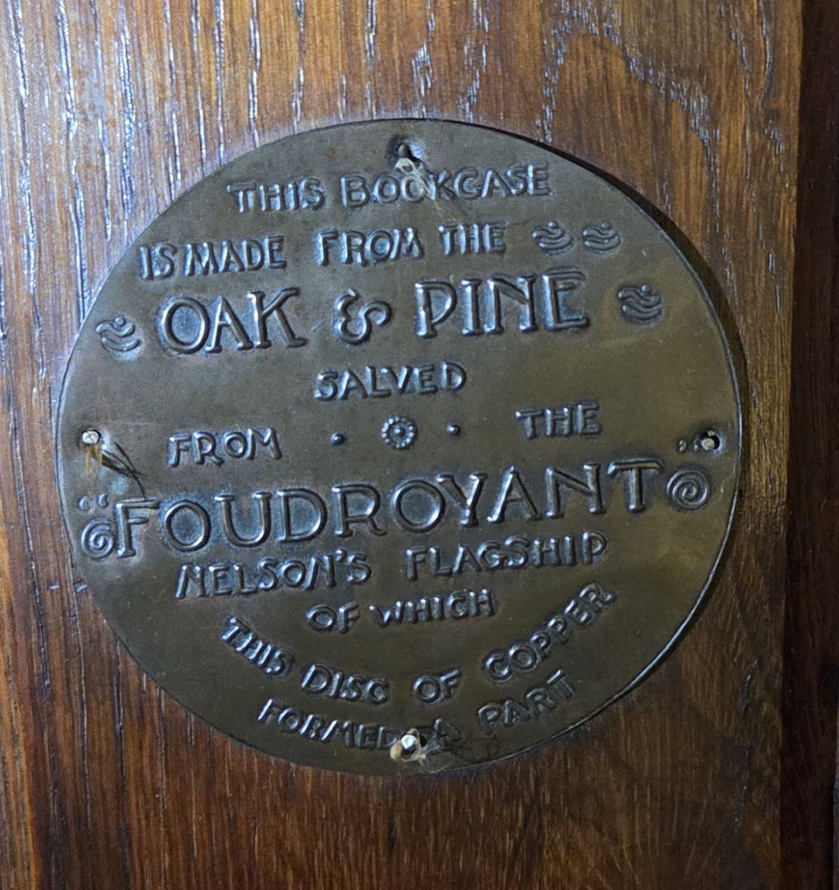 A l'intérieur une plaque en cuivre ronde avec inscription :" "Cette bibliothèque est faite de chêne et de pin récupérés du Foudroyant, navire amiral de Nelson, dont ce disque de cuivre faisait partie."
