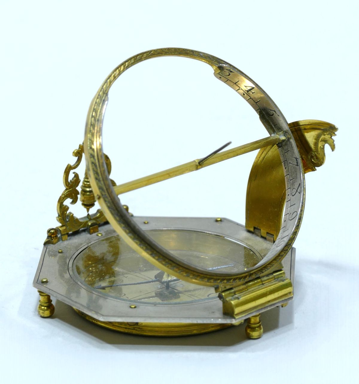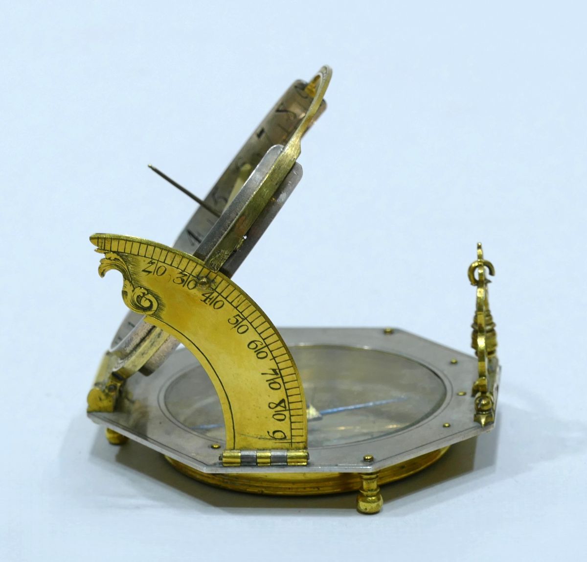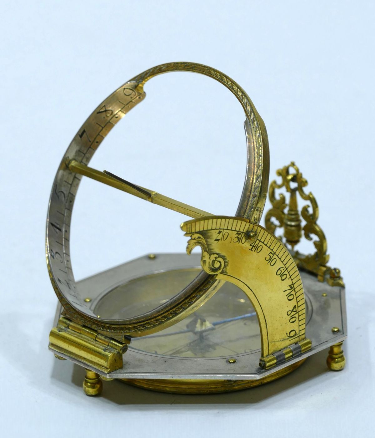 Cadran solaire équatorial hexagonal en laiton doré et argent.
