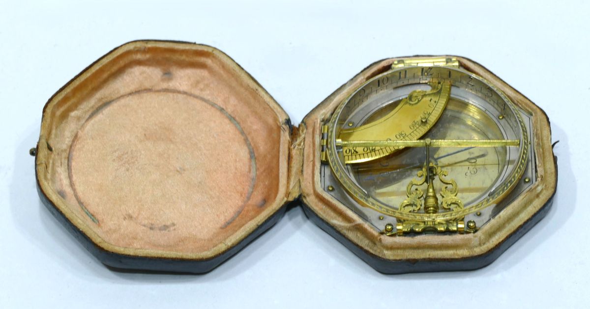 Boussole sur fond doré mentionnant les points cardinaux avec aiguille en acier et pivot de laiton. A la base de la boussole, présence d’un niveau à plomb pour régler l’horizontalité du cadran.