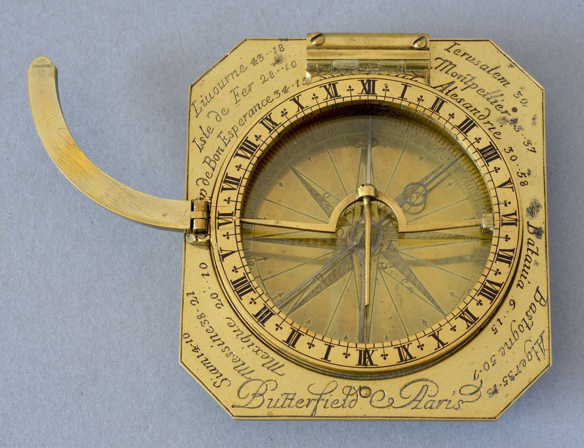 Ce cadran solaire, d’une taille relativement petite pour le type, est d’une qualité de fabrication exceptionnelle et se trouve dans un état de conservation remarquable. Les gravures sont très fines et typique d’un travail du début des années de Michel Butterfield, vers 1680. Sa particularité est que les latitudes des villes sont données avec une très grande précision pour l’époque, ce qui indique une utilisation précise du cadran comme par exemple un voyageur ou un navigateur. Ce fait est également confirmé par le fait que le dessus de la platine comporte seulement deux villes européennes, Montpellier (en France) et Bastogne (en Belgique), qui sont sans doute les villes où habite le propriétaire, ainsi que 10 villes ou régions étrangères très lointaines comme par exemple l’Isle de Fer, Le Cap de Bon Espérance, le Siam ou encore Jérusalem. Plus étonnant encore est la présence de Batavia (6°15’), une ville très proche de l’équateur situé au bord de l’océan indien. Batavia était le nom du siège de la Compagnie néerlandaise des Indes orientales en Insulinde de 1619 à 1799 puis la capitale des Indes néerlandaises de 1799 à 1742. C’est l’actuelle ville de Jakarta, ancienne capitale et plus grande ville de la république d’Indonésie. Enfin, la présence de l’Isle de Fer (28°10’) est caractéristique d’un grand navigateur car c’est aussi le point de référence des méridiens à cette époque. En tant que méridien d’origine, l’Isle de Fer sera remplacée par le méridien de Paris après la révolution française puis par celui de Greenwich au début du 20e siècle.