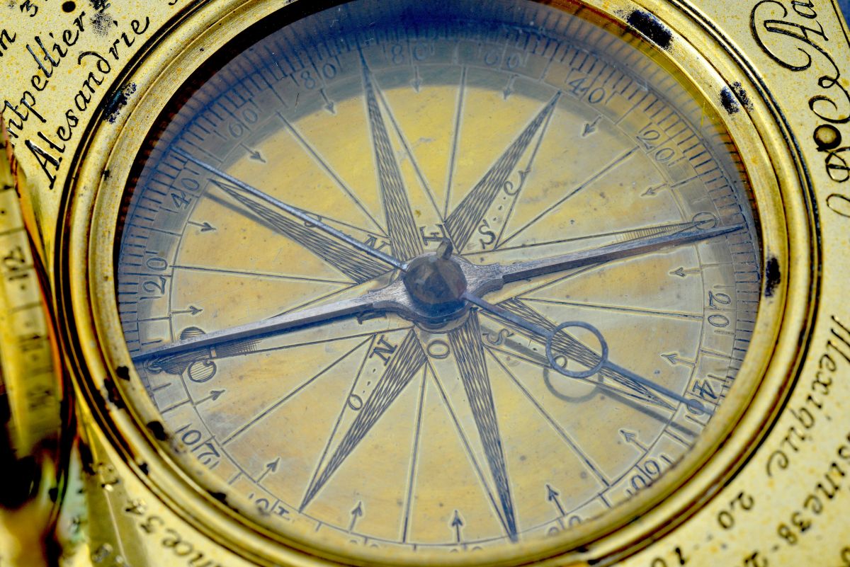 Le centre de la platine est équipé d’une grande boussole, fixée par deux vis et gravée d’une rose des vents à 8 directions, le nord étant marqué par une fleur de lys. En périphérie, on trouve une échelle divisée en quatre fois 90 degrés. Le centre est équipé d’une aiguille en acier bleui à pivot de laiton et le tout est recouvert d’un verre.