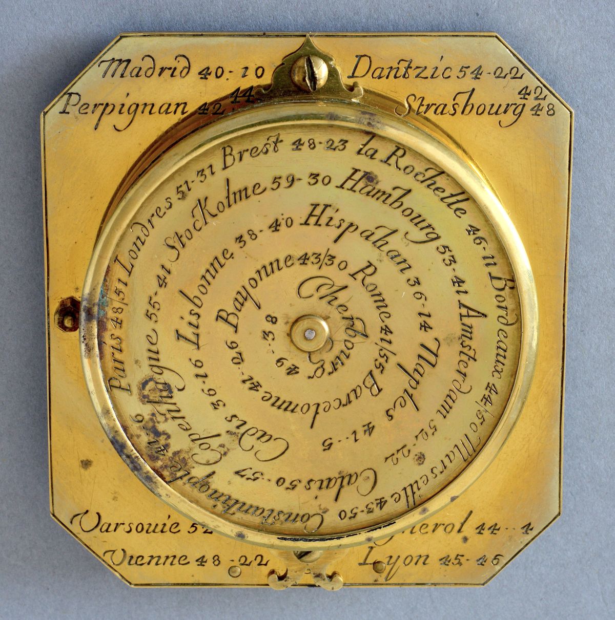 Le dessous de la platine, bordé d’un filet, est gravé d’une liste de 8 villes avec leurs latitudes et le fond de la boussole, d’une liste de 20 villes et leurs latitudes.