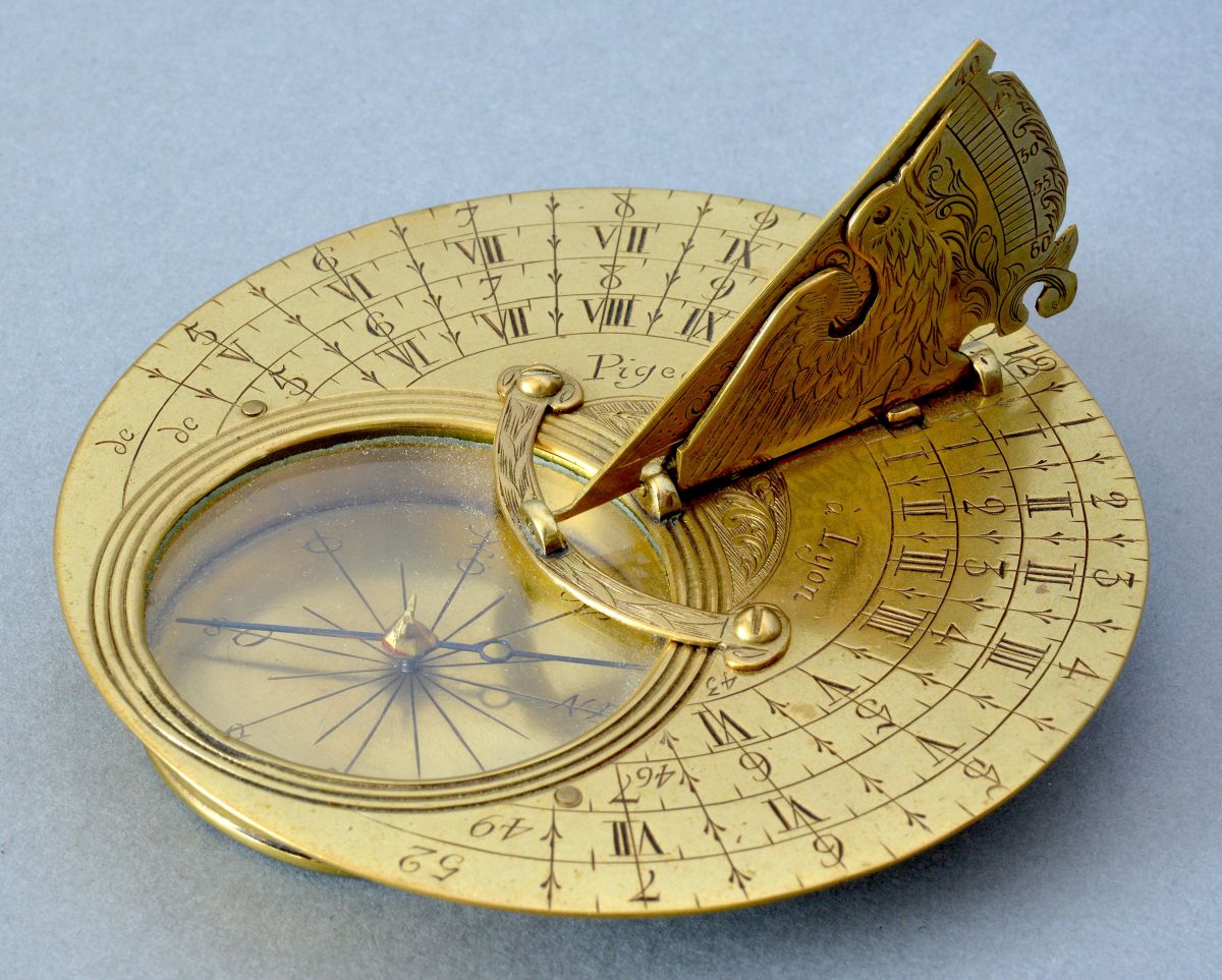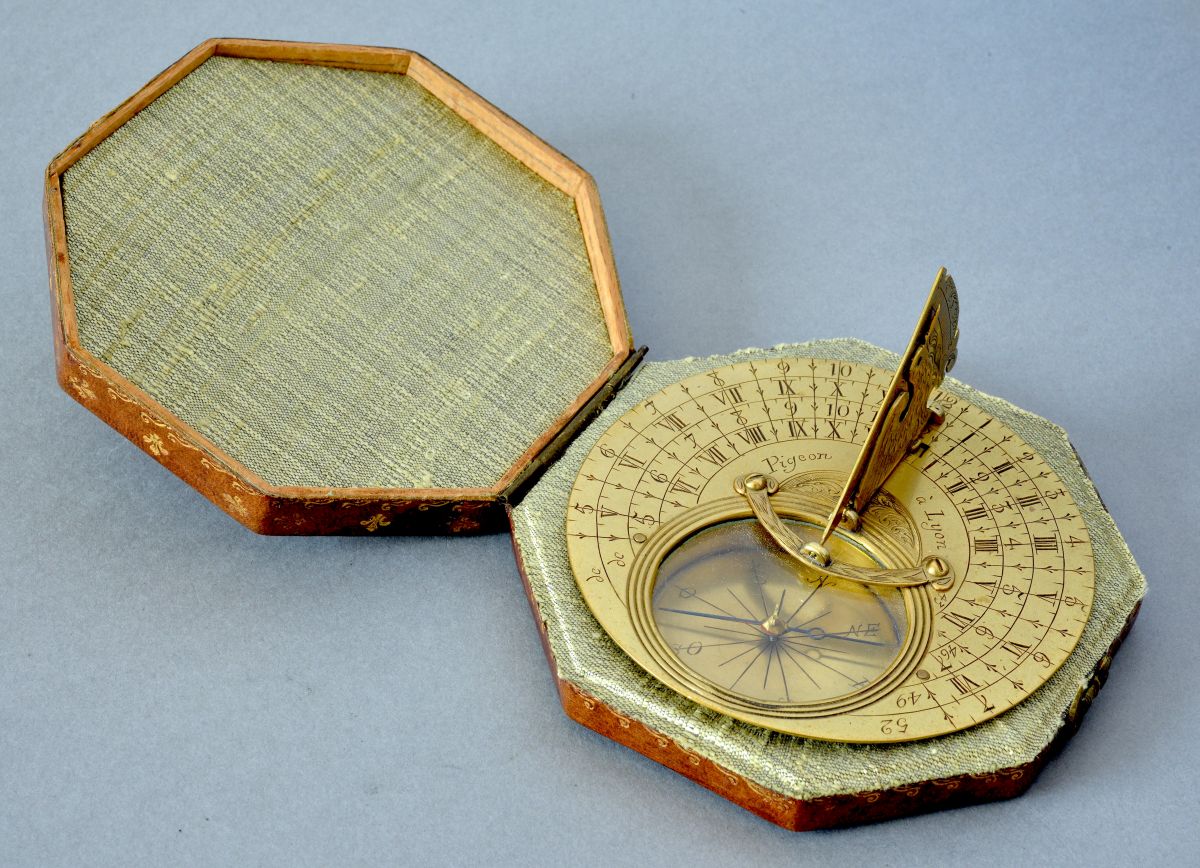 Au centre la signature « Pigeon à Lyon » avec un petit décor de volutes. Le style-axe à l’oiseau présente un décor de volutes avec d’un côté une échelle des latitudes de 40 à 60 degrés. A noter la fixation très originale de ce gnomon grâce à un arc de cercle vissé au-dessus de la boussole. Cette dernière graduée dans le fond de seize directions cardinales avec au centre un pivot d’acier supportant une aiguille en acier bleui à pivot de laiton.