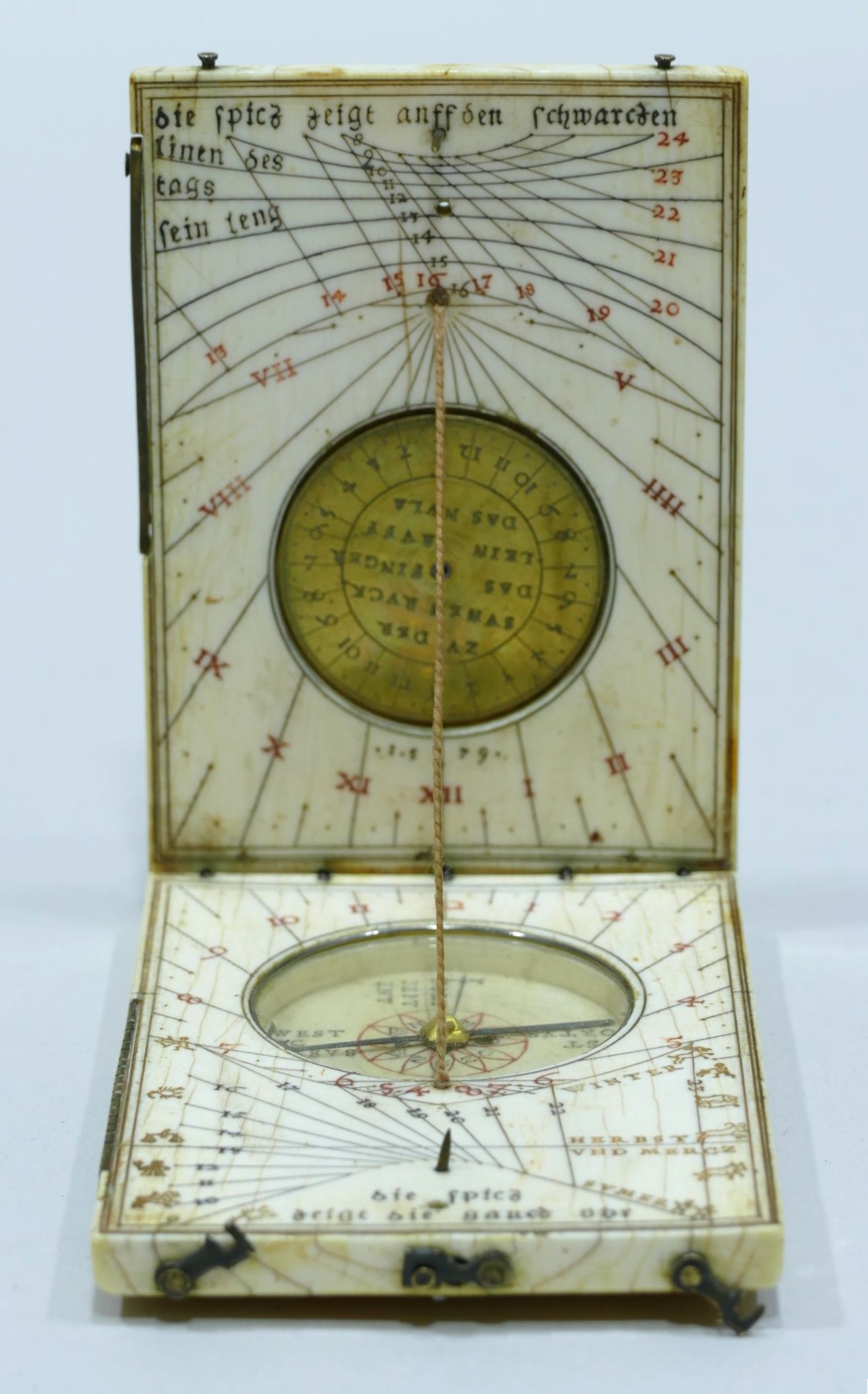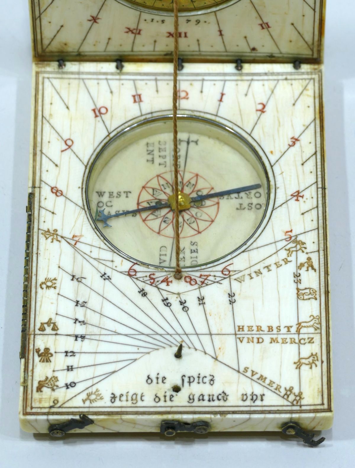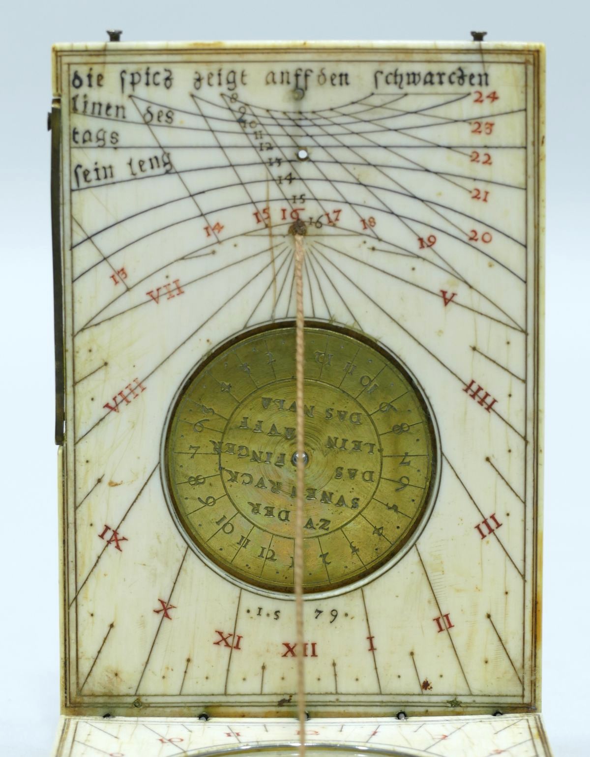 La face intérieure du couvercle est gravée en polychromie de deux cadrans solaires verticaux : l’un à fil-axe avec au centre une volvelle comportant une échelle horaire gravée de 1 à 12 deux fois et une devise au centre « die spitz zeigt anff den schwartzen linien des tags sein leng » (= la pointe indique, sur les lignes noires, la durée du jour) ; et l’autre à gnomon aiguille avec des échelles en heure italique et babylonique.