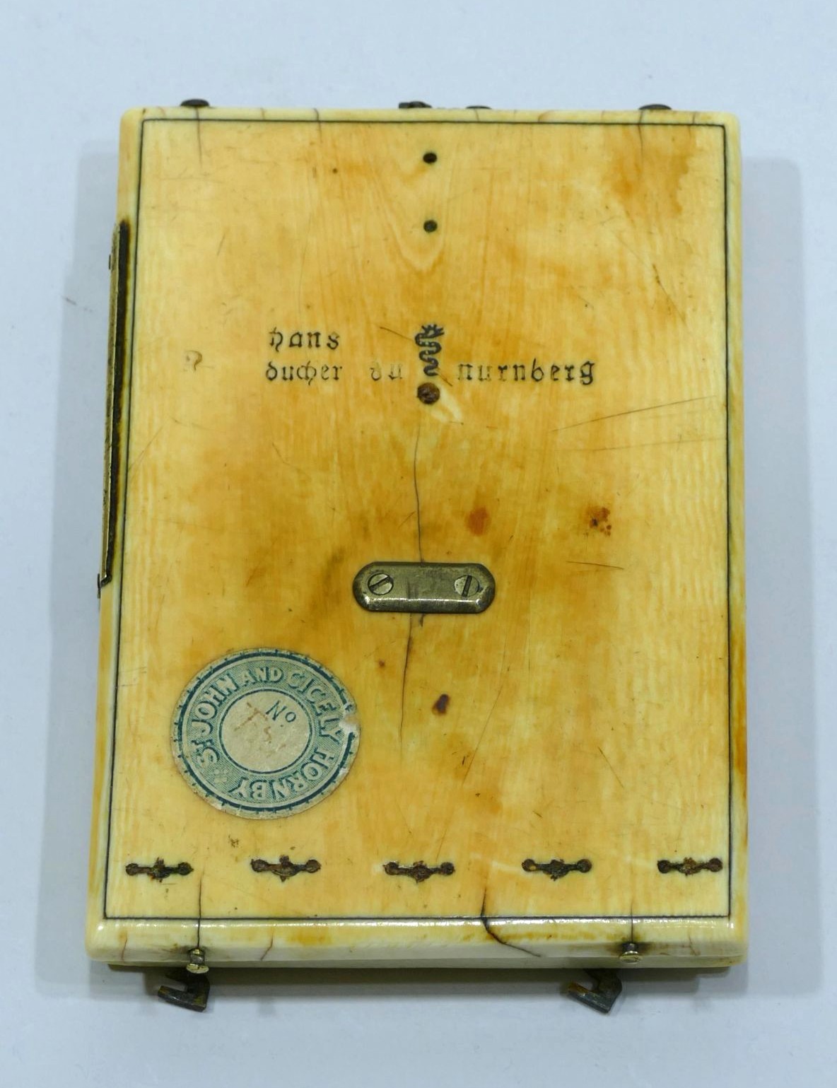 Au dos de la plaque de base on retrouve la signature manuscrite « Hans Ducher Nurnberg » avec la marque au serpent au centre et à gauche le « n » gothique, ainsi qu’une ancienne étiquette (St. John and Ciceli Hornby).