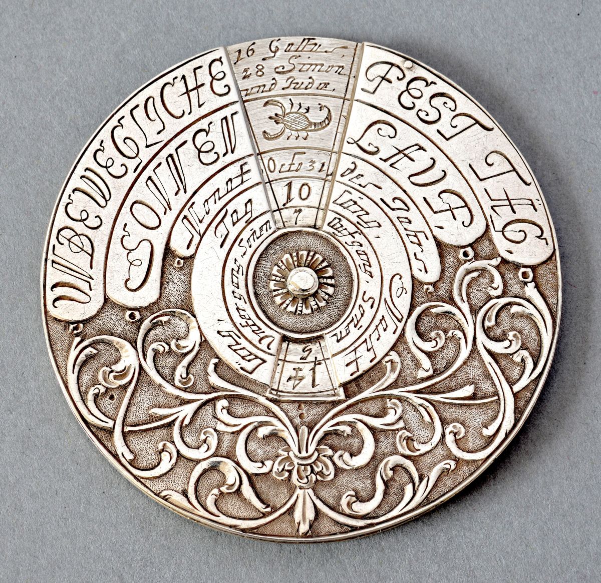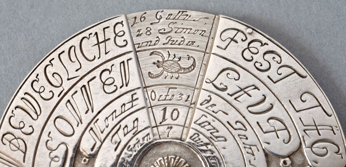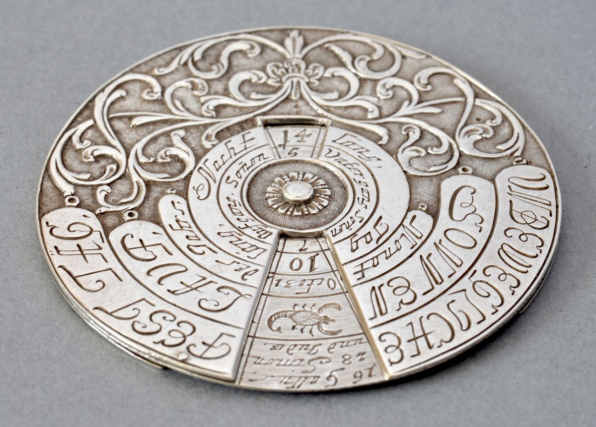 - La seconde, nommée « Die Alte Zeit » (les jours précédents), correspond aux jours écrits en abrégés avec une fenêtre à l’intérieur du disque. Entre ces deux échelles on trouve un décor d’entrelacs en relief et une frise de losange en périphérie. Les graduations des échelles sont gravées sur le disque central.
