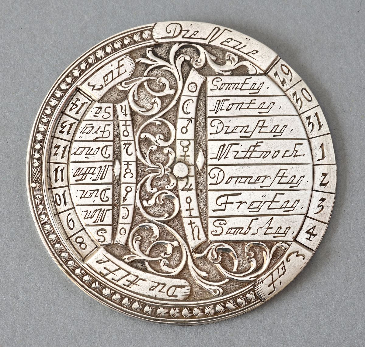 Sur la face on trouve deux échelles des jours de la semaine accompagnés de leur symbole astronomique.
