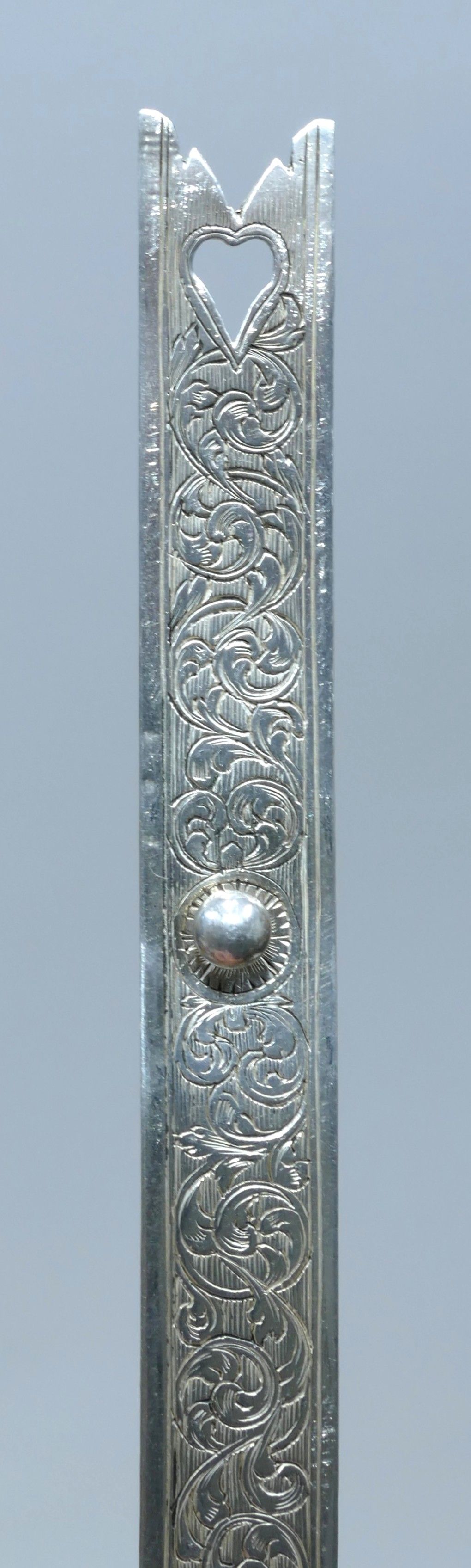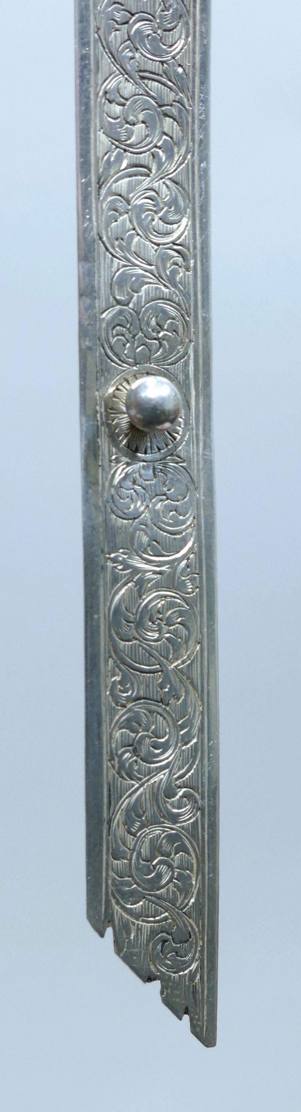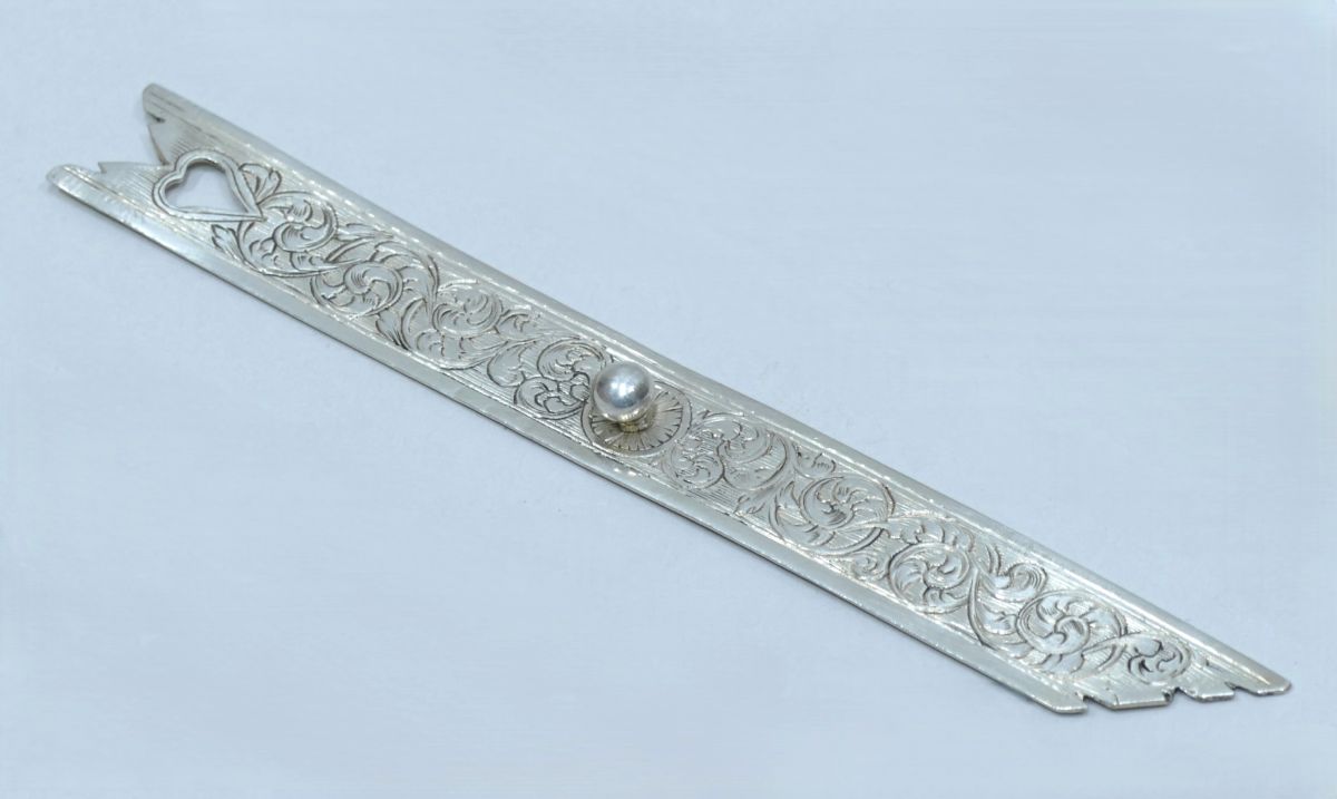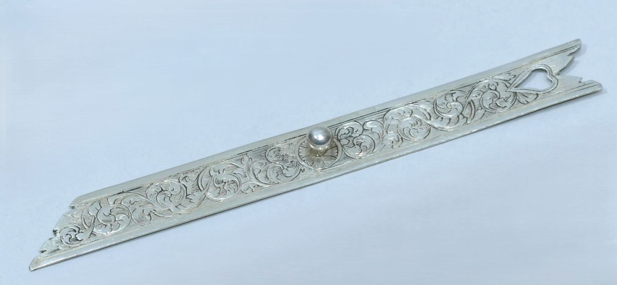 Petite règle plate en argent aux extrémités découpées avec une prise au centre en forme de bouton. Le dessus est gravé d’un décor de feuilles d’acanthes enroulées et le dos est uni.