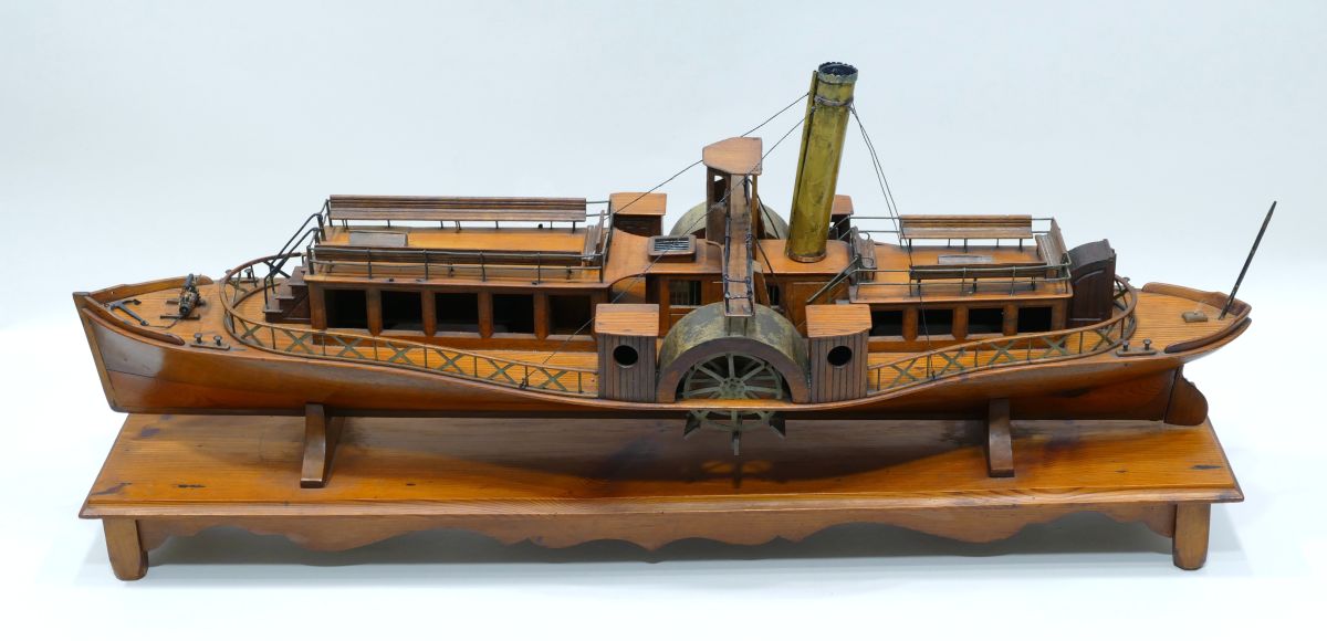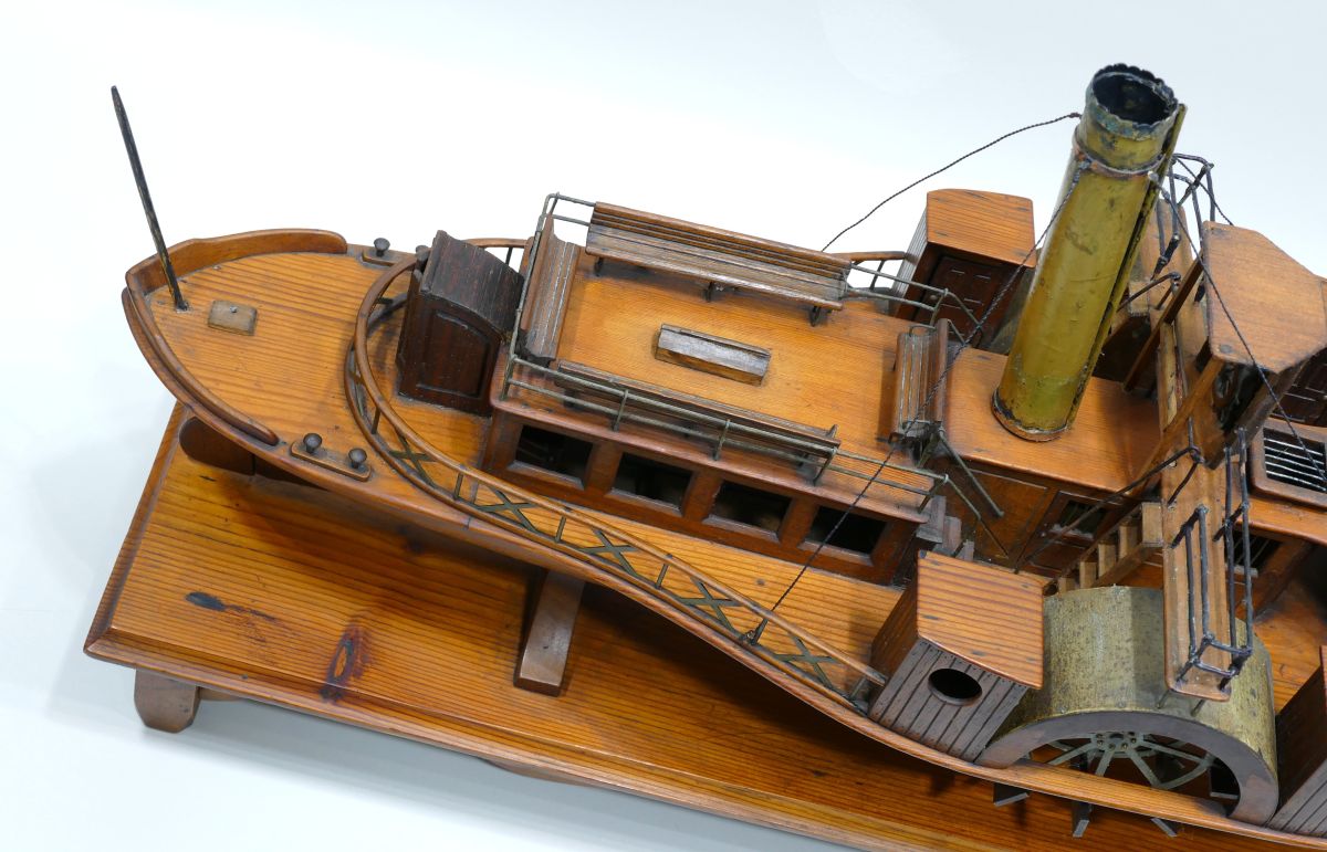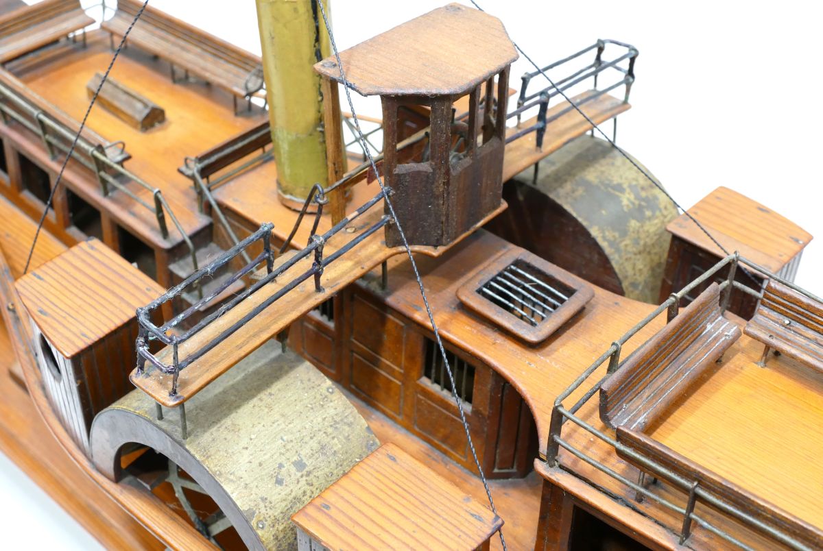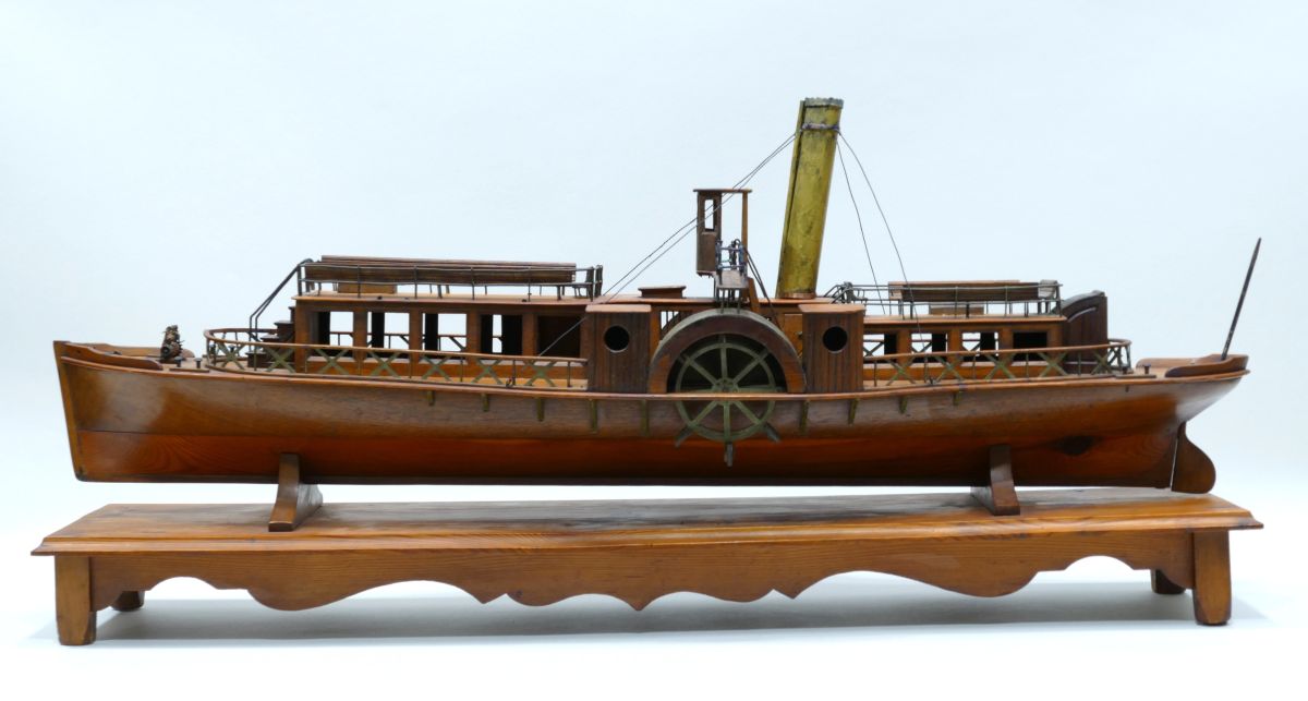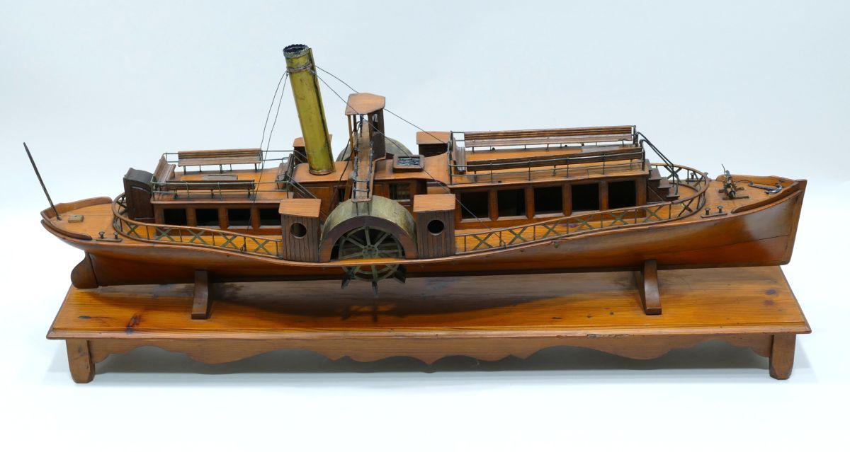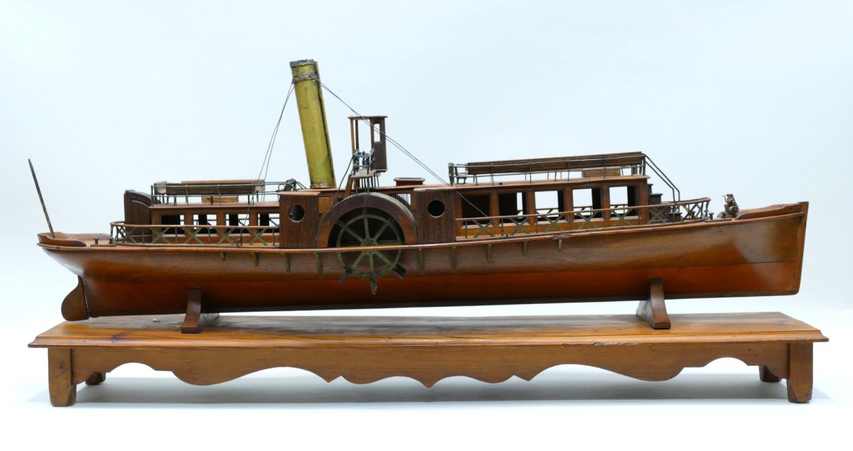 Magnifique maquette de chantier à vapeur à roues à aubes (lacustre) en bois et tôle typique des bateaux qui faisaient les liaisons entre les différentes villes des lacs (Annecy ou Leman). Présence d’une cheminée pour la propulsion à vapeur et de deux espaces pour les passagers : un sur le pont à l’extérieur et un second couvert à l’intérieur du bateau.