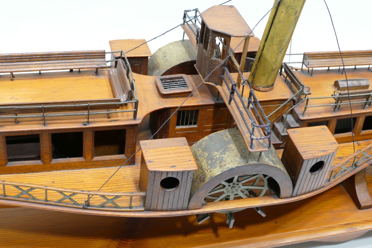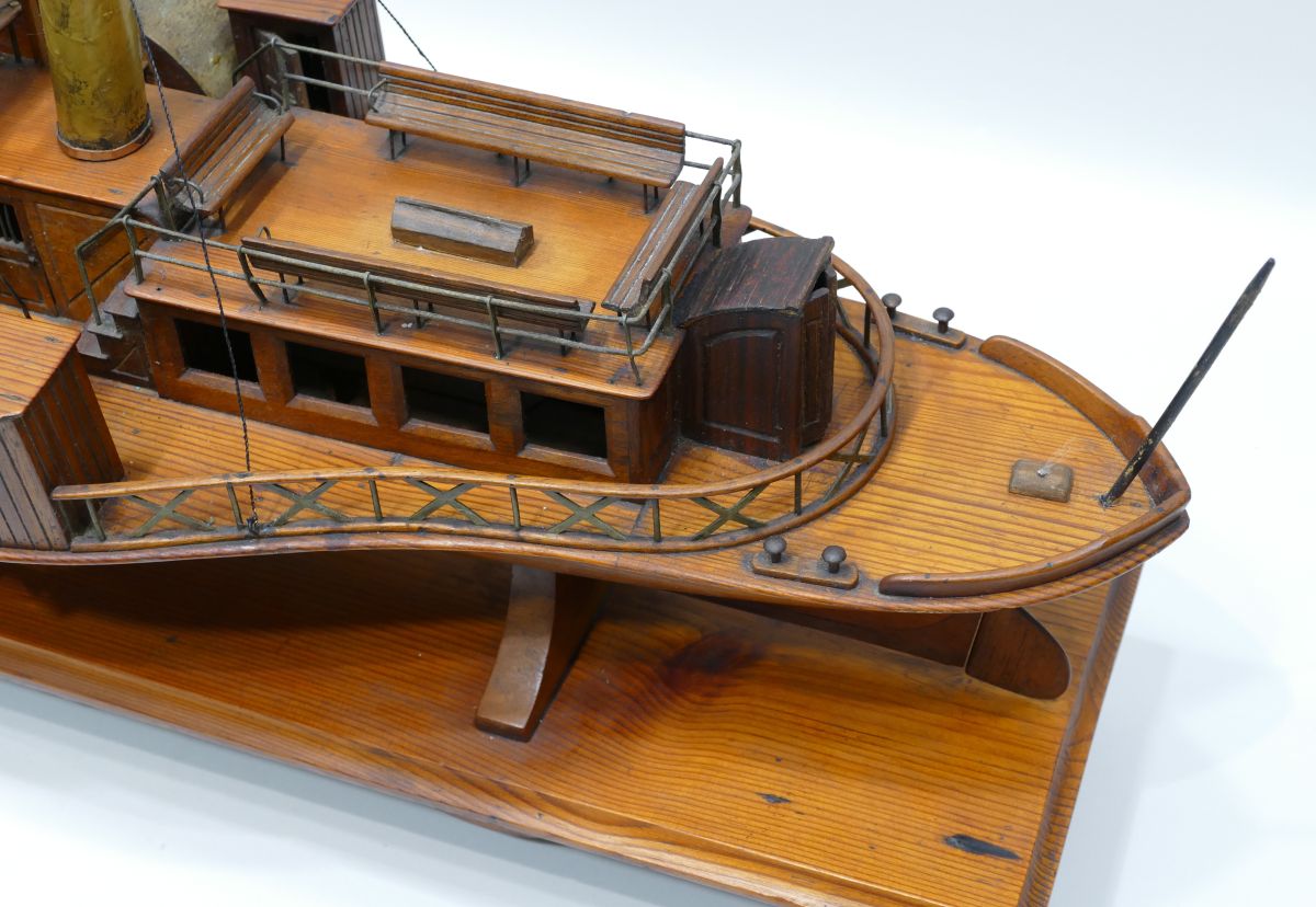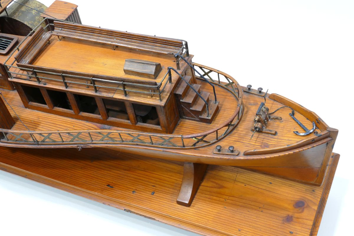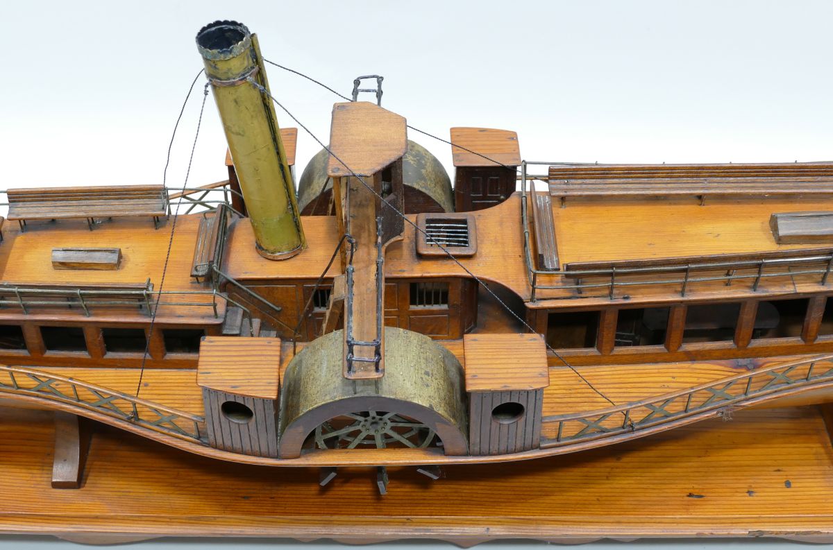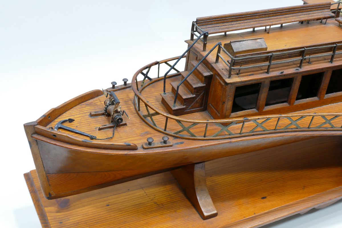 Magnifique maquette de chantier à vapeur à roues à aubes (lacustre) en bois et tôle typique des bateaux qui faisaient les liaisons entre les différentes villes des lacs (Annecy ou Leman). Présence d’une cheminée pour la propulsion à vapeur et de deux espaces pour les passagers : un sur le pont à l’extérieur et un second couvert à l’intérieur du bateau.