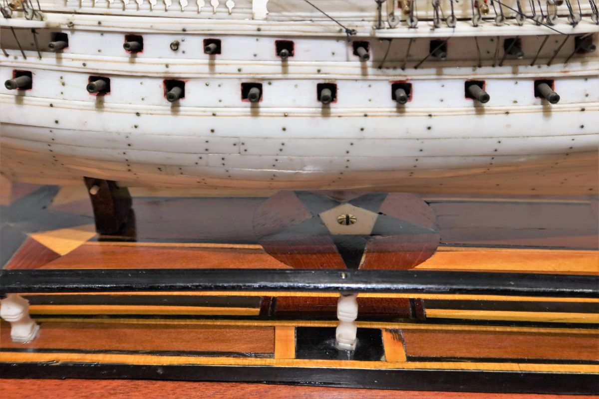 La maquette repose sur un socle en marqueterie de bois de couleurs et avec une balustrade en os et bois teinté noir.