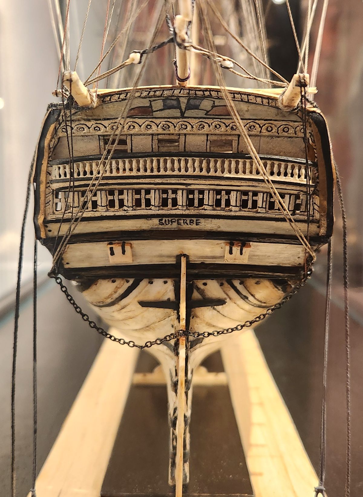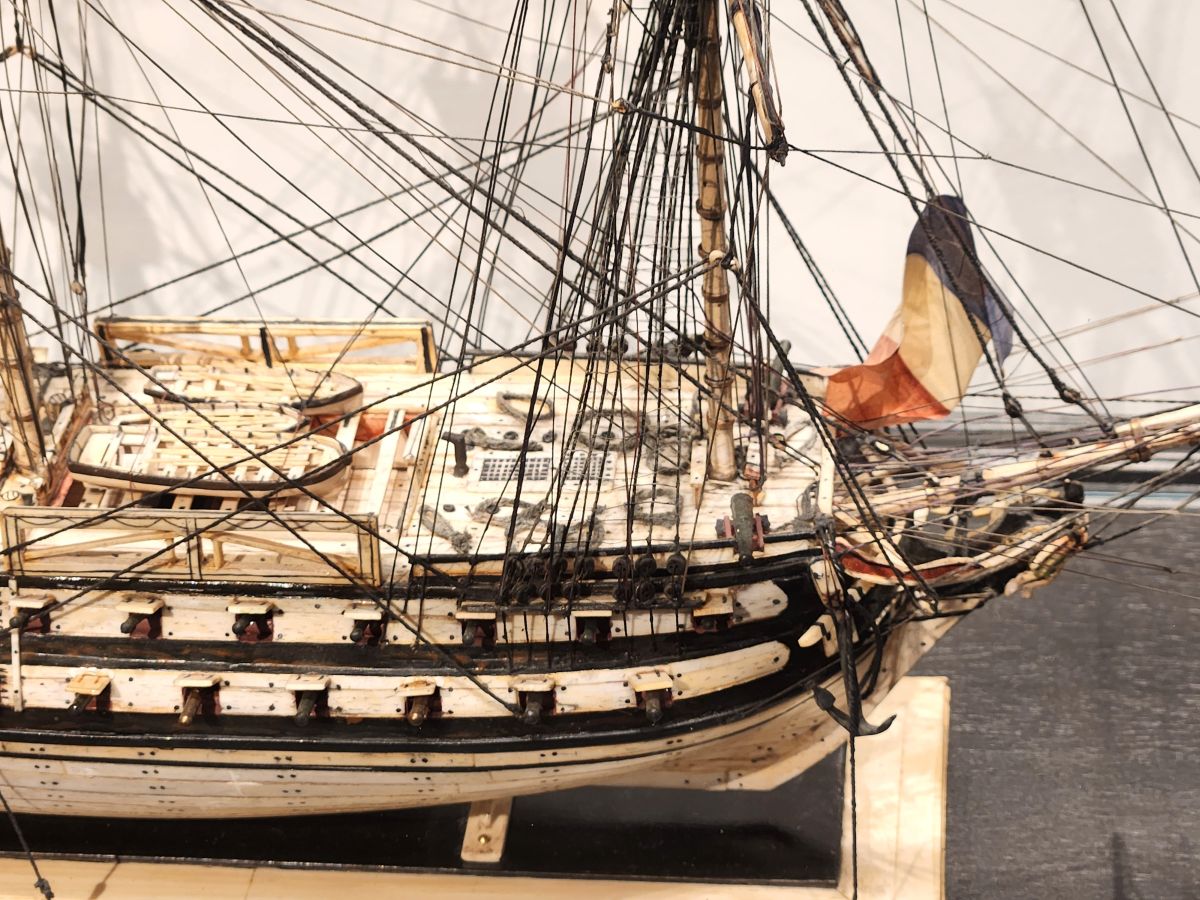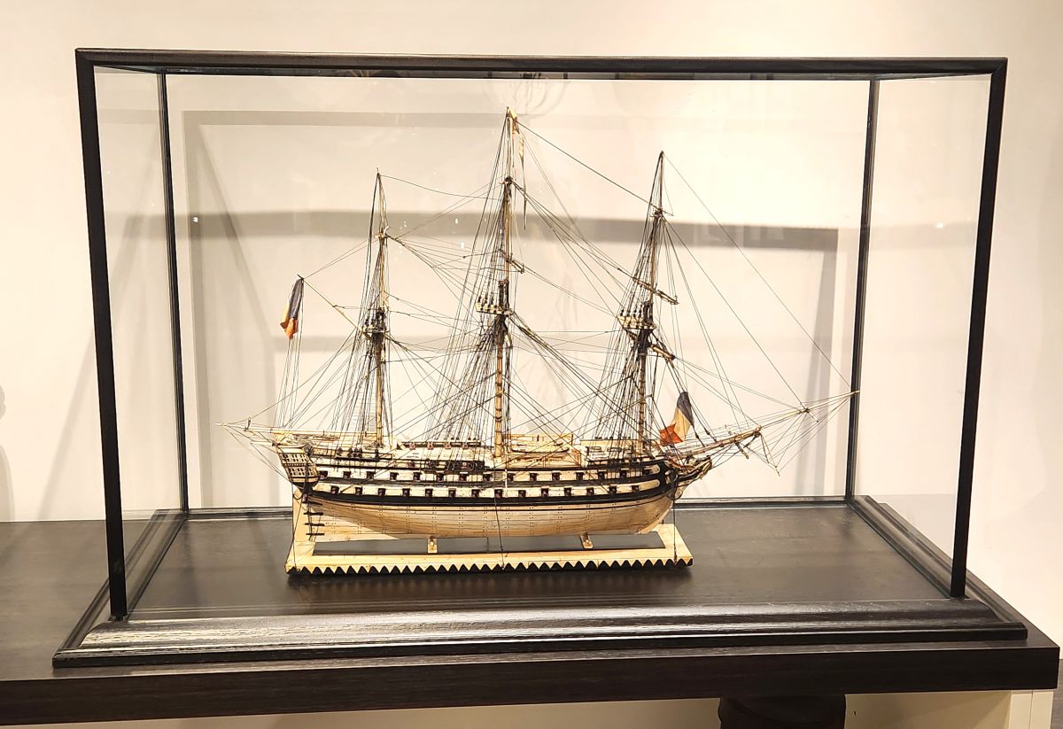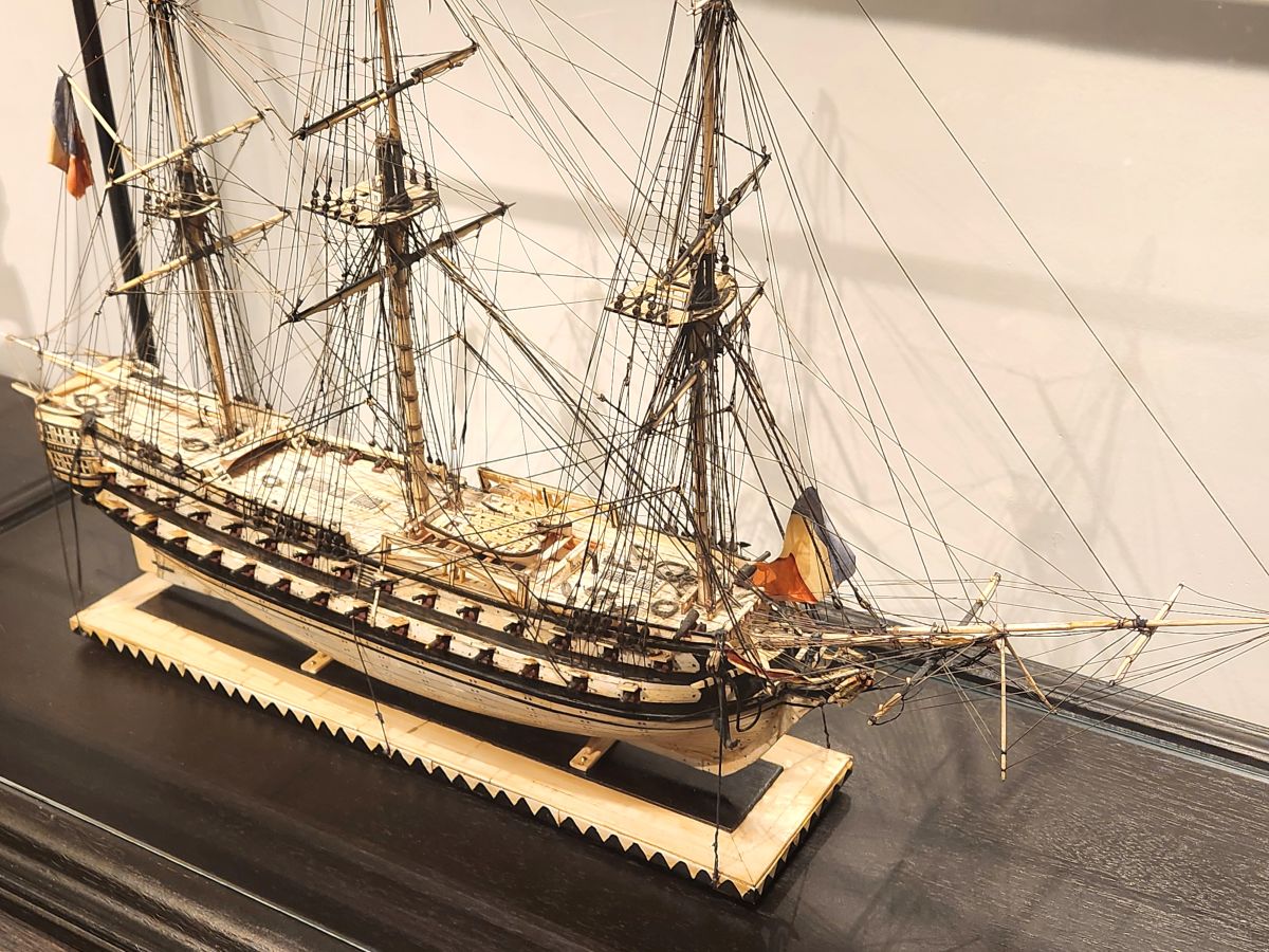 Impressionnante maquette de ponton en os représentant le « Superbe » présentée dans une vitrine avec socle en bois noir ouvragé.