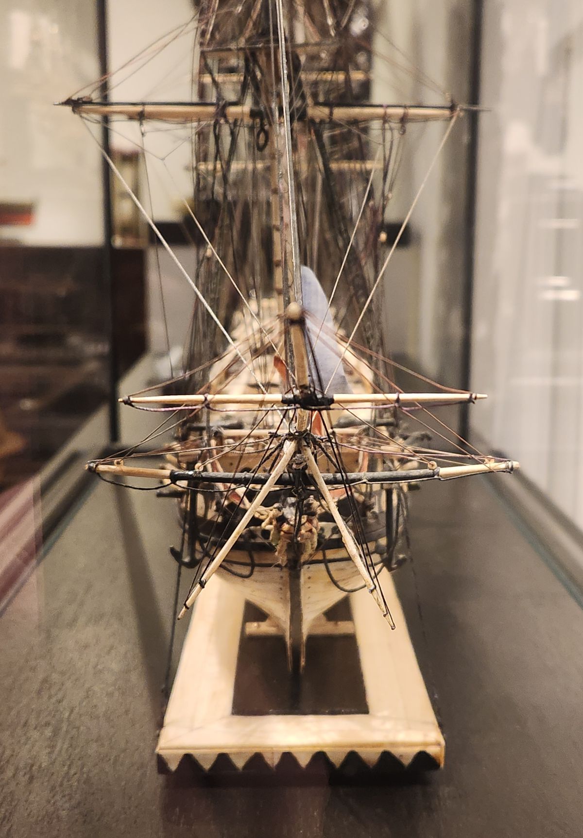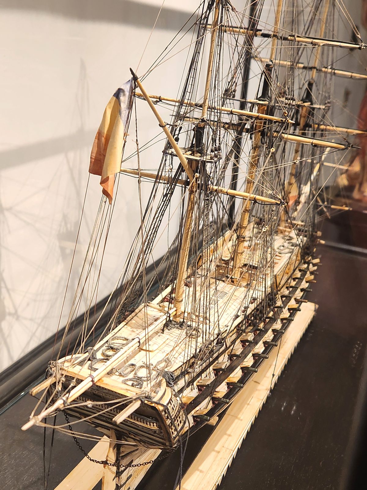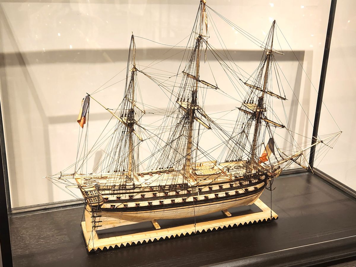 Impressionnante maquette de ponton en os représentant le « Superbe » présentée dans une vitrine avec socle en bois noir ouvragé.