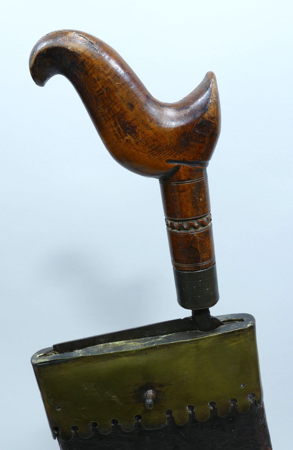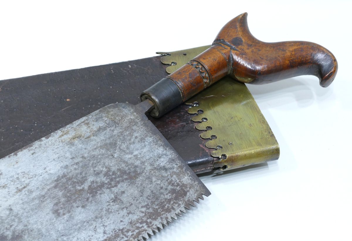 Rare et imposante scie à découper les baleines avec pommeau en bois sculpté en forme de baleine.