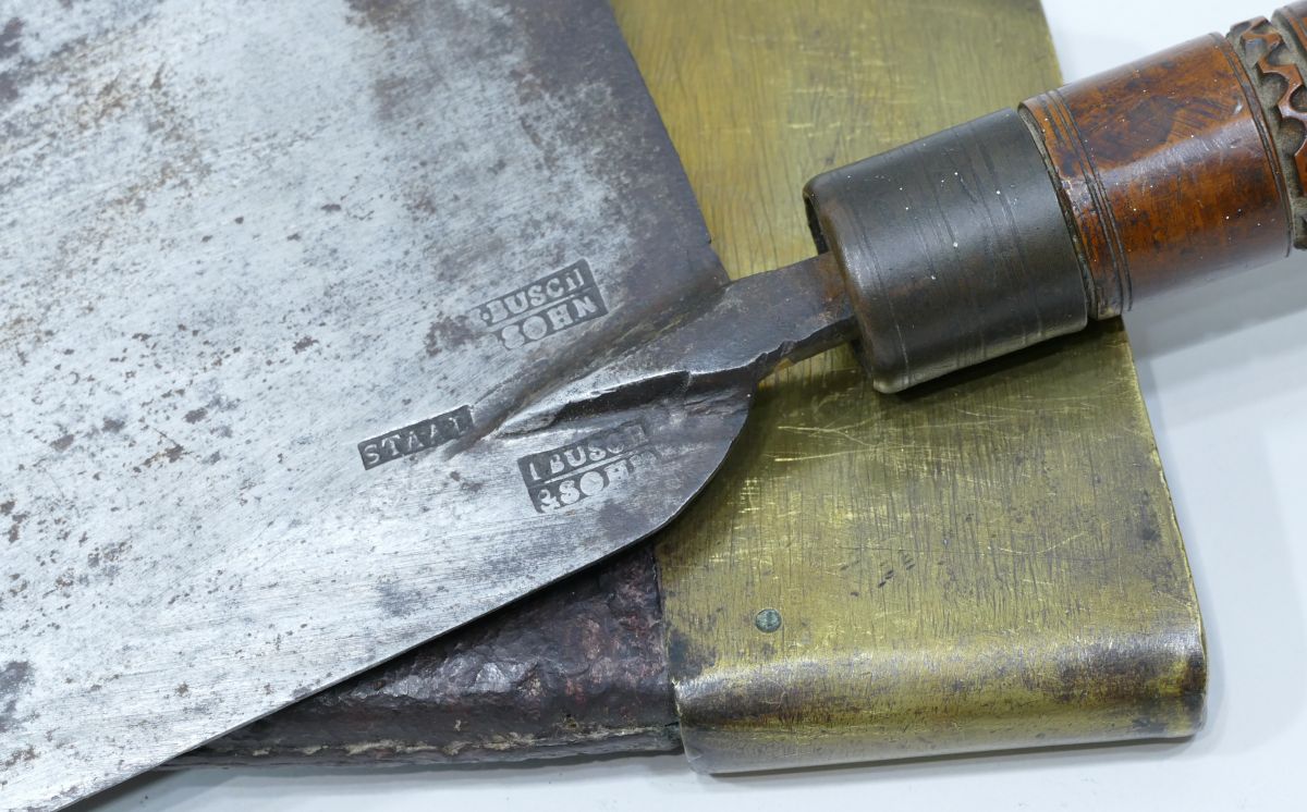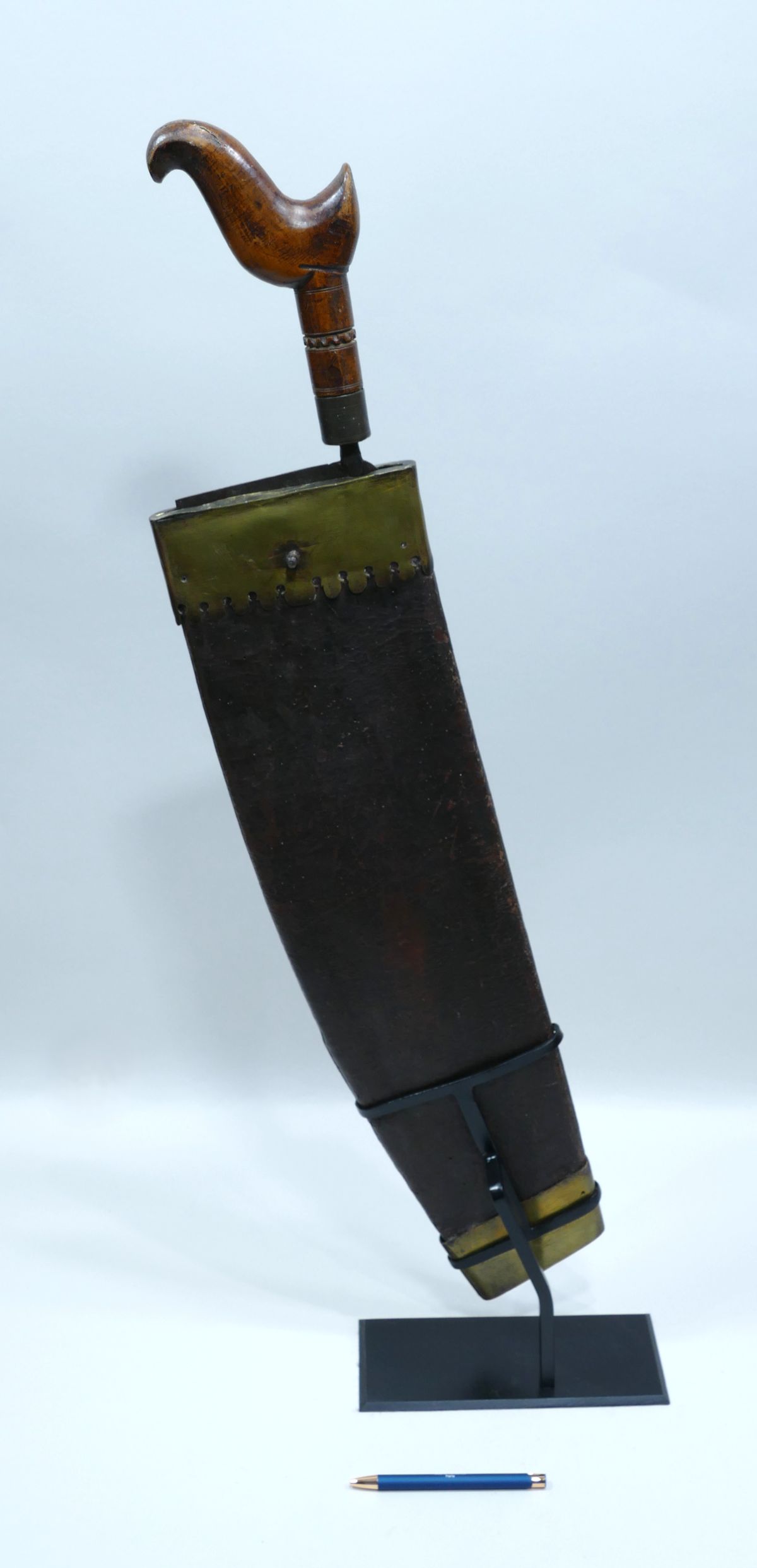 Présentée dans son fourreau d’origine en cuir et laiton.