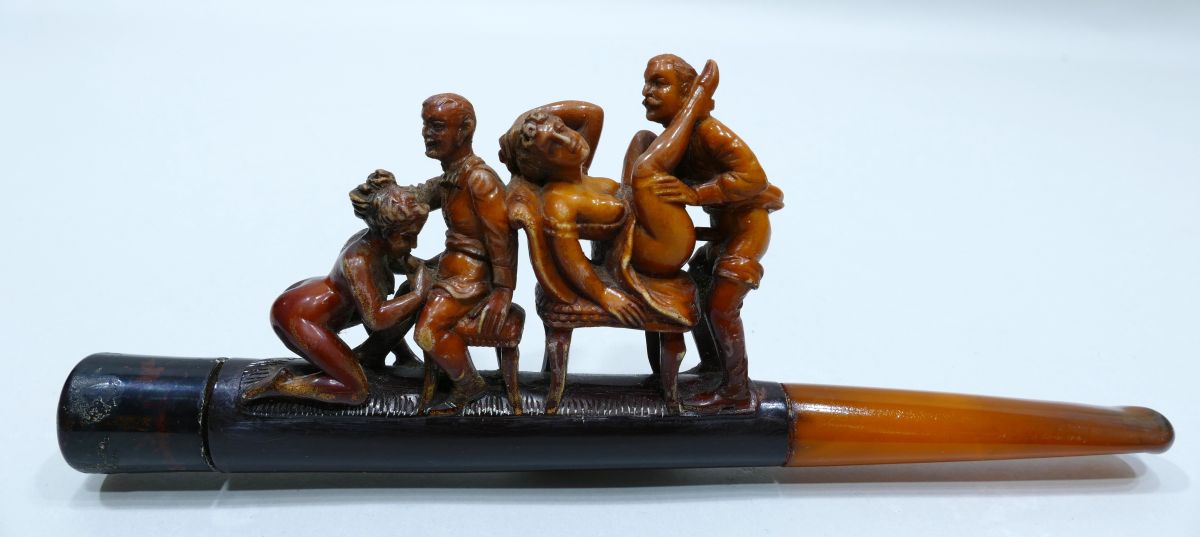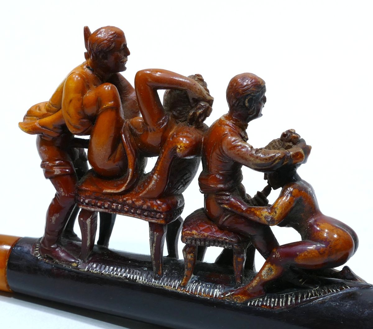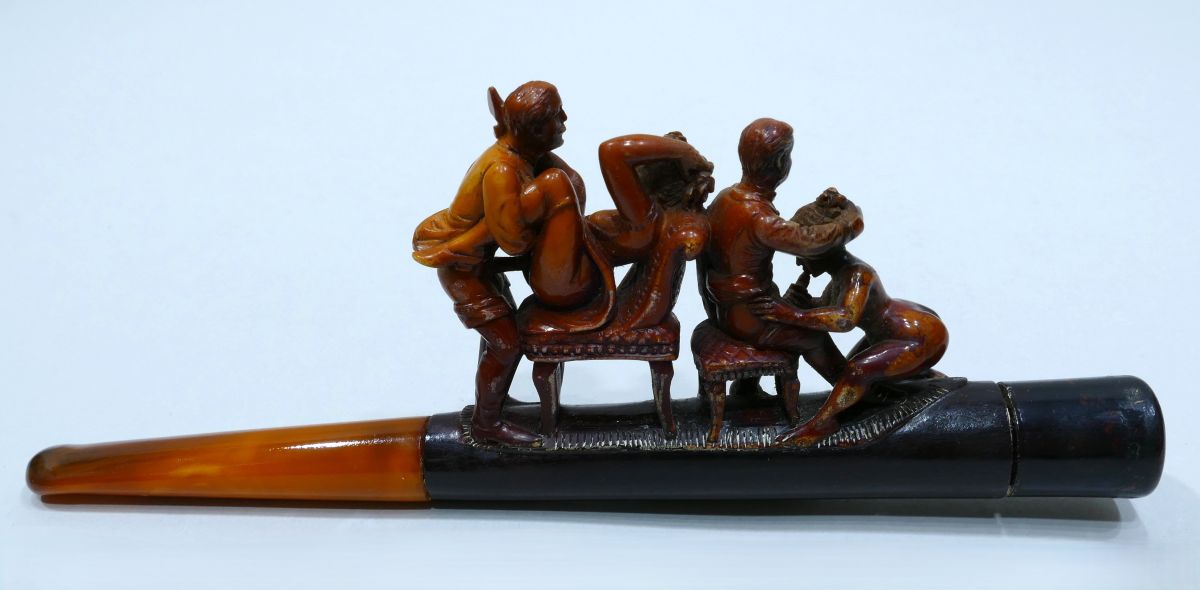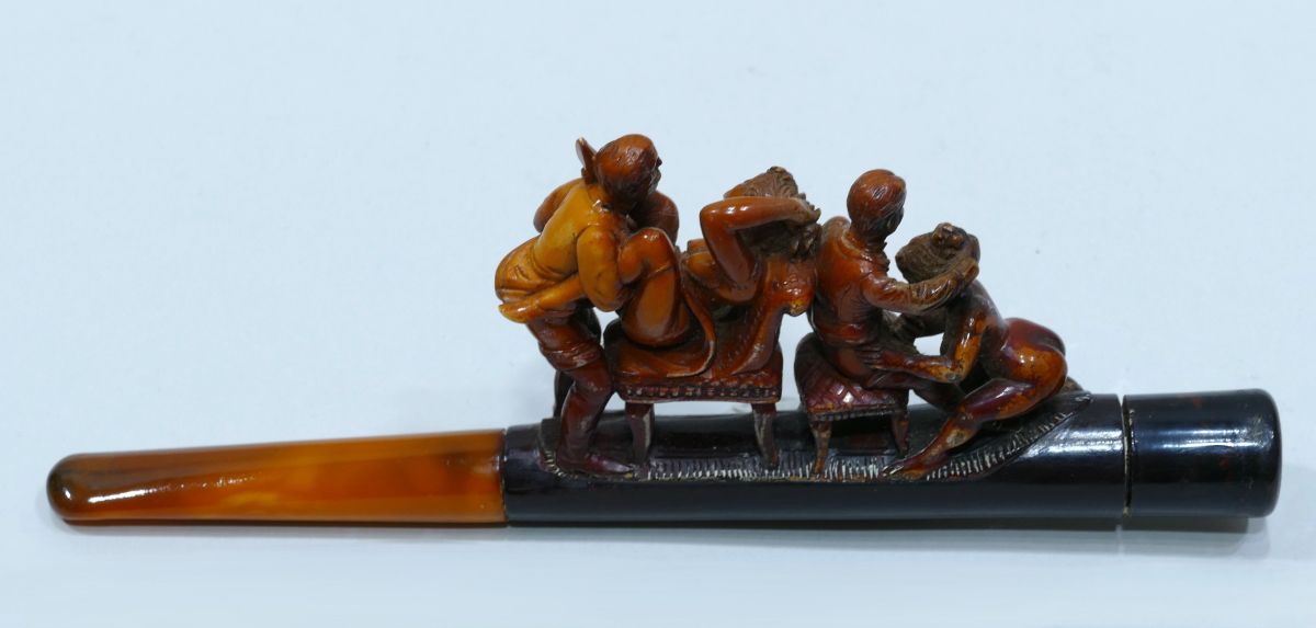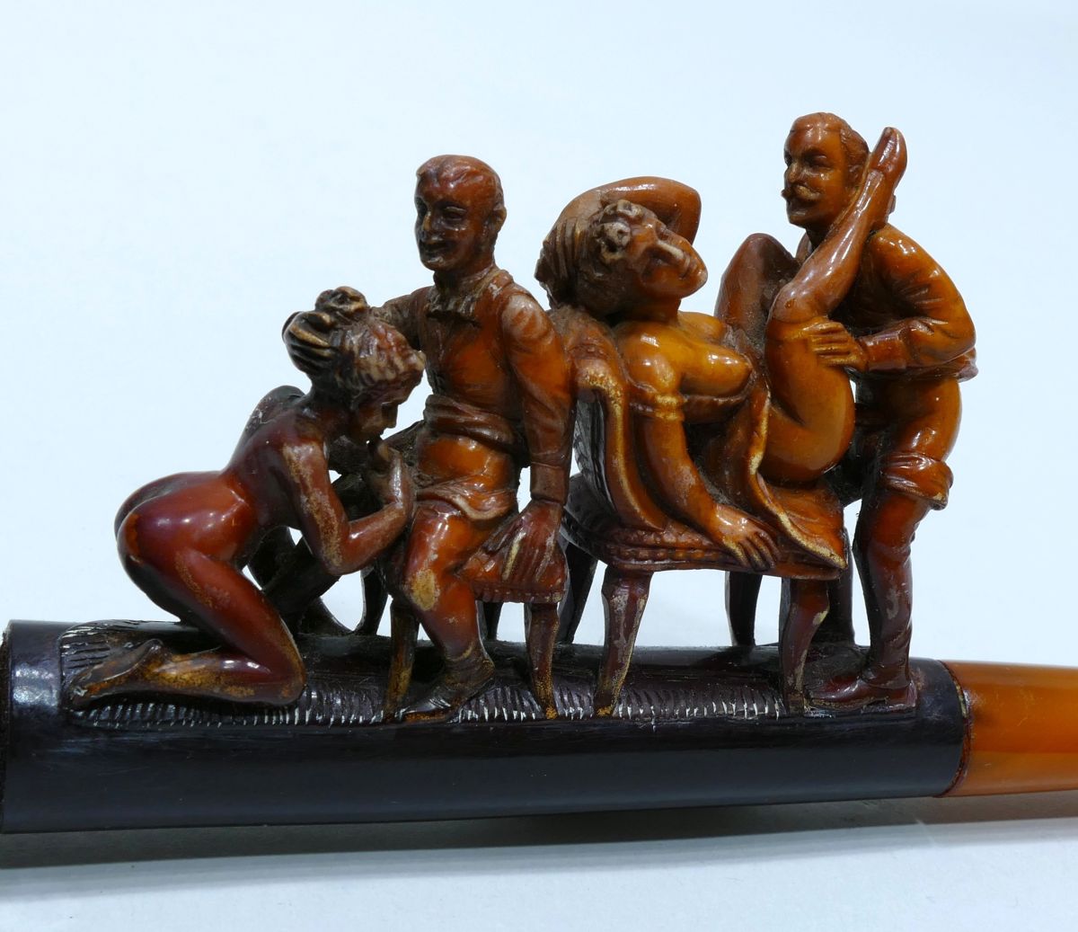Rarissime fume-cigarette érotique en écume de mer représentant deux couples en action dans des positions différentes.