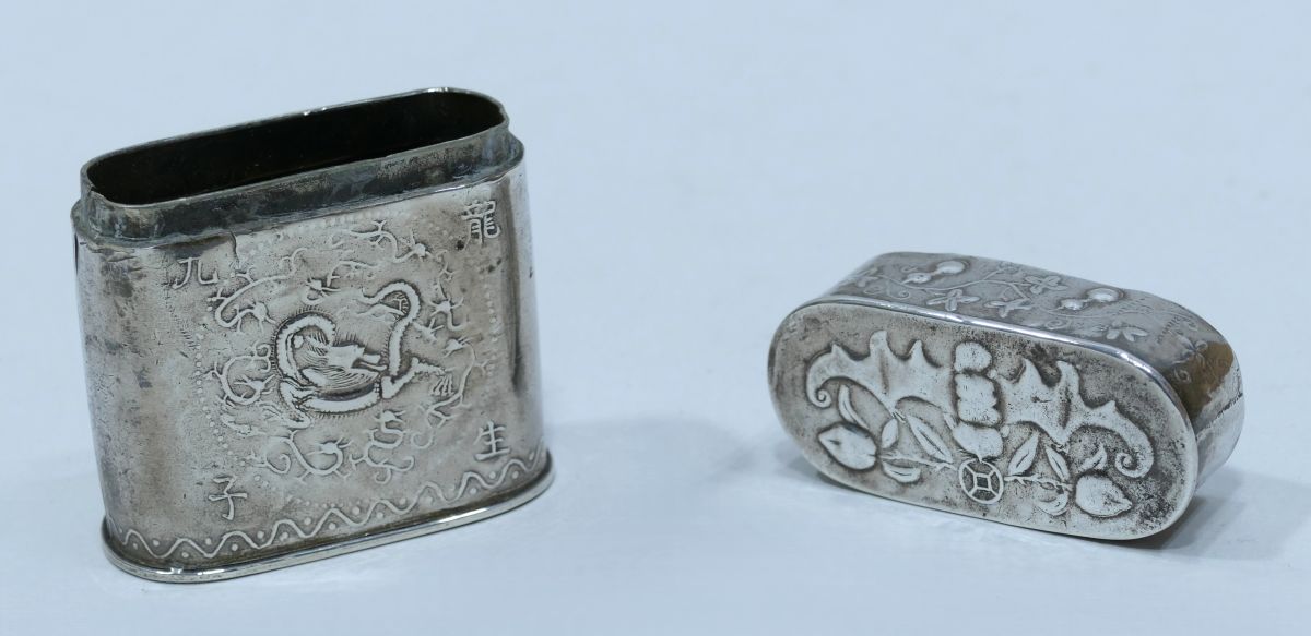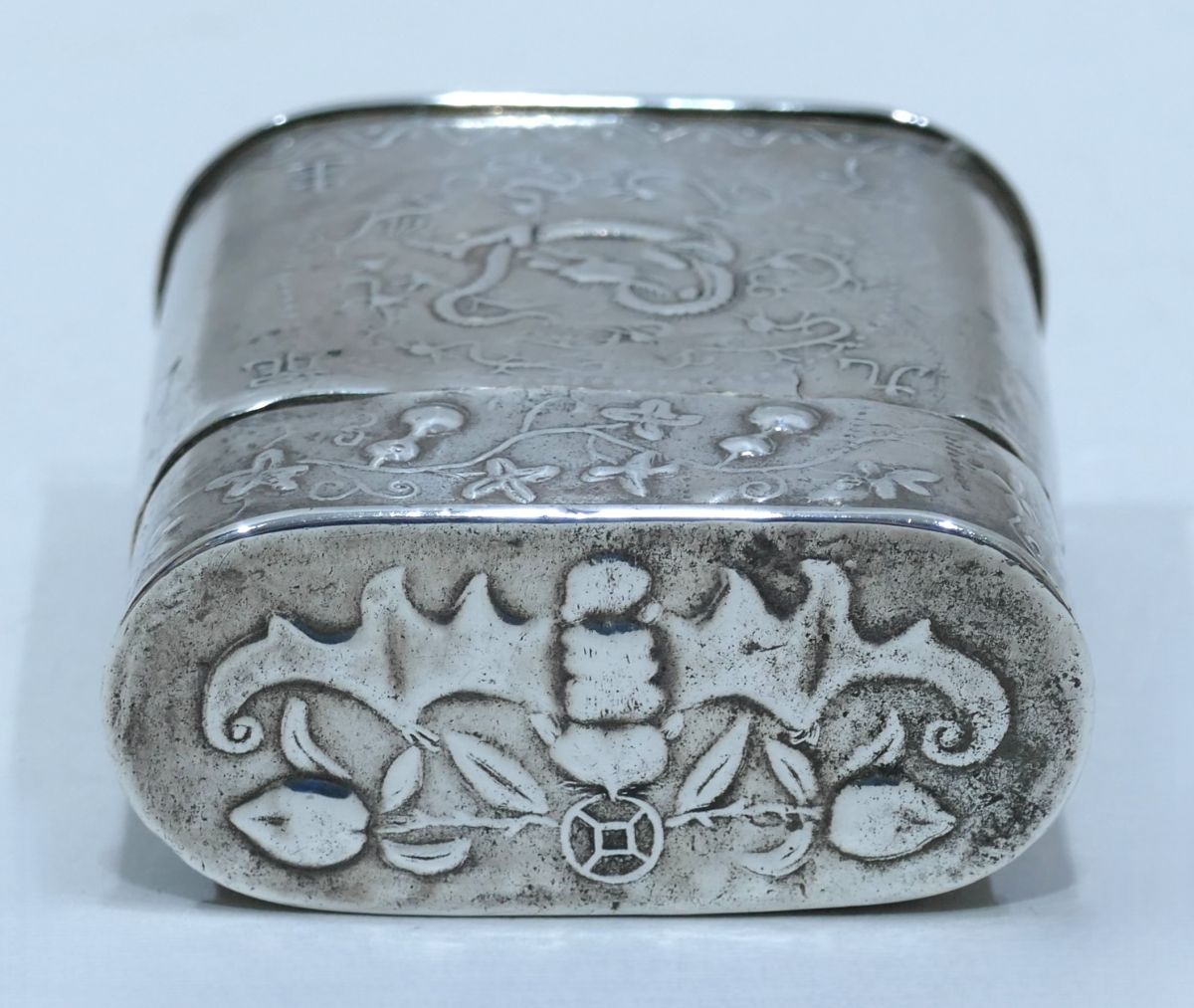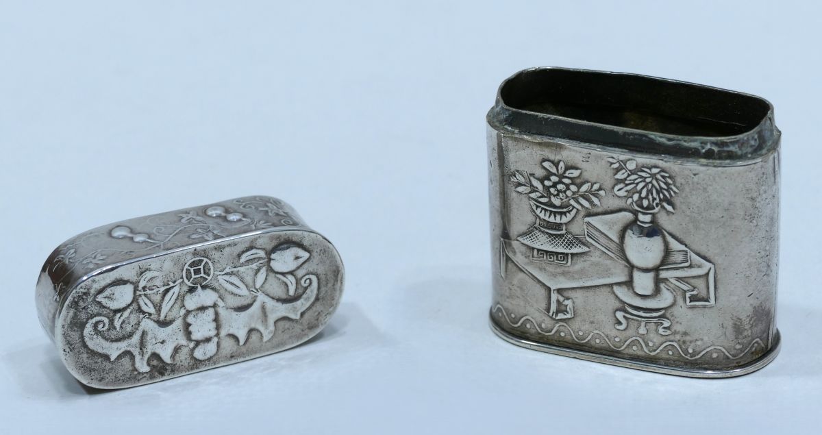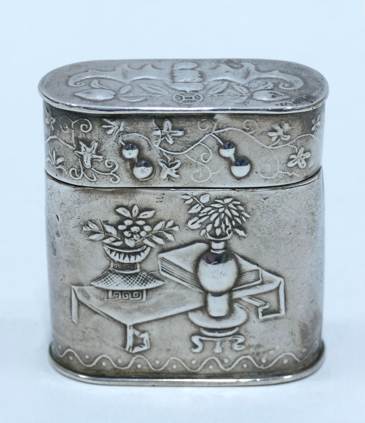 Boite à opium en baitong avec décor d'une chauve-souris et de deux fleurs en opposition sur le dessus de son couvercle, au contour d'une frise florale.