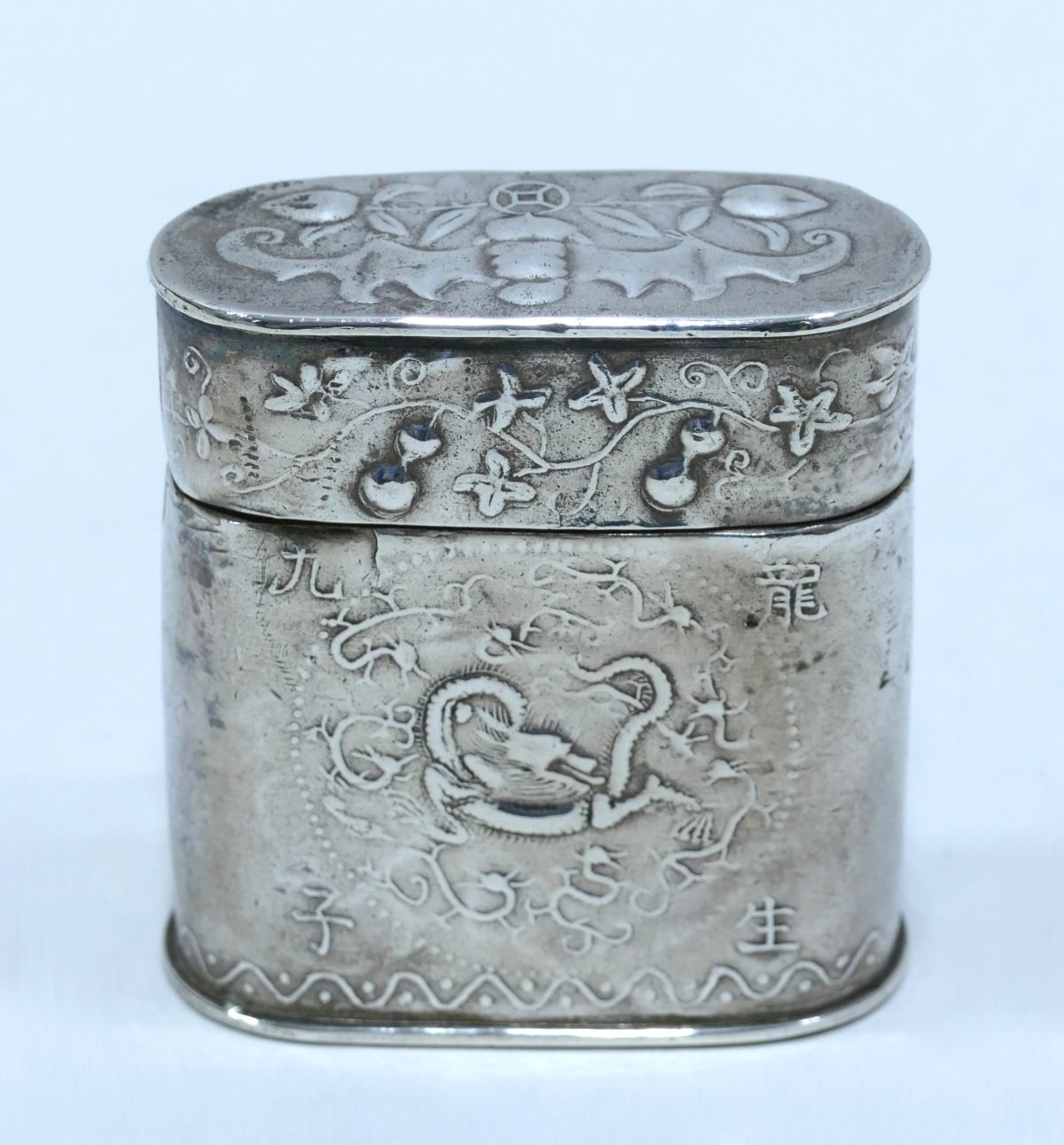 On retrouve sur une face un lit avec deux vases remplis de fleurs posés dessus, et de l'autre un dragon entouré par des signes calligraphiques chinois.