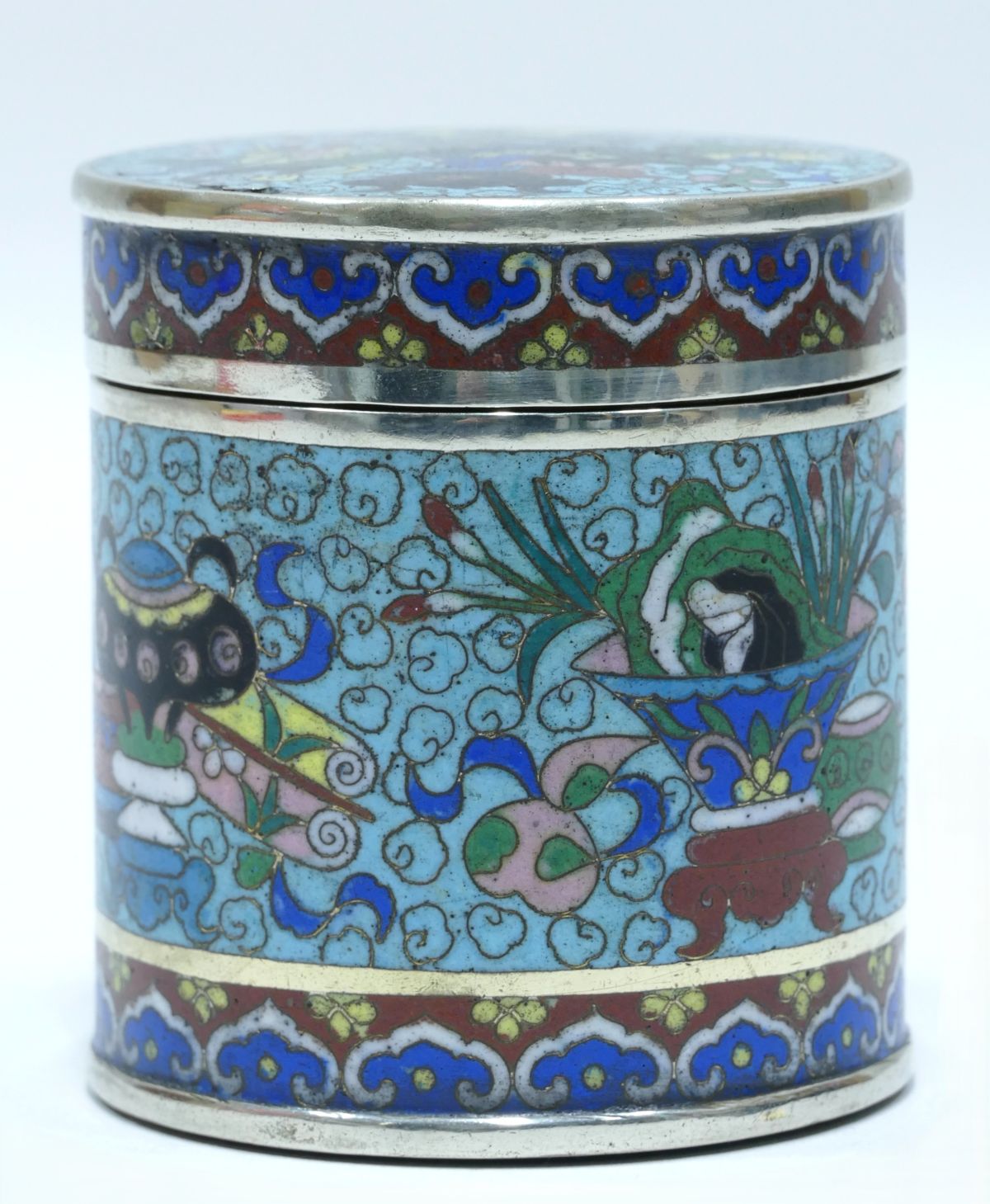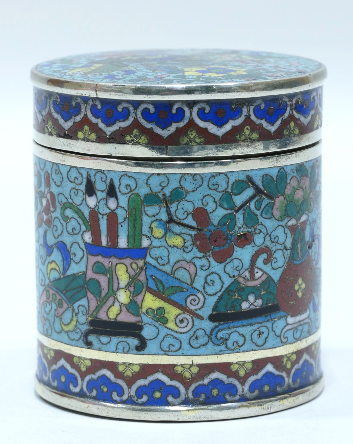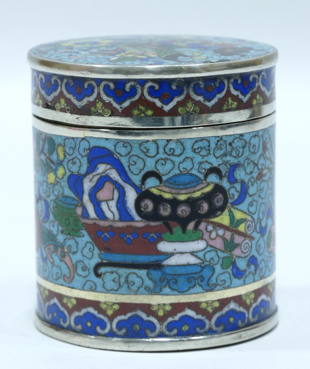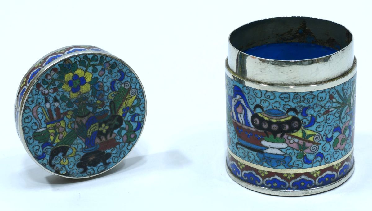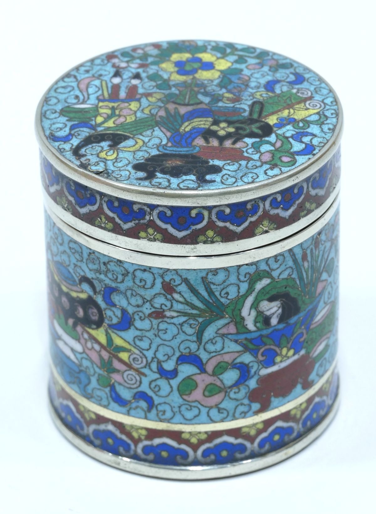 Boite à opium en cloisonné à dominante bleu clair avec décor d’objets de lettré et de fleurs sur le couvercle, en pourtour et à la base.