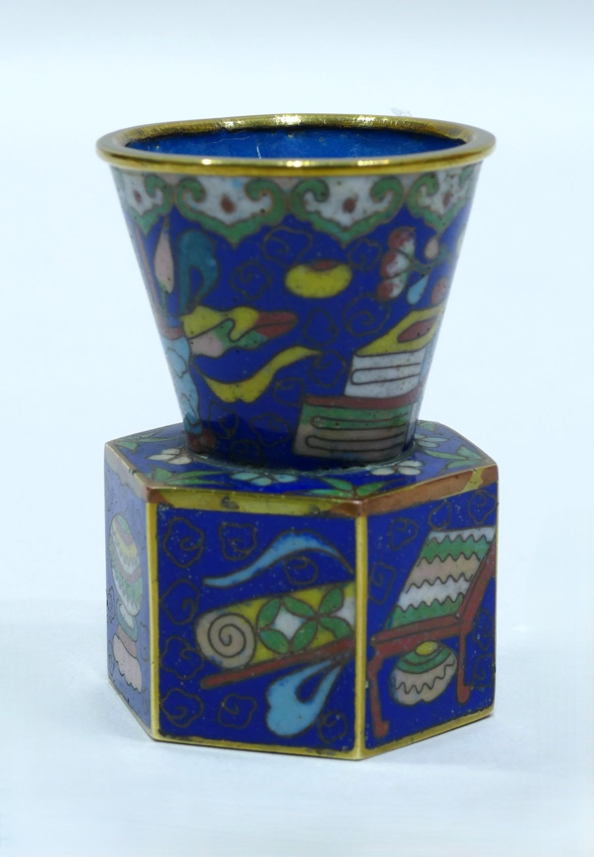 Crachoir à opium en cloisonné à dominante bleu marine avec base hexagonale, l’ensemble à multiples décors d’objets de lettré