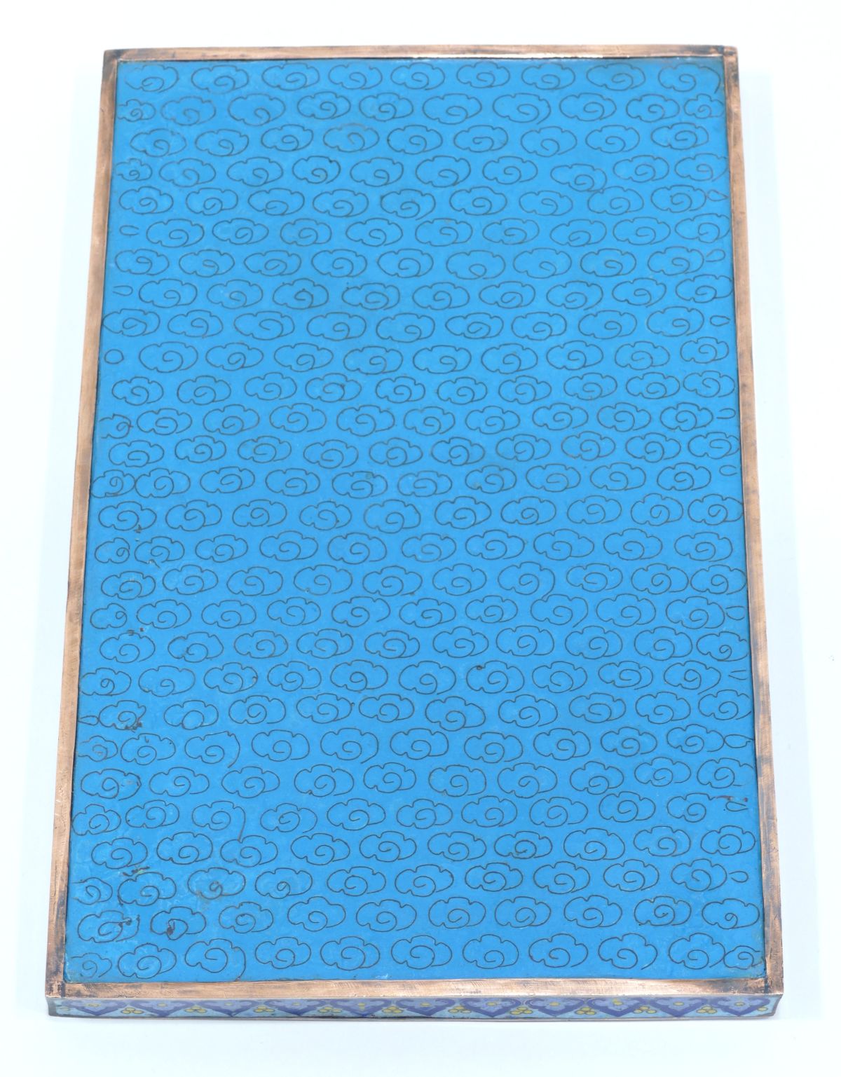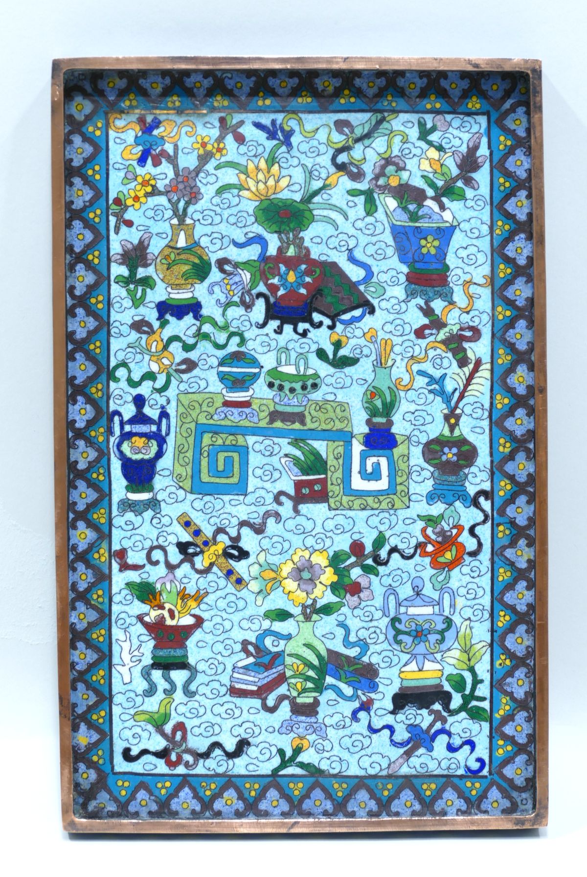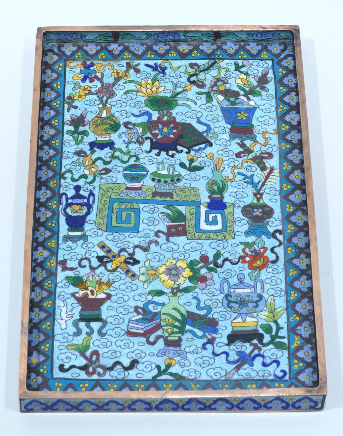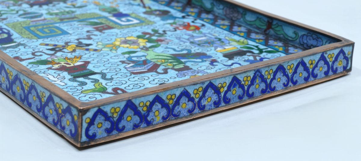 Grand plateau à opium en cloisonné à dominante bleu clair au décor des Cents Antiques.