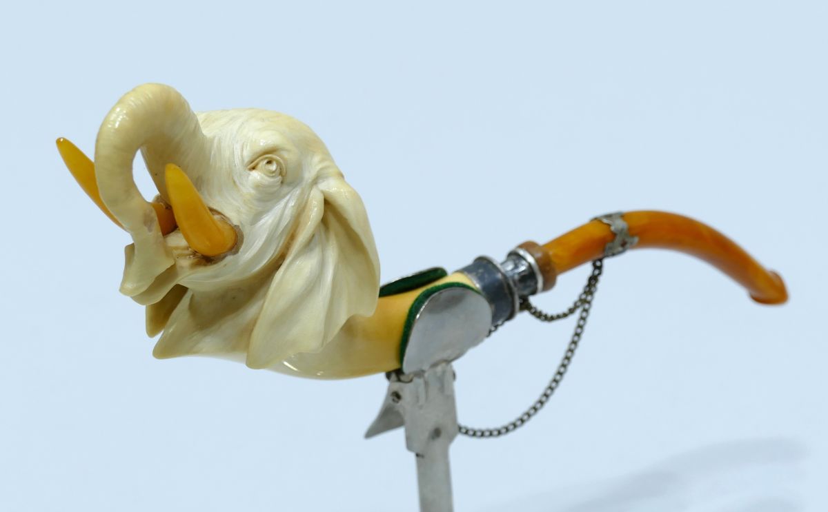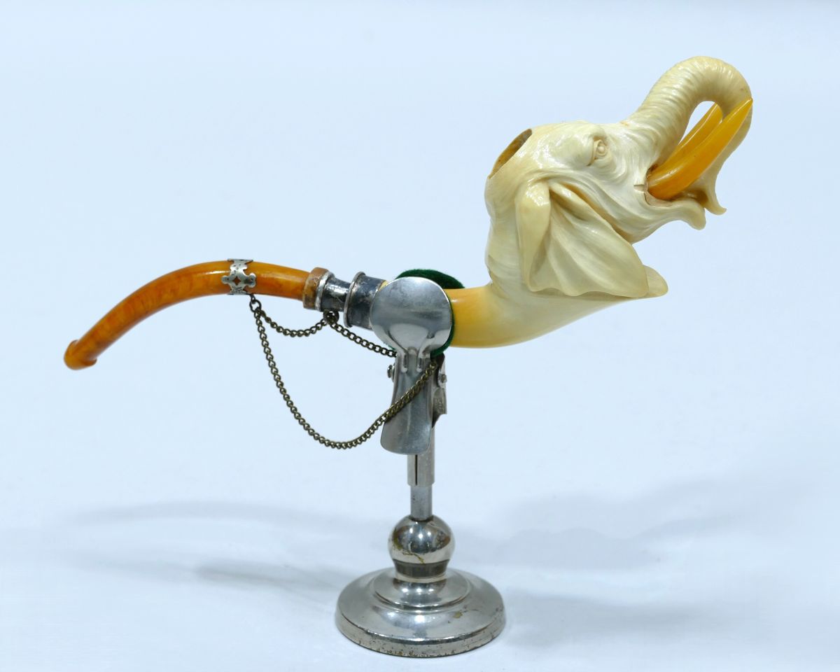Fume-cigare en écume de mer représentant la tête d’un éléphant avec ses défenses en ambre.