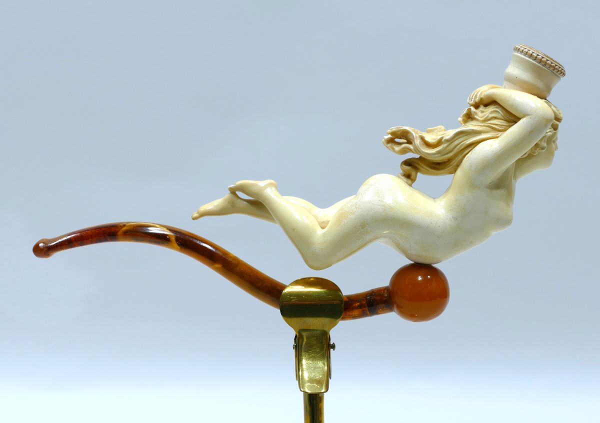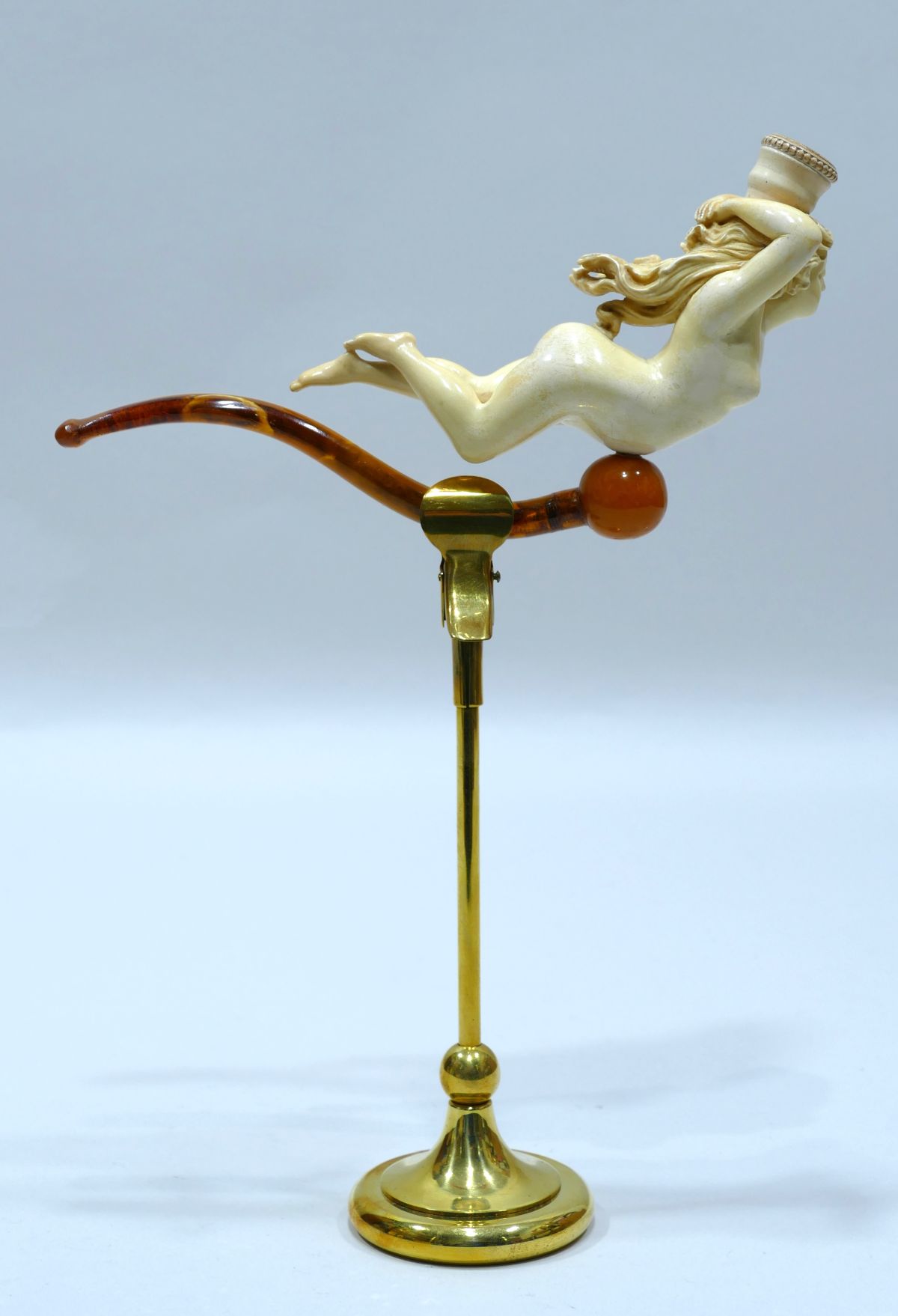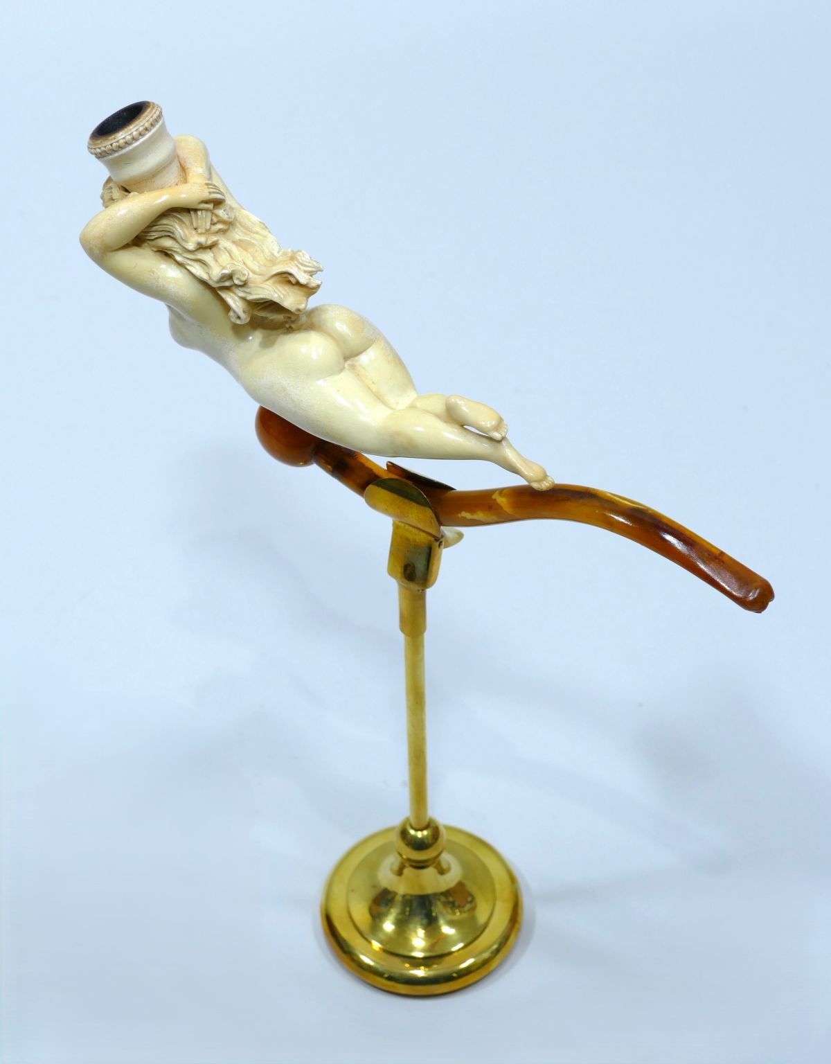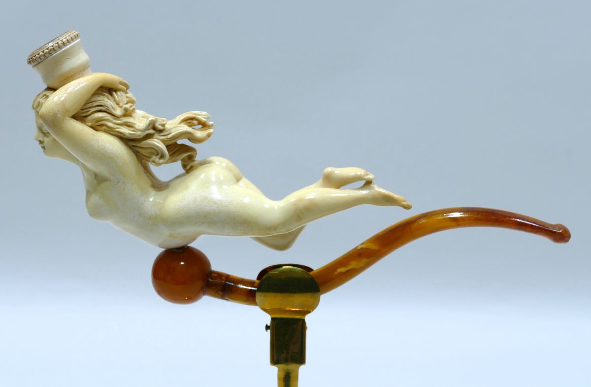 Fume-cigarette en écume de mer représentant une femme allongée nue les cheveux au vent.