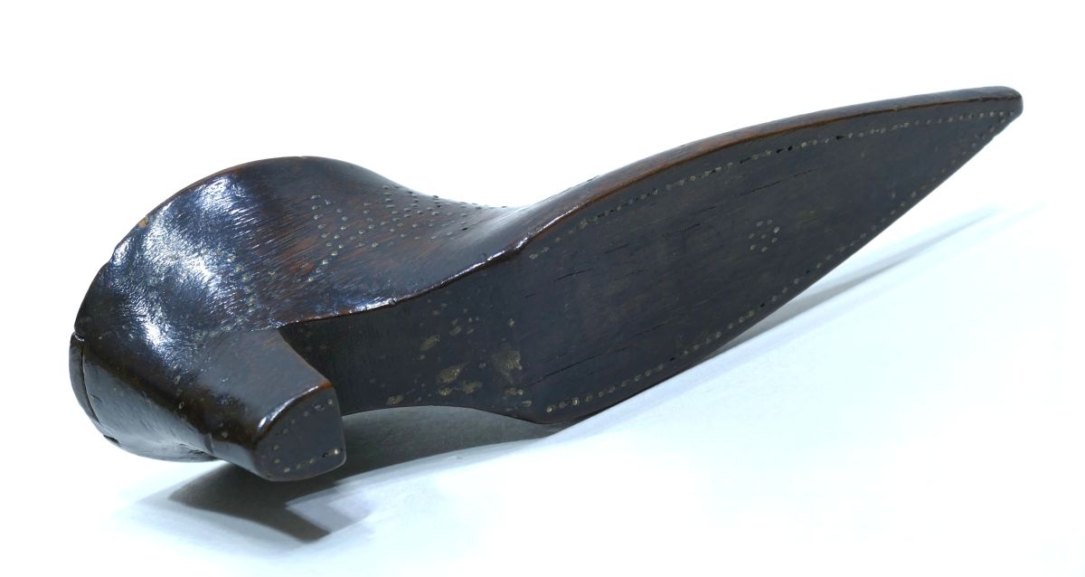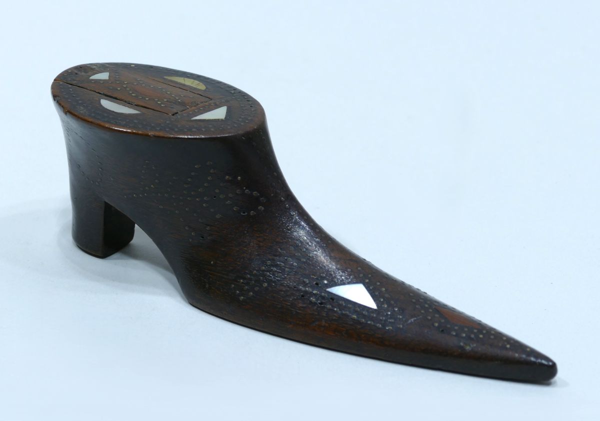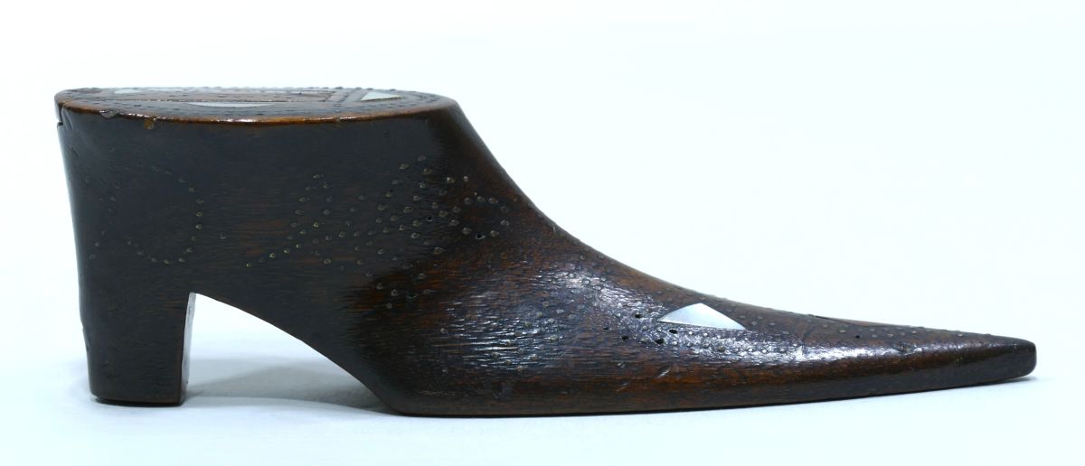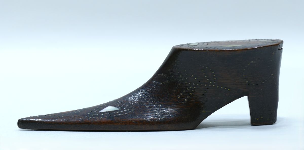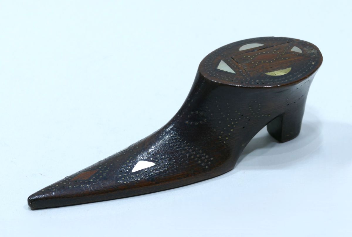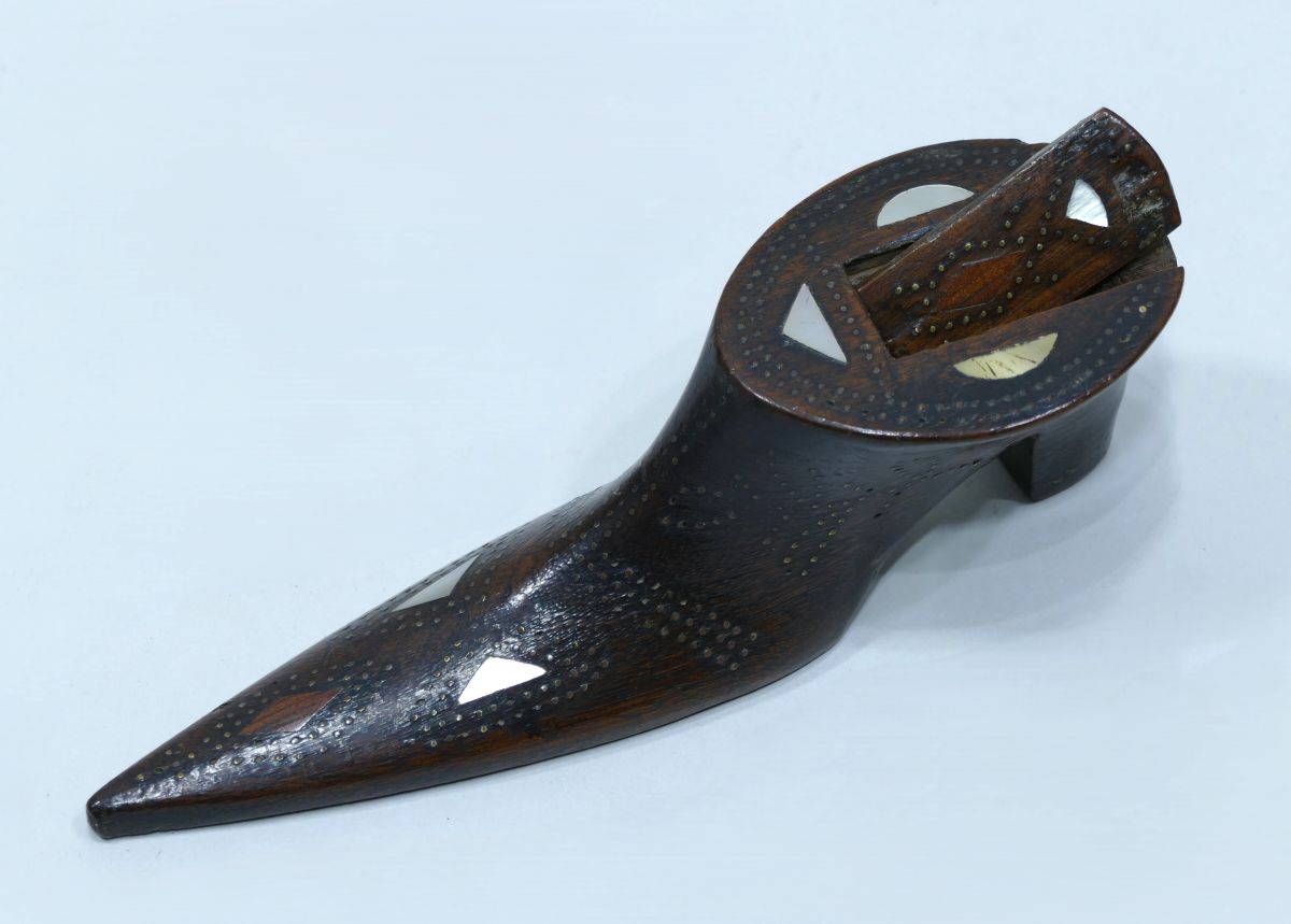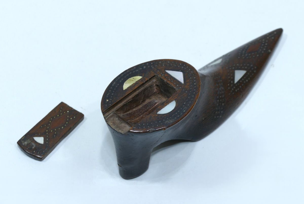 Tabatière en forme de chaussure pointue en bois piqué avec décors de nacre.